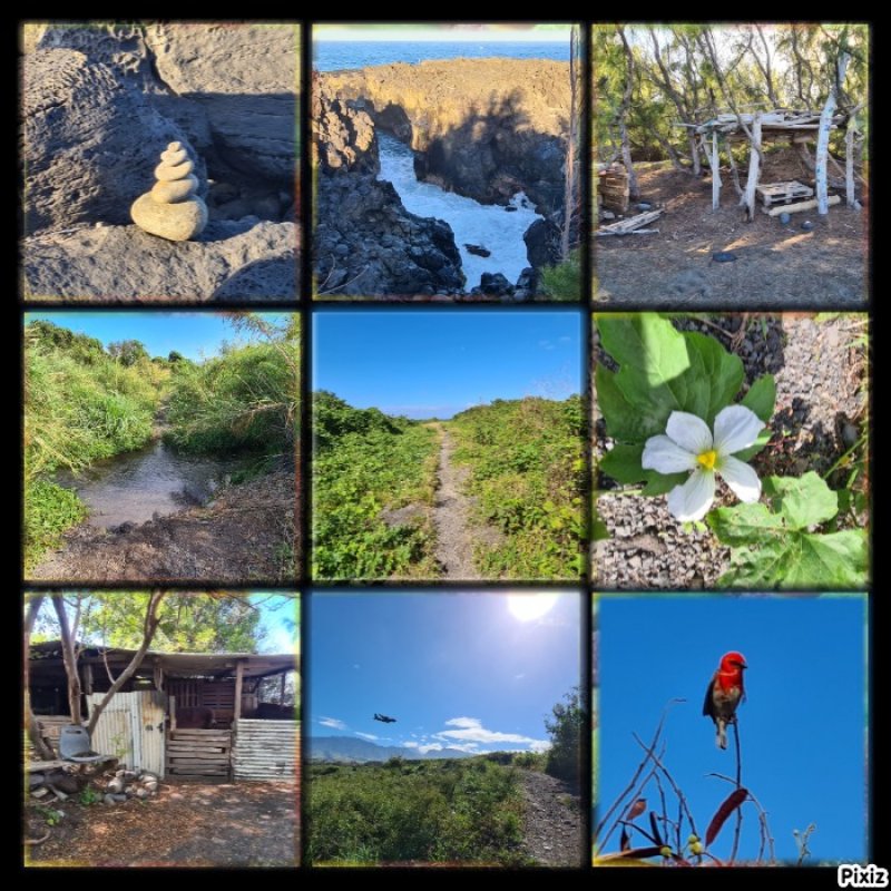 La randonnée débute n’importe où à l’Étang Salé à condition d’être au plus près de la mer. Une petite visite à l'étang envahi de roseaux au centre du village ne prend que quelques minutes (Photo 1). On peut même facilement en effectuer le tour complet. Si on part de la plage il suffit de longer la mer au plus près, de frôler le Bassin Pirogue qui est le petit port du village puis l'ancien Parc à Huitres qui se remarque surtout à marée basse. Sous les filaos, à la sortie du village, emprunter un sentier bien marqué bordé ou encombré de cailloux qui suit la côte par quelques courbes totalement à plat (Photo 2). Si on a le temps, on peut se rapprocher des vagues pour trouver des petits bassins d'eau claire mais la marche sur le basalte acéré peut s'avérer dangereuse. De loin en loin, de belles pancartes indiquent les itinéraires qui passent par ce sentier et qui font de 2 à 13 kilomètres (Photo 3). Le sentier passe au plus près de la côte bordée de roches noires, de filaos vivants ou morts. Plus loin, on traverse une belle portion sableuse où poussent quelques filaos autour d'un grand parking très fréquenté. Une rambarde sur la droite et des bruits sourds de vagues qui se brisent indiquent l’arrivée au Gouffre de l’Étang Salé. La mer est si violente dans cette faille taillée dans le basalte qu’une simple chute peut faire craindre le pire (Photo 4). De multiples croix fleuries viennent confirmer que certaines personnes désespérées connaissent ce lieu faisant régulièrement l’actualité. La zone abrite également des aires de pique-nique pour les personnes qui ne craignent pas trop la chaleur. Le Bassin Bleu peut également se rejoindre mais en marchant sur les basaltes coupants. Le sentier se poursuit, bordé de gros cailloux en haut de la falaise qui entoure la Roche des Oiseaux. Par forte mer, l'écume peut monter facilement à dix mètres de hauteur. Les laves découpées par l'érosion ou les arbres morts créent souvent de belles natures mortes (Photo 5). Côté montagne, on profite parfois de panoramas sur les Makes ou les hauts vers les Bénares (Photo 6). Vers la mer, la vue porte jusqu’à la Pointe au Sel de Saint-Leu et on peut guetter le souffle des baleines en hiver ou apercevoir les pêcheurs à la ligne (Photo 7). Les filaos, rabougris et penchés dans le sens du vent tentent de pousser comme ils le peuvent sur cette roche pauvre et arrosée d’eau salée à longueur d’année. Les roches noires recouvrent par moment la totalité du parcours (Photo 8). Tout près, une grande surface du littoral a été recouverte de dizaines des cairns du Vortex Énergétique ou d'empilements de galets plats à travers lesquels serpente le sentier, parfois étroit. Il ne reste plus beaucoup de galets pour continuer l'œuvre qui ôte cependant du charme au côté naturel du littoral (Photo 9). A la fin de cette portion originale débute une longue partie dans le sable fin des dunes qui entourent l’Étang Salé jusqu'à l'étang du Gol. Le sentier, bordé de galets qui le délimitent, s’éloigne du littoral pour un temps mais le retrouve rapidement (Photo 10). Poursuivre sous les filaos en direction de Saint-Pierre pour remarquer que ces pauvres arbres ne réussissent toujours pas à se redresser. Quelques cairns de deux mètres de hauteur ont été érigés sur le bord du parcours (Photo 11). Le sentier se rapproche par moment assez près du bord de mer (Photo 12). Le sable atteint souvent plusieurs dizaines de cm d'épaisseur et il pénètre facilement dans les chaussures (Photo 13). On alterne sable, galets ou roches avant d’arriver à la Ravine Sèche qui se franchit facilement (Photo 14). S'il a beaucoup plu, poursuivre sur les galets pour contourner l'estuaire embourbé ou immergé plutôt que de patauger dans la boue. La mer, très proche, se précipite sur d’énormes tas de galets accumulés par les vagues. De l’autre côté de la ravine, on récupère pour une longue distance un très large sentier recouvert de sable et bordé de galets, de nouveaux cairns ou des arrangements élaborés comme décorations (Photo 15). Jusqu’au pont détruit de l’Étang du Gol, on peut choisir entre plusieurs itinéraires en empruntant ce large sentier, la piste cavalière ou en marchant sur le bord de la falaise qui s’effrite doucement avec les vagues et le temps. Ne pas manquer, avant d'arriver à Bel Air de bifurquer à gauche pour rejoindre les rives de l'étang du Gol et profiter des paysages ou y voir des oiseaux migrateurs (Photo 16). A la fin de l’étang, traverser le petit barrage naturel de galets qui le sépare de l’Océan et longer la mer jusqu’à la sortie du village ou, plus simplement, traverser le parking. Un court écart de 100 mètres amène à la fin de la Rue Valmy pour y admirer un petit temple tamoul très coloré. Bel air est un petit village de pêcheurs qui se traverse facilement en empruntant le Boulevard du Front de Mer puis la Rue Lambert ou en longeant le rivage recouvert de galets (Photo 17). Depuis la Roche des Oiseaux, on n'a guère quitté les galets qui roulent bruyamment, poussés par les vagues (Photo 18). On rejoint très rapidement la partie la moins agréable de cette sortie pour la traversée du large delta de la Rivière Saint-Étienne. Après la dernière ruelle et un dépôt d'engins de terrassement, on débute la traversée par l'ancienne piste encore bien visible, surtout en raison des tas d'immondices qui y sont déposés. Le premier gué arrive très vite. La piste a été défoncée par les engins pour la faire disparaître et la végétation a tendance à la dévorer rapidement jusqu'au prochain cyclone. Elle se devine le plus souvent mais il faut suivre quelques cairns dans les portions de galets (Photo 19). Impossible de franchir les gués sans se mouiller à moins d'être un champion du saut en longueur (Photo 20). Les désagréments cessent en arrivant au pied de la grand