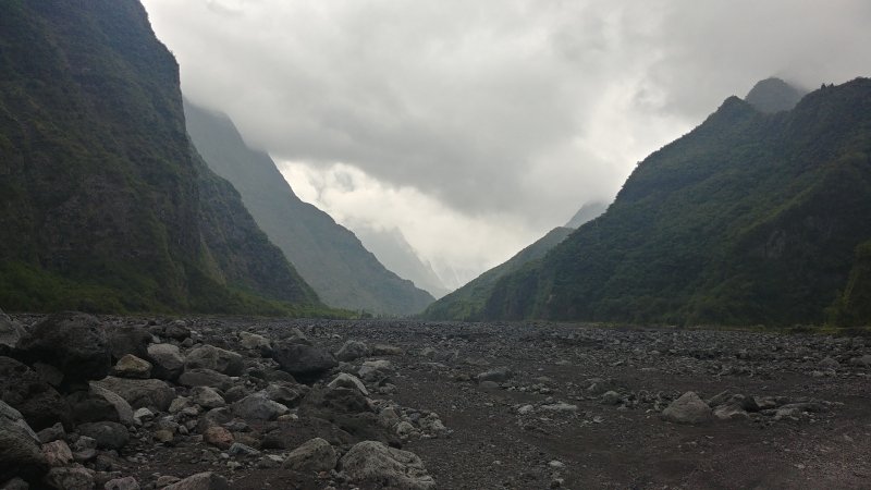 Nous sommes partis samedi du Nez de Bœuf et avons fait dimanche la partie Roche Plate - Grand Coude. RAS dans la rivière des Remparts, dont le lit a beaucoup changé depuis mon dernier passage il y quelques années. Ça devait être dantesque quand on voit les quantités de galets amoncelés, déplacés, ou les éboulis. Il y a même encore de l'eau qui coule sur la piste, ce qui laisse imaginer les quantités tombées ces derniers mois.
