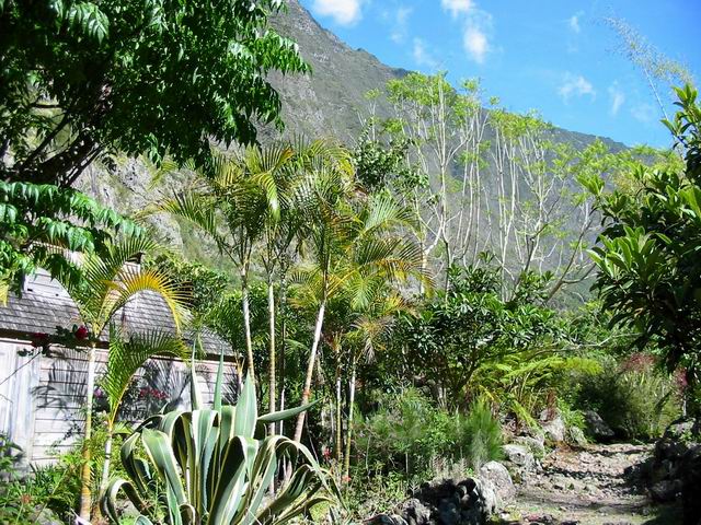 La randonnée débute au classique parking situé à 200 m de l'église de Grand Coude qu'on peut visiter avant de partir s'il n'y a pas d'office (Photo 1). Rejoindre rapidement le rempart en bordure de prairies avec vues sur le Morne Langevin (Photo 2). Au lever du soleil, le morne offre toujours un agréable spectacle (Photo 3). Il est également possible de partir du village par le Chemin de l'Aventure (sic), par la piste qui relie directement le départ du Sentier Dimitile mais il est plus difficile de trouver un emplacement de stationnement. Longer le rempart vers le sud sur un sentier herbeux bordé de hautes cannes fourragères, de bringeliers et surtout de beaucoup de vigne marronne qui empêche souvent des points de vue (Photo 4). Ne pas partir sans se régaler du spectacle du panorama situé en aval de la Rivière des Remparts qu'on rejoindra dans une heure. Juste en face, la muraille infranchissable du Piton de la Mare, issu de l'effondrement de la caldeira de la Rivière des Remparts ne comporte aucun sentier (Photo 5). Le sentier plonge immédiatement dans la forêt de bois de couleurs pour descendre d'une cinquantaine de mètres par des lacets courts et déjà abrupts. Puis on chemine à plat ou en très douce descente sur 200 mètres avant d'attaquer la véritable plongée vers les galets du fond de la rivière. Heureusement, quelques échelles éviteront des glissades lors des passages délicats (Photo 6). Le sentier est très raide mais surtout presque rectiligne. Plus de lacets pour reposer un peu sur les 450 mètres de descente qui suivent. La vue remonte jusqu'au Nez de Bœuf au nord de la vallée qui ne recevra le soleil qu'une heure plus tard (Photo 7). On rejoint un petit rein pour poursuivre la plongée encore plus difficile sur des plaques de lave, cailloux, terre glissante. La végétation est assez dense et donne peu l'occasion de points de vue sur le rempart en face, excepté dans la portion la plus abrupte du sentier, près du rein. La pente ne diminue pas du tout quand reviennent les lacets mais on aperçoit l'Îlet Dimitile et on sait que les efforts vont prendre fin. Quand il bifurque vers la gauche dans les cailloux et les jouvences, c'en est presque fini. On rencontre la portion d'une ancienne piste et un petit replat ; c'est à gauche qu'on trouvera la sortie du bois. On domine la vallée de quelques mètres à travers les chocas (Photo 8). Les tas de galets qu'on rencontre très vite sont difficiles à escalader et certains sont instables. Chercher le meilleur passage dans les zones basses ou sableuses pour marcher tout droit vers le rempart opposé et trouver la piste qui remonte vers Roche Plate (Photo 9). De ce point jusqu'à la petite muraille du Barrage de Mahavel, il n'y a plus à réfléchir où poser le pied ou chercher une branche pour ralentir la descente car on chemine presque à plat sur une piste large, poussiéreuse mais sans aucune difficulté. Les remparts qui bordent le large lit de la rivière créent des murs infranchissables (Photo 10). Après un peu moins de 3 km on arriver à l'aplomb du Coteau de Sipec donnant l'impression qu'on pourrait le grimper s'il y avait un îlet plus haut (Photo 13). Devant, les filaos servent de repère pour indiquer qu'on s'approche du barrage (Photo 14). L'épaisseur de remblai est assez importante par endroits (Photo 15). La piste s'approche du gué du Bras de Mahavel où un mince filet d'eau peut parfois couler. Les cailloux qui jonchent le sol proviennent d'une part des travaux fréquents pour aménager la piste, d'autre part du grand effondrement de 1965 (Voir § ci-dessous). Comme ce crochet est très sportif il faut éviter de le combiner avec cette visite de Roche Plate. En revanche, les difficultés déjà passées et les temps permettent d'évaluer ce qu'il faudra la prochaine fois pour relier ce gué. La falaise de cailloux et de terre recouverte de filaos constituant le Remblai (ou Barrage de Mahavel) se passe rapidement malgré la pente en lacets. On se retrouve très vite dans une belle forêt de filaos qu'on ne quittera qu'aux abords de l'îlet (Photo 17). La piste est large car très fréquentée par les 4x4 qui ont créé çà et là des ornières qui n'arrivent que très rarement à se vider de leur boue. Des petits détours sont obligatoires pour éviter de "s'embourber". Quelques fruitiers, bambous, cultures annoncent le village de Roche Plate entouré de hautes falaises et dominé par l'Îlet Ulysse (Photo 18). Ce petit hameau accessible uniquement par sentier n'abrite plus beaucoup d'habitants si on ne compte pas les gîtes (Photo 19). Traverser l'îlet par la rue principale qui fait moins de deux mètres de large (Photo 21). On peut gagner le dernier gîte sur la droite pour s'y reposer avant de repartir. Des cases anciennes donnent une idée de la vie lontan comme on dit ici (Photo 24). Les vues sur le rempart jusqu'au Nez de Bœuf sont impressionnantes et on comprend pourquoi il faut venir de Saint-Joseph ou de la Route du Volcan pour s'isoler dans cette étroite vallée (Photo 20). Il y a moins de trois heures qu'on marche mais il faudra en rajouter un peu pour la remontée du rein du Dimitile. Une petite pose, un verre dans un gîte et c'est parti pour le chemin inverse qui utilisera le même itinéraire, c'est à dire aucune difficulté pour la forêt de filaos ou la piste mais obligera à se pencher vers l'avant pour remonter l'étroit sentier abrupt qui relie la vallée à Grand Coude (Photo 26). Les parties plates dépassent très rarement les dix mètres (Photo 27). Plusieurs fois lors de cette montée, on sera amené à se demander pourquoi personne n'a installé plus d'échelles (Photo 28). Quand on a le panorama du Morne Langevin dans les yeux et qu'on longe le rempart pour retrouver l'église, on sait que c'en est fini.