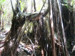 La sortie débute sur la route du Tremblet, 100 mètres avant de partir à droite vers le Quai de Sel. Des emplacements de stationnement existent près du croisement et on peut facilement laisser un véhicule sur l'accotement herbeux (Photo 1). Se rapprocher du muret qui protège de la cavité pour y repérer l'ouverture cachée en partie par les bois de chapelet et fougères (Photo 2). L'entrée, mise à jour lors de la construction de la RN2 n'est guère impressionnante (Photo 3). Passer par dessus le mur et descendre au plus facile dans le fossé. Rejoindre ensuite vers le tunnel par une marche de moins d'un mètre de hauteur. C'est la seule opération périlleuse de cette sortie en raison des pierres moussues et glissantes. Commencer par l'amont qui est le boyau le plus court et qui permet de s'habituer à cette exploration particulière. Le sol est soit couvert de gratons anciens très humides ou de plaques de lave solidifiée (Photo 4). Plusieurs effondrements d'une partie du plafond procurent par endroits un peu de lumière (Photo 5). D'autres, plus importants, ont permis l'invasion par les arbres (Photo 6). Il est même possible de sortir mais la végétation touffue n'incite guère à un nouveau genre d'exploration (Photo 7). On rencontre d'autres fenêtres sur le plafond, également envahies par les racines (Photo 8). Le boyau se divise parfois sans qu'il soit possible de passer partout sans ramper. Quand le passage devient désagréable, faire demi-tour et regagner la bouche d'entrée qui sert de repère lumineux (Photo 11). A partir de la route, c'est un véritable plaisir de descendre à l'Est vers la mer sur un sol presque plat et parfois un peu glissant (Photo 10). On rencontre des larges galeries ou des boyaux étroits (Photo 12), de petites ouvertures laissant passer la lumière ou des racines (Photo 13), des surfaces couvertes de mousses (Photo 14), d'autres de graffitis pariétaux très récents (Photo 15). Espérons que ce ne sera pas une habitude de toujours inscrire les dates des explorations et noms de ces courageux aventuriers qui ont su braver 400 mètres de tunnel et l'inscrivent sur les parois pour l'éternité ! Le plus impressionnant est la rencontre à chaque virage du tunnel de traces de vie végétale surtout représentées par les racines orangées (Photo 16). De celles qui recouvrent entièrement le plafond (Photo 17), qui pendent dans le vide pour y puiser l'humidité (Photo 18) ou qui ont tant rampé au sol qu'elles en ont fait des nœuds (Photo 19), c'est à chaque instant le plaisir pour les yeux. Le plafond est bas par moment et il vaut mieux avoir prévu la coiffure adaptée pour cette visite (Photo 22). Ne pas manquer également les coulures de lave, rapidement solidifiées, qui ont créé ça et là de multiples stalactites grises (Photo 26). On trouve enfin des tunnels de laves un peu partout dont certains n'atteignent pas 40 cm de large et bien sûr les inévitables détritus laissés là par d'autres "passants" ou apportés par des crues. Le circuit se termine hélas par une grosse quantité de terre apportée par les crues et laisse comme un goût d'inachevé car il faut rebrousser chemin. Le trou lumineux au-dessus peut s'atteindre mais c'est beaucoup trop dangereux et sans intérêt car on arrive dans la forêt.