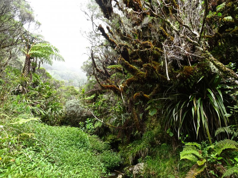 La randonnée débute non loin du Bassin Cadet près de la pancarte qui indique la fermeture officielle du Sentier du Bras Cabot. Comme cette fermeture correspond à un éboulis dans la descente vers les Sources du Bras Cabot, il n'y a donc aucun danger d'effectuer la montée à l'îlet Patience dont le départ est proche de la source Cresson. Il faut rejoindre la fin de la petite piste et prendre à droite le sentier du Bras Cabot de plus en plus envahi qui longe la prairie et les limites du parc. De nombreux randonneurs filent d'ailleurs directement au début de la montée en traversant la prairie, non recommandé par Randopitons qui n'incite jamais à traverser des propriétés privées. Le cheminement s'effectue presque à plat dans les goyaviers (Photo 1). Plus loin, on passe sous les cyptomerias qui, comme souvent, délimitent des zones définies par l'ONF. La montée à la Source Cresson s'effectue sur un sentier en lacets qui monte le long du rein. La grimpette est agréable avec quelques courtes trouées sur la Plaine des Palmistes (Photo 3). Plus on monte et plus les panoramas s'élargissent sur Saint-Benoît et l'océan (Photo 4). Les portions plates sont rares dans une végétation très dense (Photo 5). Quand le sentier est nettoyé, ce qui est assez rare, le passage ne pose aucune difficulté (Photo 6). Sinon, on monte entre les sabres, hautes herbes et quelques bois de couleurs qui dépassent (Photo 7). On rencontre deux fois des ouvrages bétonnés pour la gestion de l'écoulement de l'eau aux alentours de la source Cresson avant d'arriver sur le plateau. Attention, deux sentier partent vers le bord du rempart à la source; prendre celui de droite qui descend dans la ravine et non celui de gauche qui se perd dans la végétation et peut générer un important retard puisqu'il faudra faire demi-tour. Très vite l'embranchement vers le Bras Magasin se présente près d'une vieille pancarte indiquant la direction du Bras Cabot (Photo 9). La grimpette est immédiate, parfois raide mais des parties plates ou en descente permettent de récupérer (Photo 10). Les panoramas sont inexistants ou très rares sur la belle forêt primaire du plateau mais on peut voir l'importante densité des arbres (Photo 11). C'est surtout de la forêt primaire qu'il faut profiter sur cette courte distance. Le sentier est parfois très étroit et creusé dans la terre humide et moussue (Photo 12). Plus loin, les mousses sont tellement envahissantes qu'elles encombrent le sentier (Photo 13). Le tuyau est omniprésent et sert de fil d'Ariane (Photo 16). Il passe sous des branches de branles qui ont poussé depuis son installation et il faut se baisser souvent (Photo 14) ou franchit les petites ravines en aérien (Photo 17). La pente est régulière mais comporte parfois quelques écueils rocheux, glissants et moussus qui demandent un peu plus d'attention (Photo 20). On arrive en moins d'une heure au petit barrage bétonné de recueil des eaux (Photo 23). Le bassin en contrebas, entouré de branles moussus est un endroit charmant et sauvage (Photo 25). Traverser l'étroite rivière en franchissant la partie bétonnée (Photo 27) et poursuivre sur le discret sentier en rive droite jusqu'à la rivière. De là, le cheminement est aisé sur les gros cailloux qui constituent le fond de la rivière et permettent de remonter assez haut sans difficulté (Photo 28). Mais c'est surtout l'aval de ce torrent qui présente de magnifiques cascades réservées aux canyonistes entraînés. Le retour s'effectue par le même itinéraire pour profiter dans la descente des mousses, orchidées, ananas marrons non repérés dans la montée.