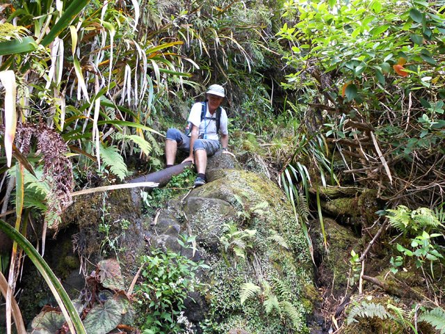 Savoir que le Sentier du Bras Cabot est fermé n'encourage pas à chercher dans les parages une autre sortie digne d'intérêt. En revanche, il suffit d'entendre une rumeur comme quoi il serait en bien meilleur état qu'on le dit pousse à revenir vers l'Îlet Patience et poursuivre la recherche de sentiers oubliés comme celui qui rejoint le Bras d'Annette ou comme ici emprunter celui qui permet de vérifier et maintenir en état le captage du Bras Magasin. La montée à l'Ilet Patience est sérieuse mais pas insurmontable. Celle du Bras Magasin est souvent abrupte mais présente l'avantage de traverser une magnifique forêt primaire envahie de plusieurs espèces de mousses, lichens ou fougères. Impossible de deviner la variété des arbres côtoyés sans lever la tête pour repérer le feuillage. On longe constamment un vieux mais solide tuyau en fonte bien utile lors des traversées de boue. Plusieurs passages étroits ont été creusés dans la terre et créent de beaux tunnels sombres dominés par les plantes recouvertes de mousse. Par endroits le sentier est tellement étroit et profond qu'on a du mal à passer sans salir les vêtements. Après plusieurs dents de scie pour franchir des petites ravines, on parvient à un discret barrage qui surmonte un très beau bassin d'eau claire. Une partie de l'eau est recueillie pour alimenter le tuyau, l'autre peut s'écouler vers l'aval dans la rivière. Plus bas, de belles cascades bien connues des canyonistes sont inaccessibles aux randonneurs. En revanche il est très agréable de poursuivre la randonnée hors sentier en longeant le Bras Magasin vers l'amont pour de nouveaux paysages ou de nouvelles sensations. Une courte mais sérieuse randonnée qu'il faut vraiment effectuer une fois.