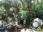 La randonnée débute à Cilaos, au grand parking de la rue des Thermes. Le Sentier des Porteurs commence au parking puis le longe quelques mètres avant de plonger vers le Bras des Etangs par de nombreux lacets et des raccourcis. Les portions planes sont rares mais pourront être agréables au retour (Photo 1). On parvient très vite à l'escalier permettant de rejoindre la RD242. Partir à gauche, franchir le pont et emprunter la route par le sentier qui la longe (Photo 2). Récupérer le GRR2 et entamer la descente vers le Bras Rouge. Le sentier n'est jamais difficile. Il est large, comporte peu de lacets et suit assez souvent la courbe de niveau (Photo 3). Le sous-bois, peu envahi, est agréable et ombragé (Photo 4). On a souvent l'occasion d'admirer certaines parties du cirque. Il faut en profiter car ces panoramas disparaîtront en longeant le Bras des Etangs (Photo 5). On rencontre à mi-parcours quelques lacets courts, des roches créant de hautes marches et même un ancien éboulis (Photo 6). 45 minutes après le départ, on se rapproche de la Ravine Ferrière. 100 mètres avant le gué qu'on ne verra donc pas, le sentier fait un angle droit vers la droite. C'est dans cet angle que débute le petit sentier menant au Bras des Etangs (voir § ci-dessous). Pour être discret il l'est au milieu de ces petits filaos rabougris mais on le distingue tout de même. En quelques mètres on est au bord du rempart d'où l'on peut admirer la cascade de Bras Rouge que l'on domine de plusieurs dizaines de mètres (Photo 7). Profiter de ce spectacle méconnu car on ne repassera pas par cet endroit. Juste en face passe la route de l'Îlet à Cordes qu'on ne remarque qu'au passage d'un véhicule. Le petit sentier se poursuit dans une végétation parsemée de minuscules filaos qui semblent avoir du mal à pousser au milieu de quelques grandes herbes et galaberts. Il se met à descendre assez fortement pour franchir le petit rempart avant de rejoindre le Bras des Etangs. Tous les passages délicats sont équipés de cordes solides qui facilitent grandement la descente (Photo 8). Le bruit des chutes d'eau devient plus important et l'on se retrouve en haut d'un promontoire rocheux d'où l'on aperçoit le torrent. La dernière corde est fort utile pour marcher sur la falaise basaltique glissante (Photo 9). Elle pend dans le vide pour aider à rejoindre les premières roches du lit à deux pas d'une belle cascade et de son grand bassin (Photo 10). On peut facilement s'en approcher si le basalte n'est pas trop glissant (Photo 11). L'accès au bassin est difficile mais possible sans corde en descendant en rive gauche (Photo 12). Mais le but de la boucle est de remonter le torrent et non de le descendre. Entamer cette remontée de rivière de deux heures en cherchant toujours les meilleurs passages. De courtes escalades seront nécessaires (Photo 13). Après quelques minutes de marche, on rencontre une première chute bordée de rochers qui se franchissent aisément en rive droite (Photo 14). Le cheminement le long des rives est possible assez souvent (Photo 15). Une grande partie du trajet s'effectuera les pieds dans l'eau, sur les roches qui encombrent le lit (Photo 16) ou sur des parties basaltiques qui peuvent s'avérer glissantes (Photo 17). On rencontre à chaque instant des curiosités de la nature qui égayent cette remontée de rivière pour les randonneurs peu habitués à ce genre d'exercice. Les coulées ferrugineuses ou les racines de filaos malmenées par les crues donnent de belles occasions de photos (Photo 18). La vallée est assez large même si le bras traverse des zones de petits canyons (Photo 19). On ne compte plus les petites chutes qui donnent du charme à la balade aquatique (Photo 20). Une bonne partie de la sortie s'effectue à l'ombre des filaos qui tentent au mieux à résister à l'assaut de l'eau (Photo 22). Plus haut, le sol devient plus plat et le ruisseau se calme à l'approche des cascades (Photo 23). Ces cascades, qui peuvent se visiter depuis l'amont en partant des Anciens Thermes, ont été modifiées par des travaux à l'époque où les thermes fonctionnaient encore. La première se jette dans un grand bassin entouré de hautes falaises infranchissables (Photo 26-1). La suivante, 200 m plus en amont, ne pourra se rejoindre qu'après avoir trouvé le sentier qui permet de l'atteindre (voir § ci-dessous). Pour cela, revenir sur ses pas et emprunter le sentier à partir du gros rocher en rive gauche. Attention, des traces en rive droite indiquent que des randonneurs sont passés par les falaises très dangereuses pour atteindre la cascade suivante. Il est vivement conseillé d'utiliser le parcours en rive gauche qui ne présente aucun danger. Après un très court cheminement, on parvient à un mur ayant servi de barrage puis à la cascade semi-artificielle (Photo 26-2). Traverser à gué à la cascade puis emprunter le large sentier fréquenté qui permet de rejoindre les bâtiments (Photo 27). Ne pas manquer, en l'empruntant, une autre cascade également modifiée de main d'homme et surtout ces magnifiques concrétions ocre sur lesquelles coule une eau tiède ayant sans doute conservé ses vertus thérapeutiques et thermales (Photo 28). Une minute après ces concrétions, on se retrouve à contourner les thermes et remonter à la RD242 par la piste. Prendre à droite puis emprunter à nouveau le Sentier des Porteurs pour rejoindre le parking à Cilaos.
