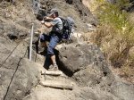 La randonnée débute au parking de l'arrêt de bus de Saint-Paul, proche du sentier menant au rempart de Mafate. Il faut tout d'abord traverser 500 mètres sur de larges plaques de lave comportant quelques branles verts avant de rencontrer le sentier venant du Maïdo. Quelques mètres plus loin, on profite, si on est parti très tôt, du lever de soleil du côté du Morne de Fourche ou du Gros Morne en fonction de la saison (Photo 1). De jour, on a une bonne idée du cirque et de la descente qu'il faut affronter pour atteindre l'Îlet des Lataniers caché derrière la Crête des Orangers. On domine cette crête et les premiers rayons éclairent quelques cases des Oranges (Photo 2). On entame alors une très longue descente qui emprunte un sentier parfois caillouteux, pourvu de hautes marches et de lacets abrupts. Peu de portions plates excepté un tronçon qui suit presque la courbe de niveau durant quelques centaines de mètre (Photo 3) et qui permet d'observer, plus haut, le petit pain de sucre du Maïdo (Photo 4). Les yeux sont constamment au sol en raison de la présence de nombreux cailloux qui pourraient faire trébucher dans le profond ravin. On domine la vallée de la Ravine Grand-Mère qui coule 900 mètres plus bas. Le rempart, quand on se retourne, semble vertical par endroits (Photo 5). Au milieu de la descente, un petit sentier part sur la droite et mène à un point de vue sur le sud du cirque et Roche Plate. Plus bas, après un oratoire et de nombreux lacets serrés, le sentier chemine sur une crête entre les ravines Grand-mère et de la Brèche qu'on traverse plus bas s'en même s'en apercevoir (Photo 6). A la Brèche, laisser à gauche le sentier des Orangers et prendre à droite vers Roche Plate en longeant la dent rocheuse équipée d'un escalier bétonné depuis l'effondrement de 2004. Pas de rambarde pour atténuer la notion de vide mais une main courante pour rassurer lors de la traversée de ce court passage qui peut incommoder les plus sensibles qui se colleront à la paroi en maintenant fermement le câble (Photo 7). C'est surtout le terrain sableux, en pente très forte, qui impressionne plus que le vide car on se demande comment s'arrêter si on commence une glissade sur ce flanc du Piton de Roche Plate. On a sous les yeux un panorama d'exception qui englobe l'ensemble du cirque et on aperçoit des îlets un peu partout (Photo 8). Poursuivre par un agréable sentier qui chemine sous les filaos et entre de gros rochers surchauffés au soleil donnant fréquemment des vues plongeantes sur la Rivière des Galets (Photo 9). Franchir une petite ravine qui coule en quelques fines chutes avant d'arriver aux premières cases fleuries de Roche Plate (Photo 10). L'îlet de Roche Plate, très étendu en longueur, se traverse par plus d'un kilomètre de sentier, plat le plus souvent pour un repos des jambes. Franchir une passerelle sur une autre ravine, affluent de la Ravine de Roche Plate et passer l'école de Roche Plate en laissant un peu plus loin le sentier qui part à droite en direction de Trois Roches. Franchir une autre petite passerelle sur la Ravine Anny, suivre l'agréable sentier qui relie les cases entre elles puis gagner le premier croisement à gauche avant le Bronchard. On a sous les yeux l'impressionnant rempart de Mafate, le Gros Morne ou les Salazes (Photo 11) et les premières cases de Roche Plate (Photo 12). Si la descente du Maïdo laisse encore des souvenirs dans certains muscles, un coup d'œil rapide sur la nouvelle pente qui se présente peut inquiéter (Photo 13). Rejoindre facilement le cimetière par le début du sentier Dacerle, aussi appelé le Sentier Facteur. Le départ longe presque la courbe de niveau avant d'emprunter quelques lacets sableux. Du cimetière, qui semble de plus en plus abandonné sous ses eucalyptus, on voit mieux le Piton de Roche Plate, le panorama vers la Brèche où l'on devine même l'escalier bétonné (Photo 14). Le sentier est parfois abrupt mais le plus souvent soutenu par des marches en bois (Photo 15). Il domine la Ravine du Bronchard avant de s'approcher de celle de Roche Plate (Photo 16). Quelques tronçons sont assez abrupts mais le sentier est large et toujours constitué de marches (Photo 17). Certains tronçons sont assez acrobatiques sur les roches dénudées et souvent chaudes (Photo 18). Le sol est tellement rocheux par endroits que la végétation n'a pas réussi à s'y implanter (Photo 19). Après l'avoir dominée et longée, on rejoint par une dernière descente la Ravine de Roche Plate qu'on traverse près d'une petite cascade et de son bassin permettant de se rafraîchir (Photo 20). Une fois la Ravine de Roche Plate traversée, le sentier traverse encore des zones dénudées puis un peu plus boisées. Laisser à droite le sentier qui mène à la Roche Ancrée et poursuivre vers l'Îlet à Cordes qui a totalement disparu et demeure introuvable. Entamer alors la jonction avec les Lataniers, souvent à flanc de rempart sur un sentier étroit qui domine la Rivière des Galets, comporte de nombreuses marches mais très peu de fortes pentes (Photo 21). Le sentier est bordé de manguiers abandonnés qui donnent de bons fruits à la saison (Photo 22). Certaines parties s'effectuent sur des reins ou en bordure de rempart (Photo 23). La vallée, très sauvage, encaissée et découpée, semble impraticable vue de cette hauteur (Photo 24). La fin approche lorsqu'on aperçoit l'Îlet de Cayenne sur l'autre rive, perché sur sa falaise dominant la rivière. Un passage plus difficile, marqué en pointillé sur la carte IGN, permet de rejoindre l'Îlet des Lataniers. Il faut faire très attention où poser les pieds car le sentier est plus étroit qu'ailleurs par endroits et des coulées de sable, entrainées par les ravinements de la pluie viennent l'obstruer (Photo 25). Les précipices également imposent une attention toute particulière ; ils ne sont pas en à-pic mais leurs versants sableux les rendent tout