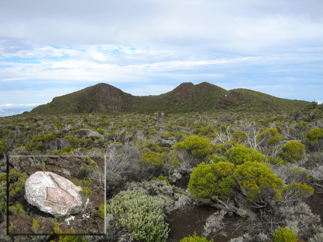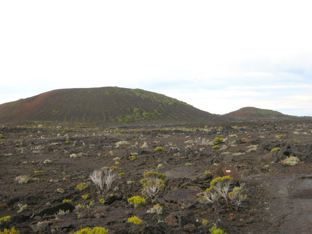 Cette magnifique randonnée s'effectue en grande partie en hors sentier mais permet, en moins de 15 km, d'escalader 5 pitons de la région de la Plaine des Sables ainsi que le magnifique et très photographié Demi-Piton. Il donne également l'occasion de fouler du pied les énormes cratères Aubert de la Rue, trop peu visités alors qu'ils sont très proches de la route du volcan. Les deux tiers du parcours s'effectuent hors du GRR2 qui mène au Tremblet. On se laisse donc guider par les particularités du sol recouvert de branles verts et autres plantes d'altitude, de cailloux de lave, de vieux troncs calcinés ou de sable. Le circuit donné sur la carte ci-dessous n'est donc qu'indicatif puisqu'on a la possibilité de passer où c'est le plus facile. On a toujours devant les yeux le prochain piton et il est impossible de s'égarer. La meilleure manière de marcher, quitte à rallonger le parcours, est de suivre les places vierges fabriquées par les millions de ravinements de l'eau de pluie qui a toujours empêché la végétation de s'installer. Ceci explique le caractère non rectiligne du tracé ci-dessous. En calculant bien, il est impossible de se griffer les jambes hormis l'arrivée au Piton Rond de Langevin où il faut traverser une dizaines de mètres de végétation plus dense.