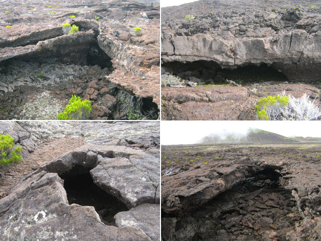 La randonnée débute au parking du GRR2 en direction du Tremblet. La piste ou le sentier sont larges et faciles jusqu'à la première ascension de la boucle. La marche est en descente très légère sur ce circuit le plus classique pour assister aux éruptions situées au sud de la Fournaise. On passe près d'un oratoire original fait de l'empilement de plaques de lave et on parvient sans effort au pied du Piton Rouge (Photo 1). Pas de sentier visible mais il s'escalade sans trop de difficulté si on prend le soin de monter à la manière des mules (c'est à dire en créant de courts lacets). Cette méthode présente l'avantage de laisser les cailloux en place. En fonction de la position du soleil, on comprend très bien pourquoi il se nomme ainsi (Photo 2). Une fois la courte escalade terminée, on aperçoit devant soi les Pitons Cambar et Hubert. La traversé ne pose aucune difficulté dans une végétation très pauvre, constituée de minuscules branles verts et de quelques touffes d'herbe rase (Photo 3). Le premier rencontré, le Piton Cambar s'escalade facilement. De belles natures mortes laissées par de très anciens incendies traînent au milieu des plaques de sable (Photo 4). Le cratère est tout en longueur, bordé de rochers dont certains hauts et pointus (Photo 5). Après avoir bifurqué sur la gauche pour contourner une faille, la descente est un peu plus sportive au milieu de ces rochers, mais sans danger (Photo 6). Nouvelle traversée entre les branles qui tentent de survivre à cette altitude froide et sur un sol pauvre (Photo 7). Le Piton Hubert est très proche et se rejoint en quelques minutes. De ce nouveau sommet, on peut évaluer le trajet emprunté pour arriver ici depuis le Piton Cambar (Photo 8). On aperçoit aussi de mieux en mieux le Piton Rond de Langevin (photo 10) pour repérer le point blanc qui se remarque sur la droite. La descente s'effectue par le sud en longeant le bord du cratère au fond recouvert de joncs (Photo 9). C'est la preuve qu'il y a de l'eau qui reste en cas de fortes pluies. La traversée est toujours aussi aisée sur le sable (Photo 11), dans des ravines de 30 cm de large ou sur l'ancien sentier qu'on remarque aux vieilles taches de peinture blanche qui n'est pas encore effacée. Garder un œil sur le point blanc au pied du Piton Rond de Langevin qui est en réalité un gros caillou peint (Photo 12). La végétation s'intensifie un peu à l'approche de ce piton qui dépasse d'une quarantaine de mètres. Viser le caillou blanc et traverser au hasard une dizaine de mètres un peu plus touffus que le reste. En montant sur l'arête, on comprend également l'origine de son nom dû à la forme ronde de son cratère comportant également une petite prairie au milieu (Photo 13). On peut, sans trop de danger, parcourir la totalité de la lèvre du cratère pour bénéficier de plusieurs panoramas sur ses faces rocheuses (Photo 14). Du sommet de ce piton, on profite de panoramas splendides sur toute la région du volcan, du Piton des Neiges, de la côte vers Saint-Joseph et surtout du Morne Langevin (photo 15). Repartir jusqu'au caillou blanc et rejoindre le sentier du Piton de Bert en partant vers l'est. On retrouve à nouveau des bribes du vieux sentier en traversant une végétation identique à la précédente. Au sentier officiel, cesser pour un temps le hors sentier et revenir vers le Piton Rouge. Le dépasser et obliquer aussitôt vers la gauche pour aller à la rencontre des cratères Aubert de la Rue. La montée s'effectue presque en droite ligne sur des coulées anciennes en peau d'éléphant fissurées (Photo 17). Quelques traces blanches sont peintes sur les rochers mais bifurquent vers l'ouest après 200 mètres ; sans doute un parcours rejoignant à l'époque celui du Piton du Rond de Langevin. On peut admirer tout au long de la montée de magnifiques tunnels de lave, entiers ou effondrés, des grottes ou des crevasses (photo 18). Il faut marcher sur les parties épaisses et peu friables car une cassure du sol ne peut être exclue. On arrive très vite au premier cratère dont on atteint le fond par quelques acrobaties (Photo 19). Le traverser pour rejoindre le plus grand d'entre eux qui permet d'avoir une très belle vue sur le centre du cratère (photo 20). Comme la descente dans le cratère peut être dangereuse, partir vers la route du volcan en passant entre le Chisny et les cratères. On passe près de petits tunnels de lave (Photo 21) et surtout d'imposantes crevasses qui peuvent inquiéter (Photo 22). Attention tout de même à ces crevasses qu'il faut parfois enjamber. En arrivant à la route, il n'y a aucune difficulté à repérer le Demi-Piton et à l'escalader en suivant toujours la ligne de crête. Un sentier discret existe et longe les parties basaltiques non érodées (photo 24). La marche s'effectue sans hésitation, sans danger et sans vertige malgré certaines pentes verticales (Photo 24). On a, de ces divers points, d'excellents panoramas sur la région volcanique. La descente est un peu raide mais sans danger jusqu'au Sentier Josémont. Il ne reste plus qu'un piton pour terminer cette randonnées toute en dents de scie. Le Piton Haüy s'escalade calmement à travers la végétation rabougrie ou inexistante (Photo 25). Là-haut, de grandes failles coupent le sommet en plusieurs parties. On peut marcher sur le bord ou au fond pour certaines (Photo 26). On peut profiter également des panoramas sur la région, le Cassé de la Rivière de l'Est et la Plaine des Sables (Photo 27). Le clou de la boucle se situe en fin de parcours quand on tombe nez à nez avec cet adorable petit cratère rond au milieu du grand (Photo 28). La descente et le retour ne sont qu'une formalité après toutes ces ascensions.