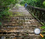 Voici l'état du pont début 2024. Fermé par arrêté préfectoral depuis 2007, le vieux pont de bois de Matouta n'a jamais vu sa fréquentation baisser pour la simple raison que de nombreux habitants du petit village ont leur plantation de vanille de l'autre côté de la ravine difficilement franchissable autrement. D'autres personnes croisées ce jour-là, l'utilisent pour aller travailler à pied sur la côte, préférant le plancher vermoulu à un long détour par Giroflé. Ce passage a été supprimé de la boucle car, même si nous nous sommes amusés en le traversant, il est impensable d'encourager des randonneurs à l'emprunter.