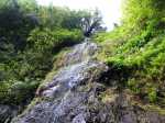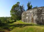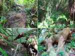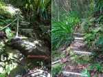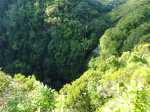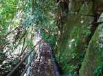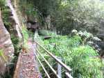 La randonnée débute au terminus du bus 37 (Arrêt Montée Sano) qui emprunte la Route de Bellevue en venant de Ste-Marie. Attention de ne pas stationner là où le bus effectue sont demi-tour. Emprunter la route étroite depuis le virage de la Racine Coco et marcher jusqu'au château d’eau sur la droite, dont la grille n’est jamais fermée à clé (Photo 1). Le sentier, large au départ, commence à plat en direction des bois qui entourent le village et la vallée de la Rivière Ste-Marie (Photo 2). Il se rétrécit et se rapproche de la Ravine du Bernica surmontée d'une passerelle rouillée. On peut encore passer par l'ouvrage vieillissant mais il est préférable d'emprunter le gué (Photo 3). On entend couler une cascade sur la gauche. Avant de poursuivre, il est conseillé de trouver le sentier en rive gauche qui se divise très vite en deux. Partir à droite sur une forte pente constituée de nombreuses marches en terre (Photo 4). Se rapprocher du petit bassin et de sa belle chute avant de remonter vers la passerelle (Photo 5). Traverser le gué sur des galets glissants avant de pénétrer dans un tunnel de végétation créé par des jamrosats bordant une ancienne piste (Photo 6). Le cheminement est très facile dans une végétation clairsemée de plantes envahissantes dont de nombreux goyaviers (Photo 7). Le sentier longe le bord de la pente qui domine la rivière, ondule en fonction du relief, traverse une nouvelle ravine qui coule en mince filet (Photo 8). On rejoint très vite le Bassin Bleu qu'on ne peut pas totalement voir depuis le sentier qui le domine d'une cinquantaine de mètres (Photo 9). On est frappé par le peu d'eau qui coule de cette haute chute. On comprendra pourquoi en arrivant au sommet de la prochaine cascade. Un minuscule sentier, difficile à discerner dans les fougères, débute près du point de vue (Photo 10). Tout le monde ne pourra pas le pratiquer en raison de multiples difficultés (Photo 11). La pente est raide et comporte quelques très hautes marches (A). Il est souvent difficile à suivre des yeux dans une végétation touffue (B). On doit, à un moment, contourner un arbre tombé au sol pour reprendre la plongée vers la rivière (C). Si on ne le contourne pas rapidement, on se retrouve sur une magnifique racine de camphrier imposant de faire demi-tour (D). La difficulté est oubliée avec l'arrivée au grand bassin (Photo 12). L'endroit est sauvage. Une minuscule cascade coule près d'une grotte en rive gauche (Photo 13). Cette grotte issue d'un ancien tunnel de lave est peu profonde (Photo 14). La cascade, quant à elle, est rarement exceptionnelle malgré sa hauteur (Photo 15). La remontée, très sportive, permet de retrouver le point de vue sur la cascade. En profiter pour voir également le panorama sur la côte et la vallée de la rivière (Photo 16). La végétation en direction du Piton Charpentier est très touffue (Photo 17). Le sentier poursuit sa balade en sous bois, très sombre parfois, en longeant la ligne de courbe et en coupant de petits ruisseaux qui laissent présager d importantes chutes d’eau en période pluvieuse. Le passage est creusé dans la falaise et les parties étroites sont équipées de mains courantes (Photo 18). Il n'y a pourtant aucun danger depuis que les goyaviers ont envahi le ravin et qu'il est impossible d'y tomber. Ce câble, parfois très long, sécurise les barres rocheuses enlevées pour faire passer la tuyauterie qu'on devine à peine au sol sous les feuilles mortes. Certaines portions d'un ancien canal apparaissent par endroits mais ne pourraient pas retenir 10 litres d'eau. On arrive enfin au début de la passerelle. Elle permettra d'atteindre la cascade qu’on aperçoit à une centaine de mètres. Le sol est constitué d'une grille recouverte de feuilles diminuant les sensations de vertige (Photo 19). Sous la passerelle, on remarque une grotte, qui, lorsqu'on s'en approche, n'est pas extraordinaire mais est aussi un lieu de prière (Photo 20). Poursuivre le long de la falaise sur une pente presque nulle (Photo 21). On arrive très vite au bassin en longeant cette muraille (Photo 22). La chute d’eau est faible en raison du captage mais le cadre très agréable (Photo 22). On peut s'approcher du bassin par le lit rocheux de la rivière à la fin de la passerelle. Il est profond mais n'encourage guère à la baignade. On remarque un petit tunnel avant d'entamer la montée. Avec une lampe, on peut y pénétrer pour étudier l'ingénieux système de récupération de l'eau (Photo 23). Presque à la fin, une fenêtre donnant sur le vide permet de voir la cascade sous un autre angle (Photo 24). Entamer ensuite la rude montée sur de hautes marches renforcées par des contre-marches en alu (Photo 25). Le câble mis ici pour protéger est surtout utile pour s'aider à escalader ce rempart. On profite de belles vues sur le bassin durant l'ascension (Photo 26). Au sommet de la cascade, la vue est encore plus impressionnante (Photo 27). On rejoint plus loin le captage reconnaissable à sa grosse grille qui empêche des galets de tomber dans le tuyau mais qui a bien souffert des assauts du dernier cyclone (Photo 28). Vu le principe de collecte de l'eau, on comprend que lorsque le niveau de la rivière est faible, les cascades sont très fines. La canalisation est prioritaire sur l'alimentation des bassins. Le sentier officiel s’arrête au captage mais la remontée de la rivière est possible sur les gros rochers assez peu dangereux. Le retour s'effectue par le même sentier.