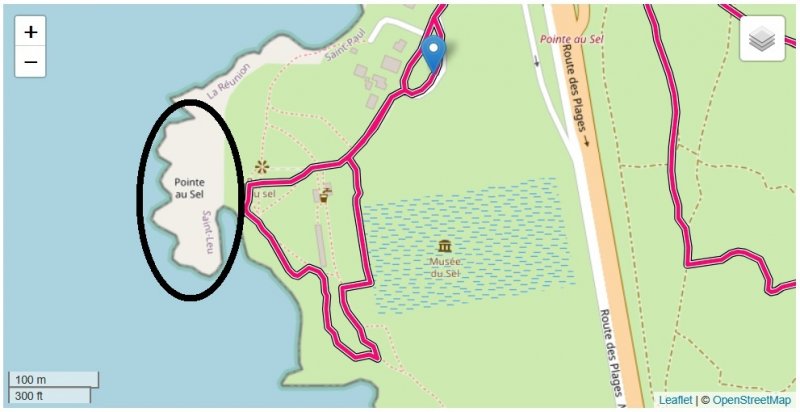 Se rendre à Saint-Leu ou l'Etang Salé et rejoindre la Pointe au Sel - Garer le véhicule sur le parking du musée - Visiter la saline et ses environs puis passer sous la route nationale et prendre le sentier à gauche de l'abri bus - Filer tout droit au premier croisement et à gauche au deuxième - Rejoindre la piste qui longe la Route des Tamarins puis la ville - Prendre à droite puis plus loin à gauche pour se rendre au Musée Stella Matutina - Repartir par le même itinéraire et rejoindre l'aire de pique-nique reconnaissable à la statue bariolée - Passer à nouveau sous la RN1, la longer par la gauche puis prendre la piste menant à l'aire de pique-nique des Roches Tendres - Partir vers le sommet du Piton des Roches Tendres puis vers la profonde ravine à droite et retrouver plus bas une piste qu'on emprunte sur la droite - Rejoindre l'abri bus puis le parking.