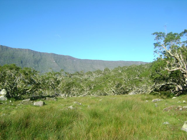 La randonnée débute au Piton Marmite, fin officielle pour les véhicules empruntant la Route Forestière du haut Mafate mais pas pour les piétons qui poursuivent sur ce tronçon en pente douce pour bien préparer les jambes aux 15 kilomètres qui suivront. Les paysages sur Grand Sable, la Plaine des Merles et le Col de Fourches sont toujours agréables (Photo 1). On domine les cryptomerias omniprésents avant d'arriver au Col des Bœufs qui est l'une des entrées de l'île la plus employée. Il faut dire que la Nouvelle est facile d'accès en bas de la longue descente. On embrasse d'un seul regard la Plaine des Tamarins et le Rempart de Mafate du côté du Maïdo et du Grand Bénare qu'on approchera de près en arrivant à la Rivière des Galets. Il est fréquent qu'un hélicoptère fasse la noria entre ce col et les îlets pour les ravitailler en matériel de construction. La descente ne présente guère de difficultés même si on rencontre parfois des marches plus hautes que la moyenne. La traversée de la Plaine des Tamarins ne se décrit plus et on flâne en regardant vers le Gros Morne ou le Morne de Fourche, assis sur le tronc d'un tamarin des hauts tombé lors d'un cyclone mais qui a poursuivi sa croissance comme si de rien n'était (Photo 2). De grandes clairières couvertes de joncs sont entourées de grands tamarins (Photo 3). On peut même y rencontrer des vaches qui vivent heureuses dans cette grande herbe verte (Photo 4). La descente vers la Nouvelle est plus difficile car les marches deviennent plus hautes et quelques fois glissantes. Un détour est possible pour un beau point de vue sur la Nouvelle depuis le Plateau Chêne. L'Îlet de la Nouvelle est le plus grand de Mafate et plusieurs sentiers parcourent le village où l'on peut voir de belles cases et beaucoup de gîtes entourant la chapelle constituée de deux pans descendant jusqu'au sol. Le sentier qui rejoint plus loin la Plaine aux Sables est parfois abrupt et en lacets mais moins fatigant que dans le sens inverse. Après avoir franchi la Ravine aux Sables, toujours à sec, on arrive dans la Plaine du même nom où il est possible de croiser d'autres petites vaches (Photo 6). C'en sera bientôt fini des descentes après avoir franchi la belle pente qui amène par de très courts lacets à la Rivière des Galets. La fin s'effectue sur un sentier ombragé par des centaines de filaos (Photo 8). En fonction de l'heure et de la météo, le détour vers la Cascade de Trois Roches ne prendra que trente minutes, sinon il faut débuter la longue ascension vers Marla sur un sol très souvent dénudé ou poussiéreux et glissant. Le cheminement à plat le long de la rivière est une balade facile sous quelques filaos (Photo 9). On s'approche de la rivière constituée de larges plaques basaltiques bordées de falaises friables (Photo 11). Un escalier en bois amène à des marches pour entamer la remontée. On s'éloigne un peu de la rivière pour franchir un rein en face des petites cascades de la Ravine du Taïbit (Photo 10). Le sentier longe ensuite à nouveau la rivière en rive droite avant le franchissement d'un gué fait de grosses roches. Le sol est parfois très rocailleux et les plantes ont du mal à s'installer (Photo 13). Par beau temps, le soleil chauffe ces roches et la terre glissante qui constitue le sentier (Photo 14). La remontée alterne lacets terreux, pierreux et de belles portions refaites à neuf pour empêcher l'érosion (Photo 15 et 16). En fonction des endroits, on bénéficie de magnifiques panoramas sur la vallée de la Rivière des Galets ou Marla qui approche doucement (Photo 18). L'arrivée à l'îlet s'effectue après une portion très rocailleuse puis une montée plus calme vers le point de vue officiel qui a presque totalement disparu dans la végétation. Comme à la Nouvelle, on peut flâner dans l'îlet ou rejoindre au plus vite le sentier qui vient du Taïbit et remonte à la Plaine des Tamarins. Descendre à gauche en direction de l'école et de la chapelle (Photo 19). Remarquer, derrière le petit édifice, les prairies verdoyantes qui abritent des troupeaux de biches et de cerfs de java. Les vues sur le Taïbit, les Trois Salazes ou la tête de chien sont impressionnantes. Le sentier quitte les habitations en franchissant la très discrète Ravine de Marla puis descend doucement vers la rivière des Galets. On rejoint sans problème Maison Laclos qui semble très isolée au pied du Plateau du Kerval. A partir de Maison Laclos et toujours en fonction de l'heure ou de l'état des jambes, un détour est possible vers la Passerelle sur la Rivière des Galets, proche de beaux bassins ou cascades. Sinon, poursuivre pour franchir le Bras Massine (Photo 22). Une petite cascade qui alimente un bassin en aval du gué peut se rejoindre sans difficulté en sautant de rocher en rocher. Plus loin, c'est le gué sur la Rivière des Galets qu'il faut franchir sans difficulté dans un environnement boisé de filaos (Photo 23). Après le gué, débute une forte pente constituée de lacets courts et nombreux constitués de marches en bois ou en pierre (Photo 24). Le sentier passe parfois près de ravins profonds mais protégés par les bois de couleurs couverts de barbes de Jupiter (Photo 25). On domine de plus en plus la vallée de la Rivière des Galets qui est un véritable canyon par moments (Photo 26). On parvient à la fin de la montée pour profiter du point de vue officiel sur Marla et la Grand Bénare (Photo 27). On retrouve les tamarins et les clairières couvertes de joncs et de hautes herbes où paissent paisiblement quelques petits troupeaux. La Mare aux Serres est plus un marécage qu'une mare mais suffit à abreuver les bovins. La traversée d'une nouvelle portion de la Plaine des Tamarins est un plaisir renouvelé malgré les jambes qui souffrent plus qu'au départ (Photo 28). Les fortes pentes ne sont pour autant terminées car il faut entamer la montée vers le Col des Bœufs. Le sen
