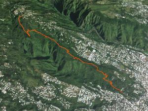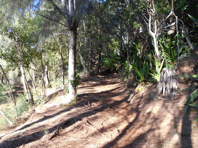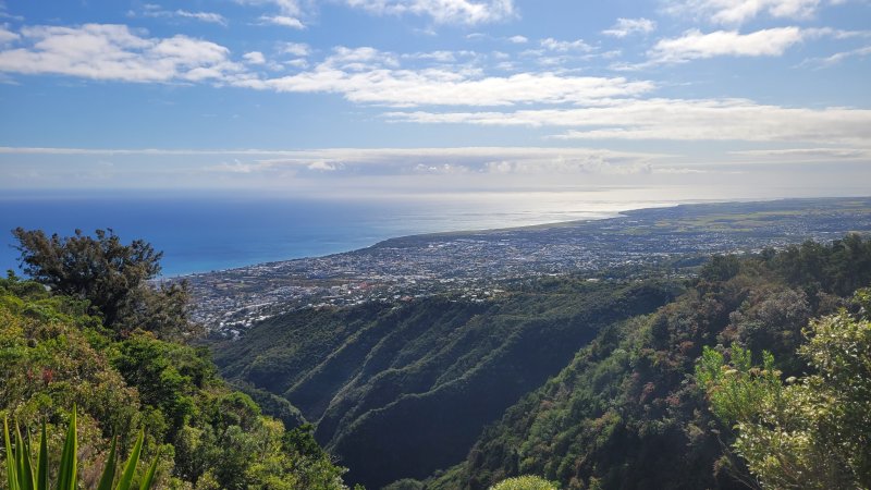 La randonnée débute à la Providence, près d'une aire de loisirs et d'une belle touffe de gros bambous et de palmiers royaux (Photo 1). Le sentier est facile à trouver près des panneaux et poteaux de l'ONF qui prévoient 2h30 de montée pour atteindre le Brûlé. Il débute sur des roches, tout d'abord organisées en marches puis semées ça et là comme pour ralentir la marche (Photo 2). La végétation sur les bords est très pauvre et comporte beaucoup de chocas (Photo 4). Quelques lacets caillouteux rapprochent d'un kiosque qui permet de voir des quartiers de Saint-Denis (Photo 5). Quelques panneaux sous forme de triptyques présentent succinctement la végétation du lieu (Photo 9). D'autres, plus petits comportent un dessin de caméléon (endormi à la Réunion) et le nom de la plante. Quelques marches en bois retiennent la terre quand ce ne sont pas les racines qui le font (Photo 8). Plus on monte et plus les panoramas s'étendent sur le chef-lieu mais ils deviennent rares (Photo 10). Après de nouveaux lacets on rencontre une piste bétonnée et le sentier botanique file vers la droite (Photo 14). Poursuivre sur le GRR2 marqué de rouge et blanc en passant sous le couvert des arbres qui deviennent de plus en plus grands. Les cailloux diminuent mais sont remplacés par les racines constamment piétinées de ces grands arbres (Photo 11). On rencontre également une plantation de cryptomerias où les racines sont encore plus nombreuses mais moins grosses, très glissantes par temps de pluie (Photo 12). Après avoir coupé la piste, le sentier passe entre de nouveaux gros arbres présentant d'énormes racines qu'il faut parfois enjamber (Photo 15). Plus haut, le sentier bordé de jouvences se rétrécit et on retrouve cette piste qu'il faut suivre sur une cinquantaine de mètres avant de la quitter en partant sur la droite vers une zone couverte de filaos sur un sentier assez plat (Photo 16). Puis ce sont les camphriers qui les remplacent dans un sous bois plus aéré que plus bas (Photo 17). Le sentier suit alors la ligne de crête d'où l'on peut voir la vallée de la Ravine du Butor (Photo 18). De l'autre côté on aperçoit parfois les habitations des bas du Brûlé qui dépassent des arbres couvrant les flancs de la Ravine Montplaisir (Photo 21). Avant de plonger vers la gauche en direction de petites ravines, affluents de la ravine du Butor, on croise de magnifiques spécimens de filaos centenaires (Photo 19). Ils semblent participer au concours du plus gros filao et certains ont certainement dépassé le siècle d'existence. Profiter du dernier panorama sur la ravine et sur l'aéroport en direction de Sainte-Marie (Photo 22). Le sentier, très ombragé, descend sur la gauche en légère descente. On rencontre une première ravine étroite et sèche qui se passe sans aucune difficulté sur un sentier humide et gras (Photo 23). Le sentier monte plus fortement sur des marches après la deuxième ravine et on se retrouve sur un sentier glissant bordé de goyaviers (Photo 24). Après une petite plantation d'araucarias (Photo 25) suivie d'une autre d'eucalyptus, le passage s'effectue entre des dizaines de grosses touffes de bambous qui vont jusqu'à créer des tunnels qui cachent de la lumière (Photo 27). Un dernier raidillon, très court, se finit à une rue du Brûlé à quelques mètres d'un petit stade. Il est possible de se désaltérer avant d'entamer la descente par le même itinéraire ou en utilisant la piste ou le sentier botanique pour rallonger et varier le circuit.