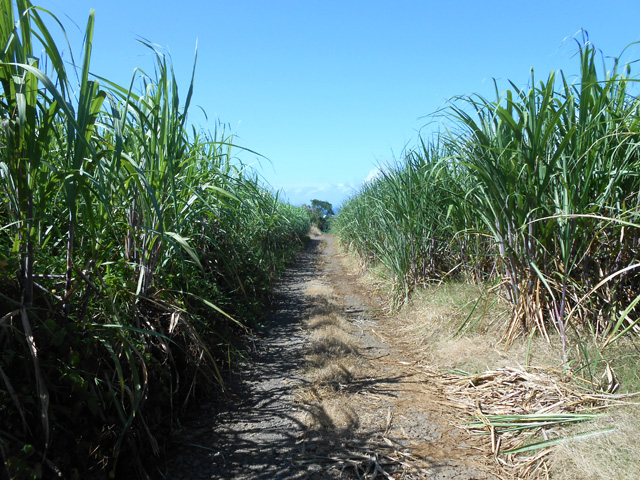 Avant de rejoindre le bocage, on peut s'éloigner du sentier pour en trouver un autre, plus discret qui débute à la première touffe de bambous (Photo 20). La végétation est luxuriante (Photo 20). Le sentier est étroit et difficile à suivre mais on peut se rapprocher de la petite rivière aux calmes (Photo 21). La trace se poursuit vers l'aval mais la végétation a beaucoup trop envahi les lieux et on perdrait du plaisir à poursuivre. Au retour, après avoir remonté le sentier, il est également possible de partir sur la gauche et de suivre la piste laissée au début pour effectuer une boucle dans les cannes (circuit violet sur la carte de la photo 26). Cela rallonge en créant une boucle mais attention tout de même aux chiens à moitié fous qu'on trouve à la première case : le bâton s'avère même nécessaire. On retrouve sur la totalité du rajout ces grands champs de canne à sucre sur des pistes faciles et presque plates (Photo 25). Ce supplément, pourtant agréable, n'a pas été intégré au profil ci-dessous.