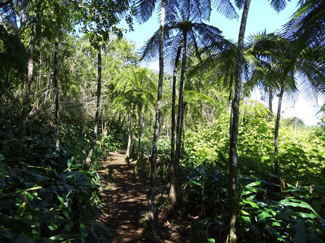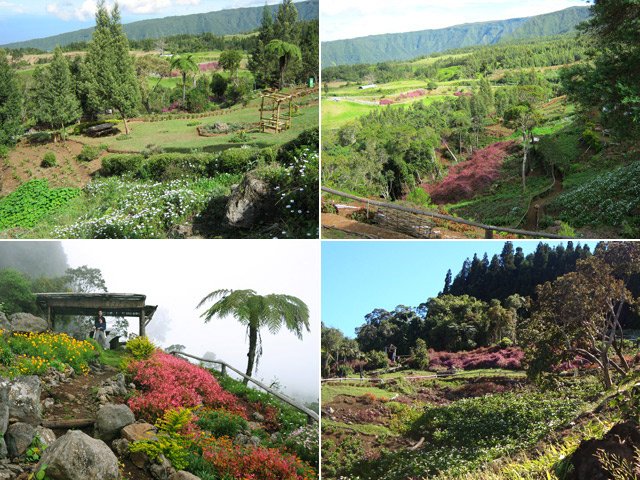 La randonnée débute à la plus belle aire de pique-nique de l'île (Photo 2) traversée par la Route Forestière des Makes en direction de la Fenêtre et emprunte un sentier agréable qui longe les parterres de fleurs pour rejoindre, 500 m plus loin, le début du sentier du Bras Patate. Traverser la ravine en profitant des dernières fleurs et emprunter un agréable chemin qui épouse le relief en longeant des prairies. A la fin d'une route de service qui s'arrête en cul de sac, poursuivre sur un sentier un peu rocheux et en corniche qui rejoint le Bras Patate. Juste avant de traverser la ravine, bifurquer sur la gauche et suivre le Bras Patate en rive droite (Photo 4). Le sentier monte agréablement vers la source du Bras Patate alternant les parties basses habitées par les longoses et les parties hautes dans les bois de couleurs. Il grimpe à peine au départ mais devient plus raide en deuxième partie. La vallée est magnifique sous le soleil. On voit dans le fond une espèce de gorge verdoyante et quelques rochers bordent le sentier (Photo 5). On parvient, après trois quarts d'heure au point de vue sur Cilaos (Photo 6). Le sentier vers la Fenêtre des Makes part sur la gauche et celui du Piton Cabris sur la droite. On pourrait prendre à gauche pour quelques minutes en reliant les cryptomerias et les antennes qu'on aperçoit mais le panorama sur Cilaos n'a rien à envier à celui-ci. Après un petit repos à regarder le Cirque, ses îlets ou la route aux 400 virages, obliquer à droite et attaquer la courte mais sérieuse montée au Piton Cabris. Ne pas se laisser impressionner par la pancarte qui indique que c'est difficile ; elle oublie juste de dire que c'est court. Les marches sont hautes parfois mais c'est surtout les à-pics vertigineux qui peuvent le plus impressionner. Il suffit de faire attention où poser les pieds et surtout de s'arrêter pour admirer le paysage (Photo 8) ou faire une photo. Jamais de nez en l'air en montagne, surtout sur une arête ou près d'un à-pic (Photo 9). Il ne faut pas hésiter à se retourner souvent car les panoramas sur Cilaos sont extraordinaires. Une échelle facilite un passage et on est étonné d'arriver si vite au kiosque édifié au sommet. Le sentier s'élargit puis pénètre sous les tamarins puis sous les cryptomerias (Photo 12). Il propose parfois quelques panoramas sur Saint-Pierre, le Tampon ou le cirque. On poursuit, toujours sous les cryptomerias, tellement serrés les uns aux autres que la lumière a du mal à pénétrer. Par temps sombre, il faudrait presque la lampe frontale. On parvient ainsi à un croisement assez dégagé pour en faire une aire de repos. Laisser à gauche le sentier vers le Tapage et poursuivre vers la droite, toujours sur les racines glissantes des grands conifères qui cessent d'un seul coup à une clairière où l'on récupère le sentier de la Plaine du Bois de Nèfles. Prendre à gauche et traverser une zone habitée et cultivée, principalement de géraniums, sur un sentier large et terreux qui peut être glissant par temps humide (Photo 13). Profiter des magnifiques panoramas vers le Petit Bénare et les Hauts du Tévelave car les points de vue diminueront dans la descente. Plus loin, avant de passer une petite ravine et son mince filet d'eau, tenter de trouver la longue caverne qui sert de passage à cet affluent du Bras Patate (Photo 14). Pour la visiter, il faut avoir prévu sa lampe dans le sac. La partie qui suit est presque plate, bordée de très hautes herbes, de lysandras, de longoses et de beaucoup de vigne maronne (Photo 16) avant d'arriver dans une autre partie cultivée, agréablement fleurie et reposante (Photo 17). Ce repos sera nécessaire avant d'affronter la traversée du Trou sur un sentier boueux et envahi (Photo 18). Avant de retrouver un croisement, il faut affronter une forêt de bois de couleurs sur un sentier étroit, comportant de hautes marches et des racines glissantes. Les 200 mètres qui suivent le croisement sont agréables, presque plats dans les goyaviers et autres pestes. On rencontre de beaux fanjans puis le sentier plonge littéralement sur un sentier sombre et bordé de milliers de bois de perroquets. La descente est raide, glissante, humide le plus souvent et il faut se maintenir au bâton ou aux arbustes. Quelques faux-plats permettent de souffler mais sur de courtes durées (Photo 25) ; la pente n'en finit jamais. On arrive à une piste plus large et couverte d'herbe qui traverse une belle zone de pique-nique abandonnée (Photo 26) et le chant des coqs ou les aboiements sont un soulagement lorsqu'on arrive enfin aux Canaux. Pas de difficulté pour retrouver le sentier qui remonte vers le Trou aperçu il y a plus d'une heure ; il suffit de contourner le village par la route puis de la suivre plus haut dans les cannes à sucre jusqu'à un réservoir qui marque le début du sentier de la Pente Tunnel. Plus haut, un kiosque permet de souffler en profitant de beaux points de vue sur la route des Makes, le Grand Serré et la région environnante (Photo 27). Le sentier se rétrécit mais reste correct jusqu'à une aire de pique-nique abandonnée. Seule une grande case est encore debout et propose table, bancs ou lieu de grillade et semble utilisée à en juger par les ordures laissées sur place malgré une pancarte sculptée demandant le contraire. Après cette aire, le sentier est envahi de jouvences humides, de cailloux et de longoses mais on passe sans encombre (Photo 28). Le sentier monte plus fortement à partir d'un petit bois de cryptomerias. Un dernier raidillon dans les bois de couleurs et les rochers avec de longs lacets permet d'atteindre une zone couverte de pestes de toutes sortes. Seules les fougères arborescentes semblent ne pas avoir été absorbées. On profite malgré tout de quelques panoramas sur le Bois de Bon Accueil et le Haut Tévelave. Une autre longue partie de bois de couleurs envahie de longoses arrive rapidement mais ne présente p