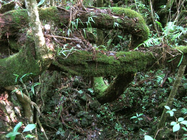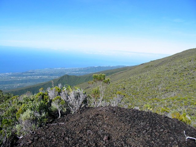 La randonnée débute à l'église de Basse Vallée qui dispose d'un arrêt de bus et d'un grand parking. Dans ce cas, on commence la montée par la route jusqu'à la Maison Forestière de Béloni (en vente) pour récupérer, un peu plus loin sur la droite, le sentier qui rejoint le Gîte de Basse Vallée. Cette première partie, sur un sentier caillouteux, traverse la forêt de bois de couleurs et ses plans de vanille installés un peu partout à l'ombre sur les arbustes (Photo 1). Pas de difficulté particulière pour cette portion à peine tortueuse qui traverse une belle forêt des bas assez peu envahie de plantes invasives (Photo 2). Ce sont surtout les fougères, humides le matin, qui bordent le sentier (Photo 3). Le sentier coupe par quatre fois l'étroite Route Forestière de Basse Vallée (Photo 4). Chaque fois le sentier reprend de l'autre côté. Certaines portions montent assez fortement mais, en règle générale, la pente est assez faible et régulière. Certaines parties sont assez plates sur les feuilles tombées d'une végétation touffue (Photo 5). D'autres, plus encombrées de racines et de pierres moussues, sont un peu plus difficiles (Photo 6). Repérer dans la montée les grottes ou anfractuosités particulières liées à ce type de paysage accidenté. On peu même descendre dans l'une d'elles sur la gauche du sentier. On se rapproche du Bras Plat qu'on suivra jusqu'au gîte. Le fond recouvert de mousse lui donne souvent un très bel aspect mais attention à la glissade facile. Les gros arbres sont rares mais on en rencontre tout de même ça et là ainsi que de grosses racines en bord de sentier (Photo 8). Quelques cultures sur la droite, principalement de vacoas (pandanus) puis la route pour la 5ème traversée marquent l'arrivée au gîte qu'on ne verra pas puisqu'on bifurque immédiatement en direction de la RF des Camphriers. Partir aussitôt à gauche sur un raccourci qui monte dans les goyaviers, les bois Noël (Ardisia crenata) et les losto café (Gaertnera vaginata) à l'odeur agréable pour rejoindre la Route Forestière des Camphriers, dans le dernier lacet. Bien profiter de cette partie qui monte lentement sous les camphriers odorants car les choses vont se compliquer à partir du nouveau kiosque. Visiter la grotte sur la gauche, cachée par la végétation avant de s'approcher du kiosque. Le sentier commence à cette aire de repos. Il grimpe dans les bois de moyenne altitude en offrant peu de panoramas. Il se rapproche de la Vallée Heureuse après 500 mètres mais les occasions de voir le fond sont également rares en raison de la végétation. C'est une succession de courtes montées suivies de courtes descentes, augmentant ainsi le dénivelé de la journée. Près d'un kilomètre plus loin, en s'approchant d'une petite ravine, il oblique sur la droite et contourne le Piton Ravine Basse Vallée sans qu'on le voit vraiment, surtout qu'il dépasse à peine de la forêt. Les jambes commencent à chauffer car 1200 m viennent d'être grimpés et il en reste autant à effectuer. On profite parfois de vues sur la région qui permettent de remarquer que la pente est faible mais qu'il reste encore beaucoup de montée avant de parvenir à la Fournaise (Photo 9). La végétation forestière diminue et se remplace doucement par les branles et les fougères arborescentes (Photo 10). Les montées et descentes successives ne diminuent pas pour autant. La pente moyenne non plus ne faiblit pas et on parvient, 600 m plus haut au Piton Rick, un cratère dépassant de la végétation de plus en plus rase (Photo 11). Il reste encore quelques touffes de branles et de hautes fougères (fausses osmondes) qui égayent le paysage. Puis on poursuit dans les branles verts qui diminuent encore de taille. Vu l'altitude, c'est beaucoup plus pratique pour admirer le paysage allant jusqu'à l'océan (Photo 13). Puis le sentier s'approche des zones de plus en plus désertiques des Puys Ramond (Photo 15). On frôle des cratères profonds difficiles d'accès (Photo 16 et 17) avant de tenter l'escalade d'autres cheminées dépassant du sol (Photo 18). Tous ces cratères s'escaladent mais il faut avoir du temps pour cela car il reste peu d'ascension mais la distance est encore longue jusqu'au gîte. On peut visiter cette région et pénétrer dans de nombreux tunnels en consultant cette randonnée. A 2000 m, la pente se calme enfin en quittant les puys (Photo 19). Le sentier, déjà balisé de blanc voit ses taches de peinture se multiplier, signe qu'on approche de l'Enclos Fouqué où le brouillard sévit une bonne partie de l'année (Photo 20). Le soulagement arrive enfin à 2200 m quand on s'approche des zones herbeuses du Piton de Bert (Photo 21). Suivre alors le bord de la caldeira et marcher presqu'à plat sur un sentier large et même une piste récemment construite. Prendre l'un ou l'autre et marcher facilement jusqu'au croisement avec le sentier redescendant au gîte par la rive droite de la Vallée Heureuse. On frôle un semblant de cratère plat qui peut parfois contenir de l'eau (Photo 22). Depuis le bord, on voit très bien le Pas de Bellecombe (Photo 23) qu'on peut rejoindre directement à partir du Piton Rouge en continuant de longer le rempart dominant l'Enclos Fouqué. Sur la droite, le Piton de la Fournaise en impose par sa taille (Photo 24). Si on reste sur le GR, on passe près d'un oratoire original fait de plaques de lave empilées puis à quelques mètres de la Caverne du Chisny. Le sol est plat et très agréable surtout dans ces paysages exceptionnels de la Plaine des Sables. On parvient à la route forestière du Volcan et on se rapproche tranquillement du Demi-Piton (Photo 26). On peut filer tout droit vers la Griffe du Diable ou prendre à droite la route en terre et ses nids de poules (Photo 27). Que l'on emprunte l'une ou l'autre, on parvient enfin au gîte pour un repos bien mérité. Le lendemain, c'est une demi-douzaine de circuits qui peuvent s'effectuer