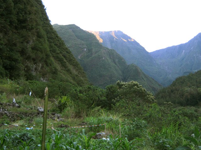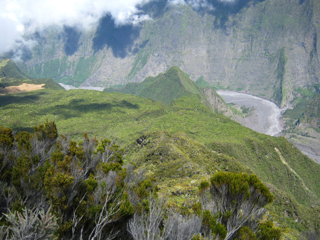 La Plaine des Sables peut se traverser par le sentier de Grand Galet qu'on trouve sur la droite 300 m après le dernier lacet ou par la plaine elle-même en longeant le pied du Morne Langevin qui permet de découvrir de meilleure manière cet endroit unique en se reposant un peu les jambes (Photo 16). Quelle que soit la décision, ne pas manquer les plaques colorées à mi-parcours (Photo 17). Dans les deux cas, rejoindre le sentier et entamer la descente assez raide vers Grand Pays. Cette plongée qui permet de rejoindre Grand Pays, Cap Blanc ou Grand Galet est impressionnante, tant en montée qu'en descente (Photo 18). La pente y est forte et les lacets très serrés. On se retrouve vite au pied du Morne Langevin (Photo 19). On longe des paysages sauvages et chaotiques et on a même l'occasion de marcher longuement dans un fond de ravine basaltique qui n'a que quelques siècles d'érosion (Photo 20). La végétation n'est pas très haute mais elle est touffue, empêchant toute exploration (Photo 21). On longe parfois de profondes failles lorsqu'on chemine sur le sentier en lacets (Photo 21). Le mieux est de bien rester sur le sentier car d'anciens effondrements l'ont parfois diminué de moitié en largeur. De plus, en cas de chute, on se retrouve très vite 50 m plus bas (Photo 23). Le sentier est le plus souvent terreux mais on trouve également des parties assez pierreuses (Photo 25). On devine déjà Grand Galet dans le fond de la vallée (Photo 26). Plus bas, à Cap Blanc, le sentier traverse une très belle forêt de filaos qui se poursuit jusque sur les flancs des remparts de Foc-Foc (Photo 26). Ne pas oublier, après avoir passé l'abri de Cap Blanc et traversé la rivière, d'admirer la petite cascade sur la droite, bien visible depuis qu'un observatoire a été aménagé le long de la Grande Ravine. Le sentier traverse encore quelques champs à moitié abandonnés (Photo 28) avant de retraverser la Grande Ravine encombrée de gros galets.