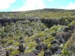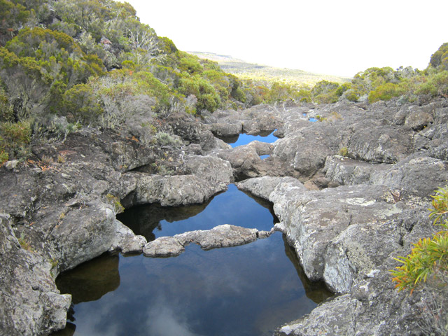 La randonnée peut débuter n'importe où sur la Route Forestière des Tamarins entre les deux ravines. Un emplacement très proche de la pancarte indiquant le sentier des Colimaçons fera très bien l'affaire. Le sentier commence par la seule difficulté de la boucle car il traverse après moins de 100 mètres une zone herbeuse où le sentier n'est pas marqué ou se confond avec les traces laissées partout par les bovins. Ne jamais perdre de vue qu'on suivra tout le temps la Ravine des Colimaçons et il faut donc marcher vers la gauche après cette zone de pâturage entourée de fougères (Photo 1). On domine toute la planèze et le regard porte jusqu'au lagon de l'Ermitage et Saint-Paul (Photo 2). Très vite on rencontre le premier cairn qui sert de balise et c'est en suivant ces petits tas de cailloux qu'on trouve les meilleurs passages (Photo 3). On marche toujours avec la ravine à vue sur la gauche (Photo 4). Que ce soit la rive droite ou la rive gauche, on est assuré de ne voir que de la roche qui borde la ravine (Photo 6). Un tuyau, désormais perdu dans la végétation qui a repoussé longe le sentier (Photo 7). Après une pluie, certains bassins et cassés doivent être magnifiques (Photo 9). La Ravine des Colimaçons alterne les partie très larges (Photo 10) et celle beaucoup plus étroites qui sont de véritables cassures dans le basalte (Photo 11). Le sentier passe également en bordure de véritables ravins profonds et dangereux où il est même impossible de descendre sans corde (Photo 13). Certaines portions comportent de profonds bassins sans possibilité de sortir si on venait à tomber dedans (Photo 15). La ravine devient de plus en plus petite, les canyons diminuent en nombre et en taille et on devine, devant soi, le Piton Rouge qui dépasse à l'horizon (Photo 16). Cette fiche ne prévoit pas d'y monter pour profiter des panoramas à 360° ou des sculptures de Gilbert Clain mais le détour prendra 30 minutes pour les curieux (Photo 17). Le sentier très connu qui sépare le Piton Rouge de la Glacière est une promenade bordée de points de peinture blanche qui manquent tant le long des deux ravines. Une piste a été créée mais il est plus agréable de suivre le sentier surtout qu'il est plus court. On arrive à la ravine du Fond de Simambry bien marquée par une cascade (à sec, bien sûr) et un bassin sur la gauche du sentier (Photo 18). Débuter la descente par la rive droite plus facile à cet endroit. Plus loin, on fait exactement ce qu'on veut ; soit par la rive droite, soit par la rive gauche mais surtout par le fond de la ravine qui permet de longer des dizaines de petites retenues d'eau donnant de belles occasions de photographies originales. On y rencontre plus de bassins que la Ravine précédente (Photo 19). Certains sont très difficiles d'accès et certainement dangereux (Photo 20). Des marmites par dizaines ont transformé le sol en gruyère. Avec de l'imagination, un clair de lune et un peu d'inquiétude, on pourrait être amené à trembler en découvrant certains formes (Photo 22). Il n'y a aucun danger de longer ces petits bassins car le sol est assez plat et les bassins peu profonds (Photo 23) et (Photo 24). C'est également un festival de sculptures de basalte érodées par le vent et la pluie (Photo 25). Arrivé à l'altitude de 2000 m (voir carte), prendre absolument la rive gauche afin de ne pas se retrouver coincé de l'autre côté de la ravine qui fait ici plus de 20 m de profondeur avec des parois abruptes. Le sol est plat, rarement recouvert de végétation gênante et la marche est rapide (Photo 26). On entend les véhicules passer sur la Route Forestière des Tamarins. La ravine est large, déchiquetée et on comprend pourquoi il fallait vite passer en rive gauche un peu plus haut (Photo 28). On rencontre la route dans un grand virage et le dernier kilomètre pour rejoindre le véhicule n'est qu'une formalité.