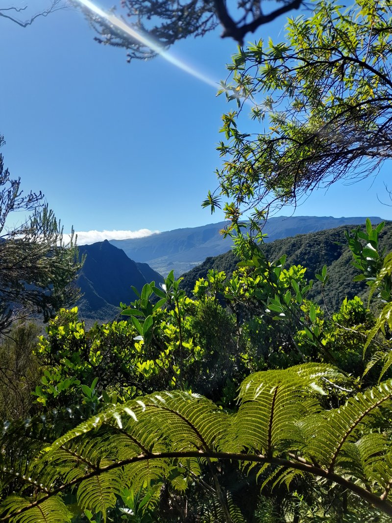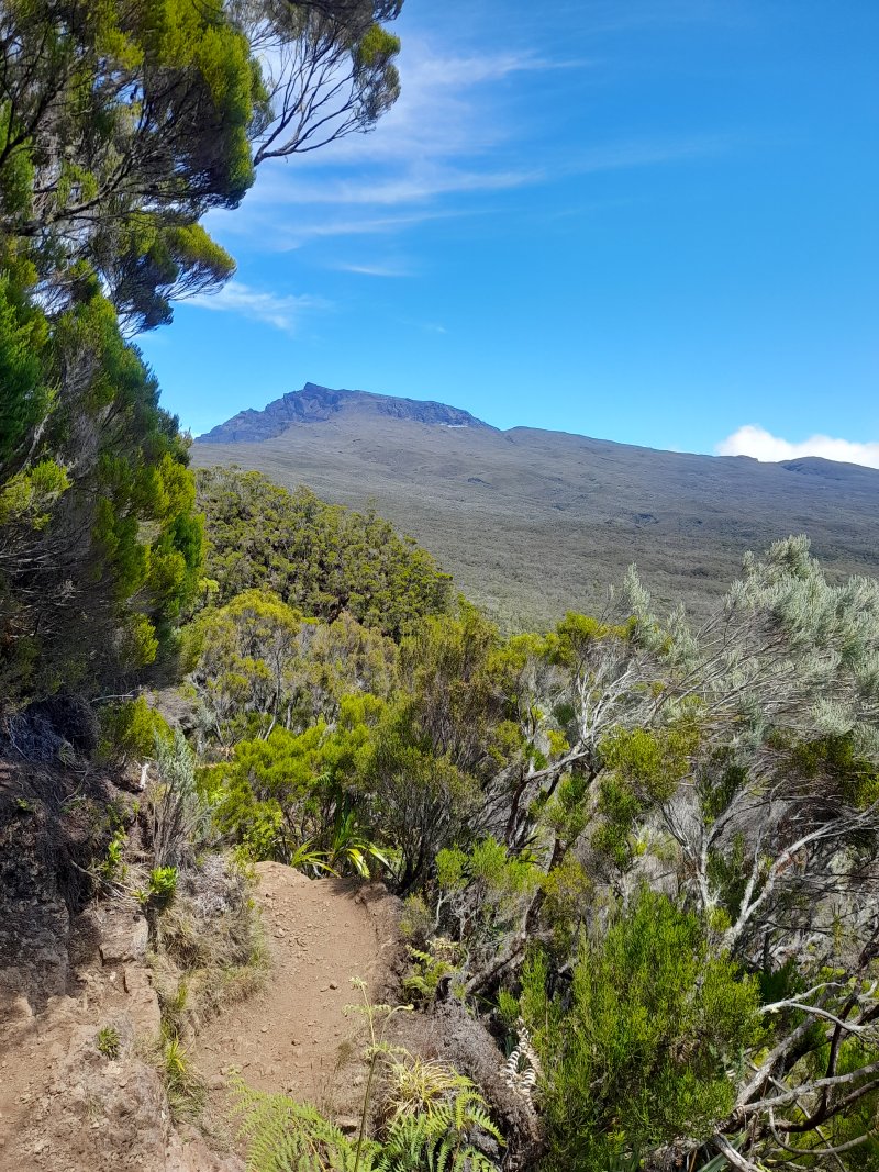 Randonnée effectuée ce 13 février 2025 dans le sens horaire. Temps magnifique avec juste de la brume pour l’arrivée vers 16:00. Peu de boue, sauf par endroits. Très grosse difficulté, en raison d’un marquage abîmé, à trouver le sentier après avoir traversé le Bras Chansons. La reprise du sentier nécessite de descendre sur 10 m environ dans le lit de la rivière. Le sentier reprend sur la rive droite (si on est dans le sens « horaire » de la boucle), assez en hauteur. Une marque minuscule, peu visible, est portée sur un gros rocher. Progression générale très ralentie par les herbes qui cachent le sentier et ses pièges (racines, cailloux instables, plaques glissantes…) depuis la fin GRR2 jusqu’à la route forestière avant le col de Bébour. Mais que de somptueux panoramas et que de stupéfiants arbres tordus et couverts d’épiphytes. Et aussi beaucoup d’oiseaux et… le silence! La douloureuse surprise, c’est la montée après le col de Bébour!