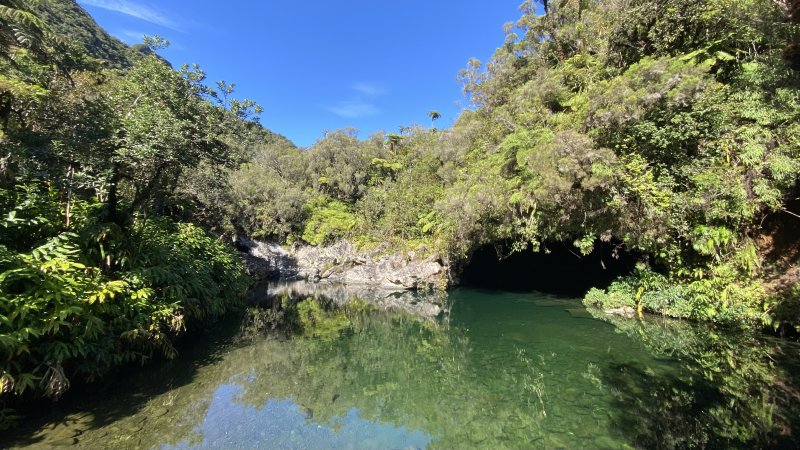Au retour, si l'on prend le sentier de gauche aperçu à mi-parcours, on atteint rapidement la Caverne et le Bassin des Hirondelles alimenté par le Bras Cabot. Le sentier y est aussi boueux que le précédent. Certaines portions entre des roches n'ont que la largeur de la chaussure et les ornières peuvent s'avérer très glissantes. La forêt aux alentours est très belle et à la saison, il faut faire attention où poser les pieds pour ne pas écraser les très nombreuses orchidées qui poussent à même le sentier. Comme il ne reste plus que deux kilomètres pour rejoindre le parking, que l'endroit est agréable malgré les longoses envahissantes, qu'il comporte une grotte ou un grand bassin d'eau claire, on a tout le temps de s'y reposer pour voir les hirondelles voler au-dessus de la forêt. Attention aux très hautes marches et aux racines en travers du chemin pour approcher de près le bassin (Photo 26). Le retour s'effectue par le même itinéraire, en légère montée jusqu'à la route.