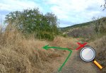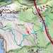 La carte représente la zone entourant le passage sous la Route des Tamarins pour franchir le pont de la Ravine Cocâtre. Les parties vertes correspondent à des portions de piste en très bonne qualité (Est) ou une piste envahie d'herbe (Ouest) mais où on ne se pose pas de question d'itinéraire. La partie rouge est à éviter absolument, voir photo ci-dessous. La portion orange représente la seule difficulté du parcours car la route de service de la société de la RN n'est plus visible. Les différents randonneurs ont tracé un minuscule sentier qui rejoint directement la fin de la descente le long du câble métallique servant de main courante (ouest de la RN) à la piste qui mène au village de la Grande Ravine. Cela représente environ 150 mètres de difficulté mais la trace reste visible sur un terrain pentu et glissant.