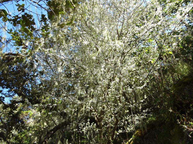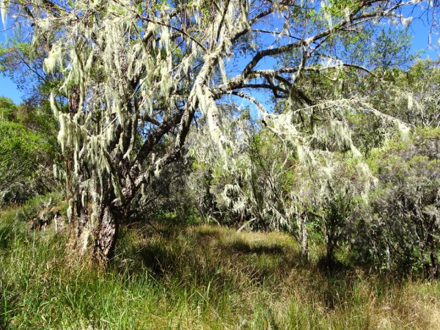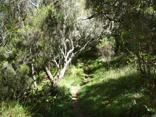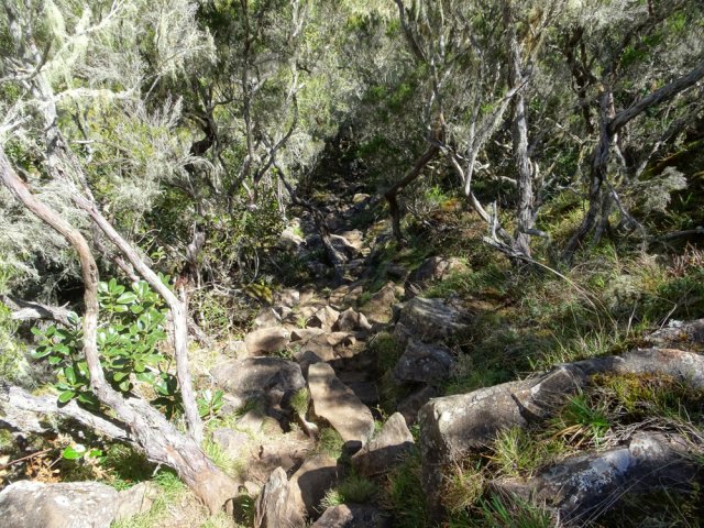 La randonnée débute à la route de l'Ilet à Cordes, aux escaliers raides commençant la montée assez sportive vers le Col du Taïbit. Les lacets sont nombreux pour franchir le rempart qui sépare la route du Plateau des Salazes accueillant un petit îlet. Il rejoint l'Ilet des Salazes, après une belle pente sur un sentier en marches d'escalier bétonnées, empierrées ou soutenues de rondins de bois (Photo 1). La végétation comporte les inévitables chocas, mais également de grands filaos, des eucalyptus et quelques bois de couleurs (Photo 2). Plus haut ce seront des essences moins communes dans les cirques comme les pins, quelques chênes et même des pruniers assez nombreux quand on sait les repérer. Les lacets courts et pentus sont indispensables pour escalader la pente. On bénéficie, tout au long de la montée de superbes panoramas sur les cascades Pitsa et sur les pentes entourant le cirque. Le sentier, très fréquenté, est toujours de bonne qualité, quelle que soit la pente. Après avoir longé une belle plantation d'eucalyptus, il passe au plus près du stand où il est possible de se désaltérer d'une délicieuse tisane chaude ou froide. Il ne faut pas oublier de laisser la pièce après avoir bu et rincé sa tasse au robinet. On passe l'îlet sans trop le voir, mais on peut en garder la visite pour le retour. Le sentier remonte assez fortement entre de grosses roches ayant roulé jusqu'au plateau lors d'un effondrement ancien. On bénéficie depuis cet endroit de magnifiques points de vue sur le Cap Bouteille surmonté du Gros Morne (Photo 3). Le terrain est presque plat en arrivant au plus près du croisement de Cap Bouteille, bien indiqué par un poteau de l'ONF. Partir donc vers la droite, passer près d'un gros pin et entamer une balade sans difficulté sur un tracé bien marqué. La marche s'effectue tout d'abord à l'ombre de grand eucalyptus (Photo 4). Puis le sentier traverse une zone comportant des ruines d'un ancien îlet abandonné depuis fort longtemps (Photo 5). On marche presque à plat jusqu'après le franchissement de la Ravine des Salazes. Le sentier devient plus caillouteux, étroit, et bordé de roches moussues (Photo 6). Il faudra s'habituer à ces pierriers parfois instables jusqu'au point de vue (Photo 7). Heureusement, quelques portions plates dans les herbes bordées de grand branles permettent de souffler un peu (Photo 8). Sur la gauche, toute la crête des Salazes affiche une falaise verticale qui impressionne les randonneurs qui osent affronter l'étroit passage. Du sentier, les trois pointes rocheuses paraissent bien petites, contrairement au moment où on se retrouve au pied (Photo 9). La végétation comporte beaucoup de fleurs jaunes parmi les branles (Photo 10). Le sentier monte de plus en plus et permet de profiter des vues jusqu'au Nez de Bœuf (Photo 14). Le dernier terrain plat rencontré à mi-parcours est couvert de branles cachés par les barbes de Jupiter et semble propice à l'installation d'un îlet (Photo 12). On tombe d'ailleurs très vite devant une nouvelles ruine de ce qui fut une habitation dont il ne subsiste que la cheminée (Photo 13). C'en est fini du plat et on pénètre dans une magnifique forêt semi-primaire. Les nombreux mahots, recouverts de fougères, de mousses et d'épiphytes sont tortueux en raison de la pauvreté du sol (Photo 14). La pente qui devient plus forte se passe sur de nouveaux pierriers qui peuvent être glissants par temps humide (Photo 15). Les grosses roches deviennent plus nombreuses le long du parcours et on arrive à une plus grosse que les autres, fendue en son milieu et bordée de fuchsias (Photo 16). Côté rempart, repérer un rocher se couvrant de plus en plus de végétation. On peut cependant y monter sans grand danger pour profiter de la Tête de Lion et des dernières vues sur Cilaos (Photo 17). Poursuivre, toujours en montée qui effectue même des lacets pour contourner les grosses roches. On distingue parfois la forêt du Cap Bouteille à travers les futaies (Photo 19). On tombe nez à nez avec des pruniers qui se voient de loin lorsqu'ils sont fleuris (Photo 20). Quelques mètres plus loin, deux poteaux de l'ONF indiquent le départ du sentier des Trois Salazes et sont plus facilement discernables que le cairn et la flèche qui demeurent sur les rochers. Laisser cette difficile ascension et poursuivre la montée jusqu'à la source toute proche. Un mince filet d'eau arrive juste à humidifier la mousse recouvrant les roches (Photo 21). Un peu d'escalade est nécessaire pour longer et franchir la ravine humide en amont de la source. Plus loin, la carte indique toujours le point de vue sur Cilaos mais le sentier a presque disparu totalement et l'écart peut s'éviter. Si on le tente, on parvient à une vaste clairière couverte de joncs d'où l'on a de belles vues sur les dents du Gros Morne (Photo 18). Le sentier longe ensuite un talweg humide herbeux où poussent de très hauts arbustes fleurs jaunes (Photo 23). Les premiers tamarins des hauts font leur apparition, difficiles à distinguer tant les troncs sont recouverts (Photo 24). Une dernière pente dans une belle forêt très peu envahie permet de se rapprocher du point de vue (Photo 25). L'espace dégagé offre un magnifique panorama sur les Salazes et le cœur du Piton des Neiges même si on ne distingue pas le fond (Photo 26). Avant de faire demi-tour, il est encore possible de poursuivre la montée sur un sentier qui devient de plus en plus étroit (Photo 27). De là-haut, les points de vue sont toujours là mais de plus en plus cachés par la végétation. Le sentier s'arrête mais les aventuriers pourront poursuivre en hors sentier le long de la crête vers le nord-ouest avant de prendre le chemin inverse pour regagner la route de l'Îlet à Cordes.