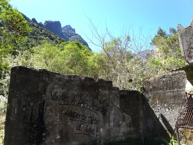 Le Bras Rouge prend naissance au fond d'un immense puits issu de l'effondrement du Piton des Neiges à l'origine de la formation des trois cirques. On voit très bien le lieu en montrant du Piton Carré mais le Parc National en interdit l'accès. Le point de vue de Cap Bouteille, moins bien situé mais plus officiel permet de s'approcher des remparts du cratère d'effondrement et de profiter du panorama malgré la végétation qui envahit les abords du rempart. Un bon coup de rein sera nécessaire au départ de cette courte randonnée pour arriver à l'Ilet des Salazes, situé au premier tiers du sentier du Col du Taïbit. L'itinéraire, souvent rocheux et glissant, ne posera plus guère de difficulté par la suite. La région traversée est sauvage et très peu fréquentée à partir du GRR1. Ne pas hésiter à effectuer une halte à l'Ilet des Salazes où l'association des Trois Salazes a installé un grand kiosque pour permettre aux marcheurs de déguster quelques spécialités culinaires dont d'excellentes tisanes 'péi'. Accueil chaleureux ... quand il y a quelqu'un !!! En regardant au sommet de l'arête, on comprend pourquoi l'îlet se nomme les Salazes. Les trois dents rocheuses sont en effet toujours visibles sur les panoramas ou depuis les points de vue. Le détour vers le premier point de vue, encore présent sur la carte, n'a plus guère d'intérêt puisque l'horizon y est bouché. Le sentier lui-même a presque disparu.