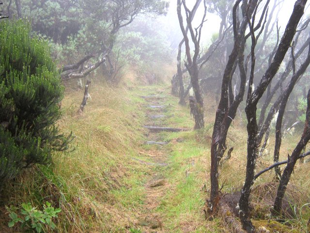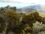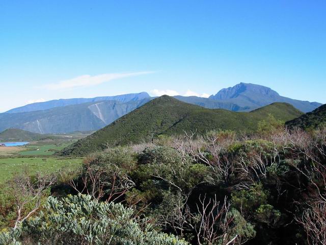La randonnée débute à la route nationale de la Plaine des Palmistes où la très agréable aire de pique-nique du Pont de Trente permet de se garer avant de partir et de se reposer au retour. Après avoir longé la piste, traversé la route de Bourg Murat et rejoint le départ du GRR2, on longe la route du Chalet des Pâtres offrant de splendides panoramas de soleil levant sur le Piton des Neiges (Photo 1). La pente est tout d'abord faible dans les pâturages puis monte un peu plus. La végétation est rare, faite de brandes ou d'ajoncs d'Europe avant de rencontrer quelques bois de couleurs moussus. Dans les prés, des tas de pierres amassées années après années entourent quelques arbres. Avant d'arriver au chalet, on laisse sur la gauche le terrain militaire de la Grande Montée, déjà effleuré lors de la montée au Piton Textor depuis le Piton Doré. Aux habitations du Chalet des Pâtres, prendre à gauche le sentier du GRR2 puis poursuivre par une montée assez raide sur des marches soutenues par des planches et entourées de hauts fanjans et des branles verts (Photo 2). Certaines zones sont déjà couvertes de branles verts qu'on quittera très peu durant la boucle (Photo 3). Plus haut, les clôtures qui entourent les prairies forment une protection barbelée autour d'un magnifique sentier rectiligne (Photo 5). Le sentier est agréable et facile, même s'il faut se méfier un peu des ajoncs qui le bordent parfois. On arrive ainsi au pied du Piton Rouge qu'on aperçoit depuis le départ sur la gauche et qu'on retrouvera en fin de parcours. Les chaussures sont mouillées par la rosée des herbes mais au retour, elles seront crottées et la rosée aura disparu pour les nettoyer un peu ! On domine quelques prairies pour des photos pastorales agréables avec le soleil levant puis on redescend pour longer ensuite toute une région d'élevage (Photo 6). Il faut franchir le Petit et le Grand Bras de Pontho ainsi que quelques affluents en incurvant la randonnée vers le Piton Rouge dont on contourne le pied par le Sud (Photo 1). Heureusement il n'y a jamais d'eau mais on peut remarquer ça et là des petites retenues indiquées sur la carte par des points bleus. On poursuit ces dents de scie avec parfois de petites pentes plus fortes que la moyenne mais de courte durée. Le sentier terreux est également herbeux puisqu'il a été tracé en pleines prairies. Le Piton Rouge s'éloigne et on monte pour mieux dominer toute la région (Photo 8). Les clôtures encadrent le parcours et il faudrait mettre beaucoup de bonne volonté pour s'égarer. Derrière les clôtures, des troupeaux paissent ou se reposent. Il n'est pas rare de voir une vache seule perchée sur un rocher qui dépasse de la prairie et qui semble guetter le reste du troupeau comme le ferait une sentinelle. Le sentier s'élargit, devient piste couverte de basalte et il faut passer quelques échelles. On arrive enfin au plus haut de la boucle où plusieurs sentiers partent dans tous les sens, en direction du Textor ou du Nez de Bœuf qu'on devine à travers les pâturages (Photo 9). La pente a disparu, pas les branles mais des clairières agréables permettent de se reposer de la montée (Photo 10). Pour ne pas manquer la direction du Piton et du Lac Argamasse, marcher sur le sentier jusqu'à une pancarte constituée de 3 planches dont l'une précise "Déviation GR R2" (Photo 11). Le sentier de l'Argamasse commence une quinzaine de mètres avant la pancarte. Il devient alors moins pastoral et traverse les branles verts et les herbes jusqu'au lac. Cette retenue d'eau, très peu profonde, fait penser à une tourbière mais peut être très belle par beau temps surtout si le Piton Argamasse s'y reflète. (Photo 12). La boucle se poursuit en effectuant le tour du lac et en remontant vers le Piton Misère et le Piton Rouge. La montée est tout d'abord très douce et agréable dans les branles verts, gris et velours blancs sur un sentier herbeux. Les panoramas changent un peu avec la forêt de Bélouve et le Mazerin à l'horizon (Photo 13) ou la Plaine des Palmistes qui apparaît du côté de la Petite Plaine (Photo 14). On laisse sur la droite le Piton des Herbes Blanches puis on se rapproche du Piton Misère. L'humidité, constante dans ces régions, favorise la pousse des mousses sur les troncs (Photo 15). Après avoir passé le Piton Misère, il devient une horreur boueuse extrêmement glissante (Photo 16). Il faut constamment chercher les rares cailloux, les racines ou les joncs pour tenter de passer sans trop remplir les chaussures. Heureusement, certaines parties sont plus propres et l'herbe peut même servir à nettoyer les semelles (Photo 17). Après 2 kilomètres d'équilibre instable et de risques de chutes, on attaque la montée du Piton Rouge. On retrouve un peu de gadoue mais rien de comparable. Le sentier est en règle générale facile et propre entre les branles verts (Photo 19). On atteint le sommet du Piton Rouge après une dernière montée assez forte. En se retournant, on distingue bien le sentier qu'on vient d'utiliser (Photo 20). La descente par de nombreux lacets est aussi rapide mais la boue a presque totalement disparu, rendant le cheminement agréable (Photo 22). A l'horizon, la retenue des Herbes Blanches annonce la fin proche de la boucle (Photo 23). On passe une grande clairière (Photo 25) qu'on rejoint par un sentier qui est resté sec et agréable (Photo 26). La dernière descente, un peu forte également, ramène aux prairies qu'on devine depuis le haut (Photo 27). Le sentier oblique à gauche et repart plein sud pour contourner le piton et se termine près de platanes qu'on a du mal à reconnaître s'ils n'ont pas leurs feuilles tant il y a de mousses et de fougères sur leurs ramures (Photo 28). On retrouve avec plaisir le sentier du départ pour rejoindre assez vite le Chalet des Pâtres, protégé par les clôtures latérales. On ne voit pas les chiens mais ils nous font savoir bruyamment qu'i