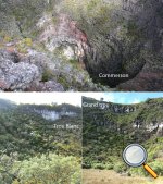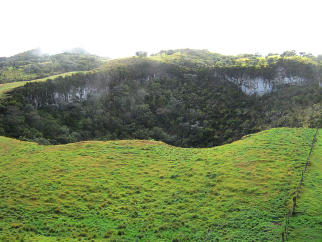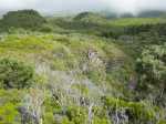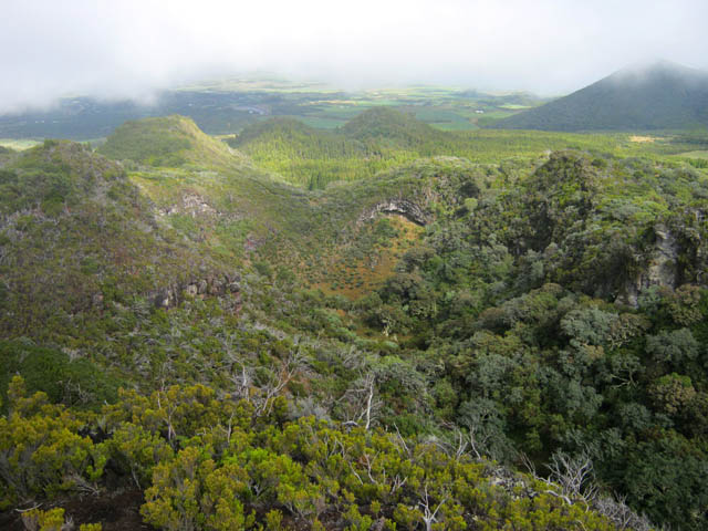 La randonnée aux Trous de Cissia explique la formation d'un maar. Ceux de Grand Coude sont petits et étroits. Les Trous Blancs sont d'une toute autre dimension ; ils sont larges et profonds et on peut en faire complètement le tour et même descendre au fond pour mieux appréhender leur profondeur. Certaines cartes nomment Trou Blanc le plus haut et Grand trou le plus bas et le plus impressionnant. On voit bien que l'activité hydraulique et magmatique de l'époque n'avaient rien à voir avec "l'éternuement" de Grand Coude. Ici, le terrain chaotique et la surface de la zone touchée montrent bien une ampleur spectaculaire. En plus de ces curiosités géologiques que sont les maars, on a la chance de rencontrer en début de randonnée un magnifique spécimen de Tamarins des Hauts (le Tamarin Dodo, photo 2) qui était déjà bien âgé lorsque le plus vieux réunionnais est né sur l'île. Enfin, les prairies et les petits cratères anciens qui les parsèment sont un régal pour les yeux (photos 1, 3 et 4) et même pour les oreilles avec le bruit des cloches qui nous ramène à nos dernières vacances dans les Alpes.