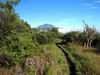 La courte et facile randonnée débute à la Route Forestière du Volcan mais peut se raccourcir en commençant aux kiosques de pique-nique proches des Trous Blancs et du Piton Guichard. On commence par une piste bordée de jeunes cryptomerias partant de la route et reliant les prairies (Photo 1). Se rapprocher, en marchant vers la gauche, des prairies bordées par une forêt de cryptomerias. Le sentier suit d'abord les barbelés qui entourent les prairies dans lesquelles on peut souvent voir de grands troupeaux (Photo 1). Poursuivre, toujours le long de la clôture jusqu'au Tamarin Dodo. Aucune pancarte n'indique son emplacement mais il est impossible à manquer par son imposante stature. Avec ses 7 mètres de circonférence pour 400 années à vivre à cette altitude, il est considéré comme le plus vieux tamarin de l'île où il a vu arriver les premiers colons. Espérons qu'il vivra encore longtemps et qu'il sera préservé des cyclones et incendies, ainsi que du piétinement car ses branches basses en font un excellent terrain de jeu. Remarquer d'autres tamarins isolés dans les prairies. Ils sont beaucoup plus jeunes mais parfois aussi beaux (Photo 5). Poursuivre sur le sentier en direction du Nez de Bœuf pour profiter ainsi de plus en plus de panoramas sur le Piton des Neiges (Photo 6). Le sentier traverse des zones incendiées qui se régénèrent lentement (Photo 8). Plus on s'élève et plus les panoramas grandissent vers Bourg Murat (Photo 9) et l'on domine le Piton Guichard et la forêt de cryptomerias qui l'entoure (Photo 10). Le sentier s'élève au-delà des 2000 mètres avant de redescendre vers les Trous Blancs. Si on dispose de temps, il est conseillé de rejoindre la route du volcan, la traverser et grimper au sommet du Nez de Bœuf pour des panoramas d'anthologie (non représenté ici sur la carte). Sinon, poursuivre vers le sud pour rejoindre le premier trou blanc en traversant de grandes étendues de branles verts (Photo 13). Le sentier parvient à un croisement surmonté d'un rocher caractéristique servant de promontoire pour admirer la région. A partir de ce croisement on peut décider de contourner les Trous dans le sens horaire inverse ; dans ce cas, on passera deux fois au même endroit pour une moitié de la boucle. Cette solution, plus longue mais guère difficile, permet de parcourir toute la zone de ce phénomène géologique rare. Il est possible également de filer directement sur le sentier de gauche. Le circuit ci-dessous utilise la première solution. On peut, à plusieurs reprises, traverser les 10 mètres de végétation et observer Grand Trou sous plusieurs angles (Photo 14). Arrivé au croisement des sentiers vers le Tamarin Dodo, il suffit alors de reprendre le sentier qui remonte à gauche et permet d'atteindre le bord de Grand Trou, là où une petite sente partant à gauche rejoint sans danger le fond du maar. Aucune indication pour la dénicher hormis les traces de passages des curieux qui ont décidé de visiter le fond marécageux. Pour ne pas la manquer, se diriger vers le point le plus bas du rempart qui entoure le grand maar (voir carte). De là, on a des vues très différentes de l'ensemble et on peut mieux estimer la profondeur et imaginer la puissance de l'explosion à l'origine de ce cratère (Photo 18). Le fond est presque plat et couvert de joncs (Photo 20). Reprendre le sentier pour sortir du cratère puis prendre à gauche pour grimper vers le rocher observatoire pour boucler la boucle. C'est lors de cette montée, un peu forte mais courte qu'on a les meilleurs vues sur le phénomène (Photo 22). On remarque mieux la mare envahie de joncs qu'on vient de fouler du pied (Photo 23). Poursuivre la montée jusqu'au deuxième maar, enfermé dans une prairie et dont on peut faire une belle photo depuis le fameux rocher (Photo 25).La photo 26 a été prise depuis le bord du maar supérieur mais cela implique de sauter la clôture, à ne pas faire surtout s'il y a des troupeaux. Espérons qu'un jour, l'ONF obtiendra un droit de passage de moins d'un mètre de largeur afin de pouvoir s'en approcher au plus près sans pénétrer dans une propriété privée.