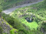 La randonnée débute à Pont d'Yves avec très peu de place pour garer un véhicule au fond de la petite impasse. Le sentier, assez abrupt, descend à flanc de falaise (Photo 1) jusqu'à la rivière, un peu en amont de la Caverne de la Petite Ravine en alternant terre, marches plus ou moins hautes et rondins sans oublier les grosses pierres (Photo 2). Il donne une bonne idée de celui qu'il faudra remonter à partir de Grand Bassin pour terminer la sortie en forte pente. La végétation pauvre en bois de couleurs mais riche en pestes de toutes sortes empêche souvent les points de vue sur la vallée. Quand on peut voir au loin, c'est pour se retrouver face à une falaise coupée verticalement par la très haute chute de la Ravine de l'Argamasse (Photo 2) qui arrive du hameau du même nom, déjà visité par les Sentiers des Trophées Mondiaux ou Le Doyen. On arrive en une vingtaine de minutes de descente continue aux berges du Bras de la Plaine qu'on entend couler depuis le sommet (Photo 4). A gauche débutent les itinéraires vers les gorges ou l'Îlet Tata. A droite, suivre la piste détruite ayant servi à la réfection du barrage. Plus loin, marcher aux meilleurs endroits du terrain en longeant au plus près le torrent. Dans un virage de la rivière vers la gauche, en face, ne pas manquer le départ du sentier repérable à la peinture blanche sur les galets. Dès qu'on a franchi la butte très glissante constituée de sable et de galets mélangés, le sentier, de très bonne qualité apparaît (Photo 6). Il chemine à l'ombre de faux poivriers le long d'une canalisation qui est soit aérienne, soit enterrée et recouverte du sentier lui-même, donc droit et plat. Les petites ravines sont traversées par des passerelles qui soutiennent le tuyau et on les franchit (Photo 7). Prendre à droite pour éviter l'édifice rouillé et traverser le Bras Sec. On passe également une large passerelle en bois (Photo 8) d'où l'on bénéficie de beaux points de vue sur la rivière (Photo 9). A Grand Coin, le sentier se sépare en deux : à gauche, marcher sur la passerelle pour avoir un point de vue sur le barrage du Bras de la Plaine puis revenir à droite pour emprunter le sentier désormais officiel. Il est étroit, bordé de chocas et domine le précipice vers la rivière, monte en pente légère et finit en haut du barrage, en rive gauche. Profiter du mur bétonné pour étudier les installations et poursuivre vers l'amont. Quatre kilomètres de rivière attendent le marcheur pour rejoindre le pied de la cascade de Grand Bassin. Certaines traces sont bien visibles le long de la rivière et des barres rocheuses qui la longent (Photo 10). Marcher quelques minutes au plus près de l'eau avant d'emprunter le sentier qui part sur la droite en longeant une nouvelle canalisation (Photo 11). Passer une nouvelle fois la rivière et suivre les traces de peinture de plusieurs couleurs sur les galets vers le prochain gîte (Photo 12). On remarque plusieurs habitations dans la verdure des berges dominant le bras. Puis, après un bassin, traverser pour rejoindre le l'Îlet Paradisiaque pour s'y désaltérer si les installations sont ouvertes au public (Photo 13). L'endroit est effectivement charmant et incite à y venir passer une nuit. Sinon, poursuivre pour retrouver un nouveau sentier qui grimpe sur la falaise dans une végétation touffue (Photo 14). On frôle une adorable petite case blanche dans les bananiers avant de parvenir aux tentes de l'Îlet Boulon. Le sentier se poursuit encore quelques centaines de mètres pour se terminer sur la berge. On alterne alors entre les parties larges remplies de galets et de sable, les zones étroites et encaissées, les hautes herbes, les touffes de bois de chapelets, les gués plus ou moins larges et l'on voit se rapprocher les hautes falaises vers Grand Bassin. La rivière est toujours aussi fougueuse (Photo 15). Les falaises abruptes du Contour Vaquérois au pied du Piton Petit Louis se passent tout aussi facilement que la rivière en se mouillant les pieds si nécessaire (Photo 16). Une petite canalisation subsiste sur la paroi verticale mais ne doit plus avoir d'eau depuis longtemps (Photo 17). Sur la gauche coulent de petites cascades (Photo 18). Traverser le Bras des Roches Noires au fond plus rocheux que tout ce qu'on vient de remonter (Photo 19) et marcher en direction de la cascade du Voile de la Mariée en franchissant une surface importante de hautes herbes, longoses et cannes fourragères (Photo 20). La baignade est très souvent possible et représente une agréable récréation en saison chaude. Le sentier qui remonte à Grand Bassin grimpe fortement au départ et devient plus plat à la hauteur du haut de la chute. On peut s'approcher du haut de la falaise mais attention de ne pas glisser des rochers pour une autre vue de cette belle chute (Photo 21). La remontée à Grand Bassin puis Bois Court, très classique à la Réunion, passe par un sentier qui franchit un gué du Bras de Sainte-Suzanne, traverse quelques champs et vergers microscopiques avant d'arriver dans les "rues" étroites du village, bordées de murs en pierres sèches (Photo 22). Sèches n'est pas toujours l'adjectif qui convient car la mousse et l'humidité de ce fond de vallée les rendent souvent humides ! Partout dans le village, des gîtes permettent de se ravitailler ou se désaltérer avant d'attaquer la forte pente maintes fois décrite vers le belvédère de l'Horloge à Eau. La remontée est longue, comporte de hautes marches et semble ne jamais finir. D'importants travaux d'aménagements hydrauliques ont un peu modifié le paysage mais des escaliers et passerelles évitent de les enjamber (photo 23). Les lacets sont nombreux, souvent caillouteux mais en prenant son temps on est certain d'arriver sans trop de fatigue. Les points de vue sur Grand Bassin ou les vallées sont nombreux (Photo 24). Le plus agréables de tous et de pouvoir revoir de haut la cascade qui a marq