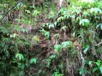 Lorsqu'on regarde la carte au nord du Tévelave on est frappé par le nombre important de cercles bleus représentant chaque fois une source. En y regardant de plus près on remarque également des pointillés indiquant que quelques sentiers sont répertoriés. Le sentier emprunté sur cette page n'apparaît pas sur la carte. La région est effectivement très humide et malgré la végétation parfois dense, il est pratiquement impossible de s'y perdre car on rencontre à tout bout de champ des tuyaux en fonte ou en plastique dans lesquels on entend l'eau circuler ou s'enfuir par de petites ou grosses fissures. On remarque également sur la carte des traits verts. Quand on arrive sur l'emplacement, on remarque très vite que ce sont de larges allées qui ont été plantées d'une seule rangée d'arbres, très souvent des cryptomerias. Entre les troncs souvent envahis de longoses on remarque pourtant des sentiers étroits montrant que quelqu'un passe ici de temps en temps. La randonnée de la Source Dussac permet de rencontrer 5 prises d'eaux sur de petits cours d'eau qui, à eux seuls, ne pourraient pas alimenter les populations des bas.
