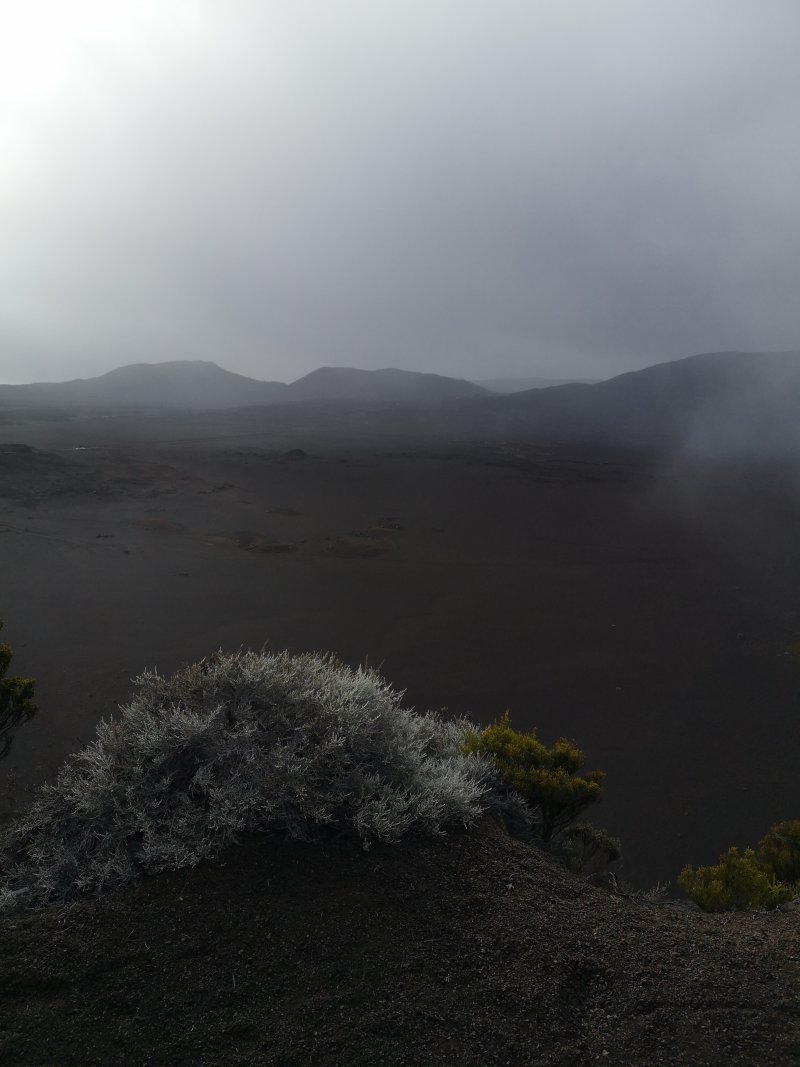 La randonnée débute au parking du Pas des Sables juste avant la plongée en lacets de la route vers la Plaine des Sables (Photo 2). On remarque très bien la fin du goudron rouge et le début de la piste défoncée la moitié de l'année qui termine le trajet vers le Pas de Bellecombe. Par temps sec, la poussière dégagée par les véhicules crée de longues trainées. Traverser la route et profiter avant d'effectuer l'aller-retour des points de vue qui ont été aménagés et qui sont bien indiqués par de petites pancartes. Ils dominent la plaine et permettent de bien en apprécier la taille jusqu'au Piton Chisny. Il n'y a pas que sur la gauche qu'on profitera de beaux panoramas. De l'autre côté, le Piton des Neiges qui dépasse sera visible tout au long de la randonnée (Photo 3). Prendre ensuite le sentier large et facile qui longe très souvent le rempart donnant sur la Plaine des Sables (Photo 4). Les montées y sont rares ou très courtes. Le seul danger provient des sables glissants par endroits ou de la proximité du rempart non sécurisé ; bien surveiller les enfants pour ces courts passages. Le sentier alterne des portions sableuses et d'autres beaucoup plus caillouteuses bordées de branles verts rabougris ou des petits tamarins ayant beaucoup de mal à survivre (Photo 6). On s'éloigne sans effort du Pas des Sables qu'on peut distinguer dans son ensemble en se retournant (Photo 7). On a sous les yeux l'ensemble du morne qui se présente sous la forme d'une pente légère recouverte d'une végétation pauvre (Photo 8). De nombreux emplacement en bordure de rempart permettent d'admirer la Plaine des Sables, le Chisny et la Fournaise (Photo 9). La fournaise se détache de plus en plus au fur et à mesure du cheminement (Photo 12). C'est du bord de ce rempart qu'on peut le mieux admirer ces plaques rouges et ocre au cœur de la Plaine des Sables (Photo 14). Les couleurs sont plus ou moins marquées en fonction de la lumière ou de la position du soleil (Photo 15). Les contrastes entre ombre et lumière font bien apparaître des couleurs chaudes du plus bel effet (Photo 16). On rencontre quelques touffes de fleurs jaunes ou des petits tamarins réduits à l'état de bonzaïs où viennent parfois se ravitailler en nectar quelques oiseaux verts reconnaissables à leur paire de lunettes caractéristique (Photo 11). Le sentier frôle une arche et une petite grotte à mi-parcours. Plus loin, juste avant d'arriver aux antennes, une grotte plus profonde demande un petit écart d'une quinzaine de mètres. Elle peut abriter 3 ou 4 personnes pour un casse croûte ou un abri salutaire en cas de pluie. Quelques traces de branchages laissent à penser qu'elle est parfois utilisée pour des bivouacs malgré le manque d'eau. Très bien indiquées sur les cartes IGN, elles sont faciles à découvrir. Le sentier devient de plus en plus caillouteux et impose de garder les yeux au sol (Photo 18). Sur la gauche, après les taches colorées, arrive l'impressionnant cassé en direction de Grand Pays. On remarque très bien la large coulée qui tombait en cascade dans le vide avant de se solidifier (Photo 19). On peut même repérer des cassés creusés par les eaux durant les forts épisodes pluvieux (Photo 20). On a de belles vues sur le Piton Rouge et la Fournaise (Photo 22). Le sentier, toujours aussi facile et agréable mélange comme depuis le début terre, sable et roches (Photo 23). Les arbres qui ont atteint une taille plus importante et l'antenne du poste de secours du PGHM indiquent l'arrivée proche au premier point de vue (Photo 24). Une petite descente amène sans efforts au discret belvédère caillouteux (Photo 25). Les points de vue sur Grand Pays ou vers le Sud sont assez impressionnants et on peut chercher des yeux le sentier partant de la route du volcan vers Grand Galet (Photo 26). Sur la droite, depuis le belvédère ou en marchant un peu sur le sentier qui redescend en longeant le rempart, on bénéficie de nouveaux beaux panoramas de Grand Coude jusqu'à Saint-Pierre (Photo 27). Dans cette région, les vents sont souvent assez forts ou les nuages ont envahi les lieux et bouchent le paysage. Comme la randonnée est facile, ne pas hésiter à partir tôt, même si la glace est présente sur le sentier, certains matins en période hivernale (Photo 1). Le retour s'effectue par le même itinéraire pour environ la même durée de marche.