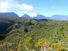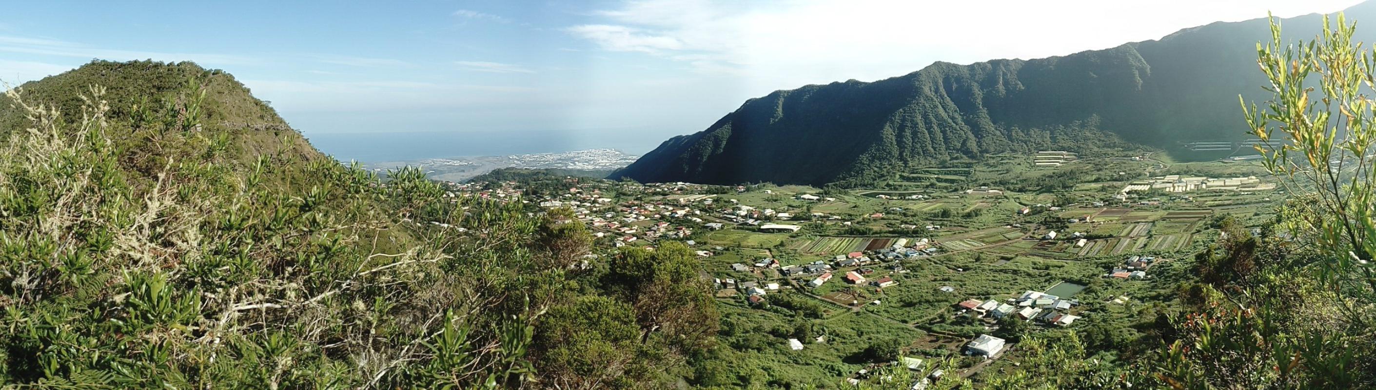 La randonnée débute à la fin officielle de la Route Forestière de la Plaine d'Affouches qui se poursuit longuement après la barrière qui interdit l'accès en raison des chutes de pierres fréquentes. Un kiosque marque le départ du sentier. On y trouve une pancarte explicative puis deux départs de sentiers (Photo 1) ; celui de droite est le Sentier des Lataniers qui rejoint Dos d'Ane par des dizaines de contournements de ravines et celui de gauche qui ira presque en ligne droite rejoindre le Rempart de Mafate à 5 km du kiosque. Avant de partir, ne surtout pas manquer le superbe point de vue sur l'Îlet à Guillaume d'où l'on peut apercevoir les restes de la grande case centrale dans son écrin de verdure jaunie par le feuillage des camphriers. On attaque immédiatement par une pente assez forte qui fait craindre le pire (Photo 2). Très vite, après quelques lacets, la pente se calme et on chemine à l'ombre d'une forêt de bois de couleurs. Le sentier glissant est couvert d'herbe très verte et il comporte des racines qui obligent à lever le pied et regarder où on les pose. Sans grande transition, on arrive au Piton de la Grande Chaloupe et les branles verts et fougères remplacent les bois de couleurs (Photo 3). Le sentier est magnifique et très facile malgré la pente moyenne (Photo 4). Certains passages usés par les semelles sont assez glissants mais le vide à côté n'est jamais dangereux (Photo 5). Les premiers tamarins des Hauts font leur apparition mais n'atteignent pas des tailles extraordinaires (Photo 6). Les larges panoramas englobent toute les forêts alentour (Photo 7). Sur la droite, à moitié cachée par les Fougères, la ville du port apparaît à l'horizon (Photo 8). On commence alors à cheminer en ligne de crête sur un sentier en pente douce qui domine la Plaine d'Affouches (Photo 9). Pas de grands affouches dépassant de la forêt mais une mer de verdure avec, sur la gauche, la vallée encaissée de la Rivière Saint-Denis (Photo 10). Les premiers pitons de Mafate se montrent à l'horizon et plus on va vers le Sud, plus ils grandiront (Photo 11). Le sentier est toujours aussi exceptionnel malgré son étroitesse et la marche est un réel plaisir (Photo 13). Quelques petites pentes ou descentes amènent tranquillement au sommet du Piton Batard qui permet des vues à près de 360° un peu masquées par la végétation des branles verts (Photo 14). Profiter du vaste panorama avant d'entamer la descente (Photo 15 et ( 16). La seule difficulté de la matinée se présente alors par la descente de ce piton pourtant très discret. Le sentier y est étroit, envahi de cailloux et de racines, bordé de beaux bois de couleurs et de jouvences humides. La boue est très fréquente mais c'est surtout la pente qui pose problème car elle est assez abrupte par moments (Photo 17). Heureusement c'est de courte durée. Le sentier va longer sur un kilomètre le cirque de Dos d'Ane qu'on devine à travers les brandes (Photo 18). On retrouve le plat et on poursuit vers le Sud. 200 mètres après la fin de la descente, les plus curieux chercheront des yeux, sur la droite, le départ très discret du sentier qui rejoint Grand Coin. On arrive ainsi à l'approche du Piton Fougères mais il faudra auparavant effectuer un détour de 400 mètres vers l'Est. Inutile, sur les 10 hectares qui arrivent, de se poser la question de savoir comment ce piton a pu être baptisé ainsi : les fougères y sont tellement serrées qu'on aurait du mal à les traverser sans coupe-coupe. Une aire circulaire, vestige d'un ancien kiosque, marque la fin de ce sentier qui vient de rejoindre le GGR2. A partir de cette petite clairière, on aura sur le Cirque de Mafate les plus beaux panoramas sur les Crêtes d'Aurère et de la Marianne. On voit très bien la Roche Ecrite, le Cimendef et bien sûr le Gros Morne ainsi que presque tous les îlets du cirque. Poursuivre en cheminant à plat pour un temps sur un GR de très bonne qualité malgré quelques portions boueuses (Photo 19). Très vite, le sentier se met à descendre de plus en plus au milieu des nombreuses pierres qui semblent parfois barrer le passage. Les vues sur Trois Bras et la Roche Verre Bouteille sont vertigineuses (Photo 20). La végétation rend moins vertigineux les points de vue sur le village de Dos d'Ane (Photo 21). Faire attention sur certaines portions non protégées du vide où une glissade n'aurait rien de ludique. On arrive ainsi à la Roche Verre Bouteille (Photo 22).Après une visite ou un tour du monolithe, prendre le sentier de gauche et marcher en direction de Cap Noir. Le sentier est tout d'abord plat et facile (Photo 23). Les panoramas sur Mafate sont encore plus grandioses qu'au Piton Fougères car on a les crêtes toutes en longueur (Photo 24). Le sentier devient de plus en plus pentu, rocheux et technique. Heureusement, plusieurs échelles permettent de passer les obstacles les plus difficiles (Photo 25). On domine longuement l'Îlet Nourry et Deux Bras (Photo 26). Le sentier s'assagit et passe au plus près du kiosque pour profiter de la table d'orientation (Photo 27). Celle donnant sur le cirque a été effacée par le soleil mais on repère vite les lieux caractéristiques (Photo 28). Une rambarde borde le vide au départ du sentier vers Dos d'Ane qui effectue ensuite quelques courtes montées et descentes sur un sol terreux et le plus souvent caillouteux. On parvient au croisement avec le sentier venant de la Roche Verre Bouteille et une courte mais forte descente mène à la route et au parking. Retrouver un véhicule laissé là ou descendre vers Dos d'Ane par le Chemin de Cap Noir pour emprunter un bus ou faire demi-tour jusqu'au kiosque d'Affouches, mais attention à la fatigue pour remonter au Piton Fougères.