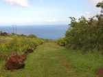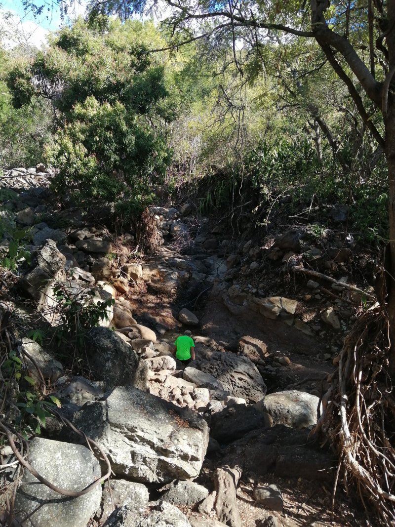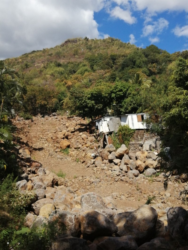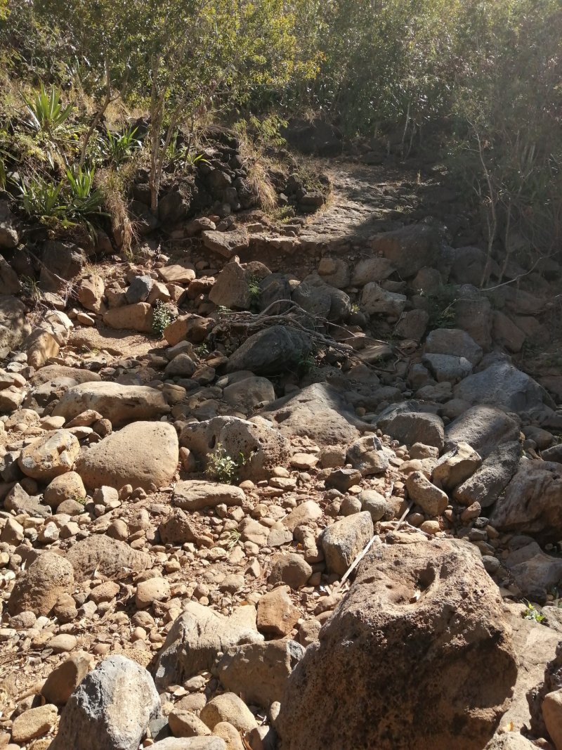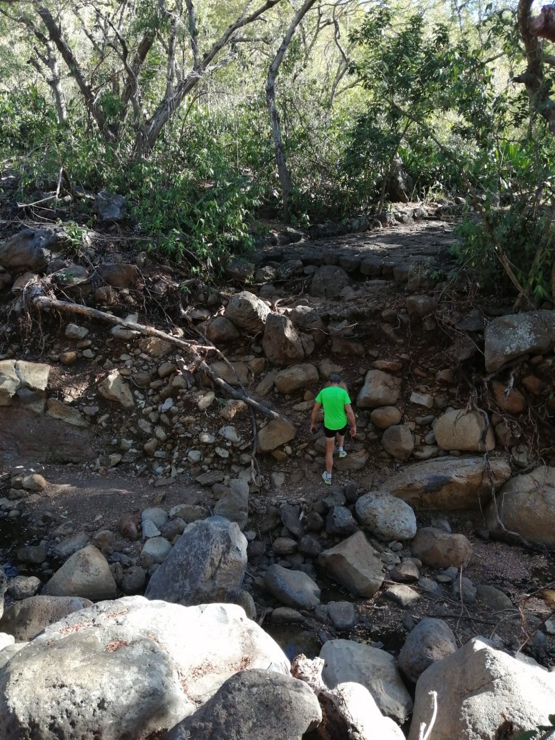 La randonnée débute à La Possession, tout près du premier rond-point de la route de La Montagne près de l'EHPAD des Lataniers. Après avoir franchi le gué de la Ravine Lafleur et du Petit Ruisseau, la montée est immédiate sur les premiers pavages de pierres plates. Le chemin pavé effectue des lacets serrés et l'on a du mal à imaginer les pauvres bœufs en train de tirer une charrette (Photo 1). La montée est assez forte, surtout dans les lacets, et met à mal les jambes qui ne sont pas encore réchauffées. On passe sous les bois noirs des bas dont les gousses jaunes bruissent au moindre souffle. Lorsque la piste pavée est assez large, on voit très bien la bande centrale constituée de pierres plus larges, très pratique pour marcher sans trébucher (Photo 2). Compter une dizaine de ces lacets plus ou moins longs mais comportant des grimpettes impressionnantes (Photo 3). Plus haut, la végétation constituée de faux poivriers, acacias, chocas ou avocats marrons pousse comme elle peut dans les roches surchauffées. Quand les arbres diminuent ils sont remplacés par des herbes souvent hautes et jaunies par les sécheresses successives et par de petits épineux ou arbustes. Seuls les grands tamarins tirent leur épingle du jeu avec leurs racines descendant à des dizaines de mètres sous terre. Après 150 m de montée, les vues se dégagent vers la mer et la ville du Port (Photo 4). La marche devient très facile le long de la courbe de niveau en direction du nord. La piste est large et de plus en plus souvent rectiligne (Photo 5). Une légère descente s'accentue de plus en plus pour franchir la Ravine à Malheur. La pente est plus sérieuse mais de très courte durée pour remonter en rive droite et retrouver le plateau. Les arbres sont parfois plus hauts mais arrivent à peine à procurer de l'ombre (Photo 7). Les zones pavées disparaissent parfois pour faire place à la terre et à des portions plus étroites en raison des hautes herbes qui ne sont pas tondues régulièrement (Photo 8). Certaines zones plus plates peuvent être humides après les pluies mais on trouve toujours un passage (Photo 9). Le chemin passe également près du rempart pour des vues plongeantes vers la mer mais il n'est pas toujours facile d'apercevoir la Nouvelle Route de Littoral. Plus loin, après une longue marche à plat, une nouvelle descente se présente pour franchir la Ravine de La Petite Chaloupe (Photo 10). Il faut encore emprunter quelques lacets pour descendre d'une cinquantaine de mètres et franchir la ravine au fond caillouteux où la piste originelle a disparu. On retrouve peu de plat avant de parvenir en bordure de rempart de la vallée de la Ravine de La Chaloupe mais la piste est de bonne qualité (Photo 11). Ne pas manquer, sur la gauche, le belvédère du point de vue sur La Grande Chaloupe (Photo 12). On voit très bien ce petit hameau perdu dès que la route du Littoral est fermée en période d'alerte cyclonique. Le chantier de la NRL occupe le centre du panorama. C'est reparti pour une dizaine de nouveaux lacets. On distingue de mieux en mieux les premières maisons sur une longue descente où la piste est bordée de lianes carrées, ces cactus sans piquants poussant en grandes touffes (Photo 13). On remarque d'autres habitations isolées en regardant vers l'amont de la Ravine de la Grande Chaloupe (Photo 14). La piste est de qualité très variable le long de la pente. On rencontre des lacets serrés, des zones défoncées ou de longues portions bordées de chocas et d'acacias (Photo 15). On parvient ainsi à la piste bétonnée traversant La Grande Chaloupe. On frôle un temple avant de longer de gros stocks de filets de protection des falaises. Ce lieu chargé d'histoire se traverse en passant près de l'ancien lazaret transformé en musée. Une courte halte permet d'en apprécier l'histoire en visitant rapidement les abords ou le cimetière (Photo 16). Ne pas manquer une visite plus complète au retour si aucune autre destination n'est prévue à St-Bernard. Plus loin c'est la gare et sa vieille locomotive qu'on rencontre avant de poursuivre sur le Chemin Crémont (Photo 17). Marcher presque jusqu'à la fin de la petite route puis repartir à l'assaut du rempart de la Ravine de La Grande Chaloupe par des lacets courts et étroits sur une pente beaucoup plus forte qu'au départ à La Possession (Photo 18). Le sol est constitué de gros pierriers incultes où toute végétation a du mal à s'implanter (Photo 19). La piste comporte encore quelques goulets créés par des effondrements ou des pousses de tamarins qui empêchent tout passage de charrette (Photo 20). Depuis certains lacets on peut revoir le village et apprécier l'état du chantier de la NRL dont les premiers piliers commencent à cet endroit pour créer un très long pont qui se termine au Barachois (Photo 21). L'état de la piste pavée est toujours aussi bon et l'on chemine sans grande difficulté le long des pierriers encombrés de tamarins (Photo 22). Deux croix et un oratoire demandant aux passants de prier pour les disparus marquent la fin de la rude montée en lacets (Photo 23). Au dernier lacet, il est possible de partir vers la gauche en empruntant une sente discrète qui s'approche au plus près du rempart. Des grillages recouvrent la falaise et on peut apercevoir les véhicules qui filent sur la route du littoral. C'est également de cet endroit que la vue est la meilleure sur les travaux pharaoniques de la Nouvelle Route du Littoral qui serpente à quelques dizaines de mètres de l'ancienne (Photo 24). Plus loin, on bifurque à angle droit pour remonter vers St-Bernard sur une piste large et droite (Photo 25). La pente est moyenne mais constante sur un sol souvent herbeux. On bénéficie des derniers points de vue sur l'océan (Photo 26). La végétation, depuis la fin des lacets, a repris possession du plateau (Photo 27). Les derniers hectomètres comportent de moins en moins de pavage. En fonct