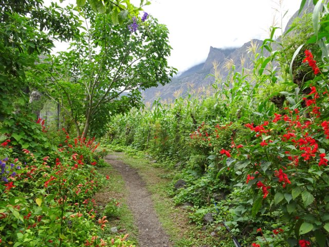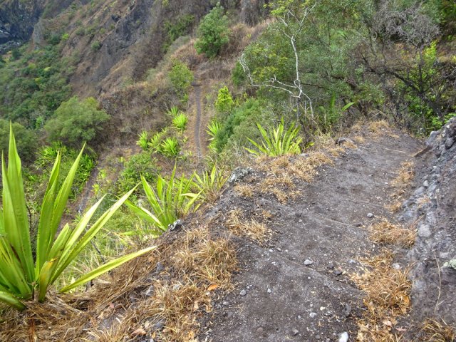 Le début est un classique du genre avec la descente du Maïdo vers Roche Plate précédée d'une courte traversée de laves anciennes à partir de la route. La croix blanche qui marquait le début de la descente a disparu mais pas les premiers panoramas exceptionnels sur Mafate et le Gros Morne, même au petit matin avec un soleil à peine levé (Photo 1). La pente est forte et les constants "freinages" mettent déjà à mal les muscles et les articulations (Photo 2). Profiter des magnifiques paysages en direction des Orangers (Photo 3). La portion plus plate en début de descente sera la bienvenue au retour pour souffler un peu. Les genoux ont déjà souffert en arrivant à l'escalier de la Brèche où les gens sujets au vertige cramponnent fermement le câble fixé à la paroi (Photo 4). On a sous les yeux la totalité de Roche Plate qui comporte des habitations jusqu'au pied du Bronchard (Photo 5). La portion qui va de la Brèche à Roche Plate est en pente agréable et permet de souffler un peu. On voit très bien le petit pain de sucre du Maïdo 900 m plus haut (Photo 6). Plusieurs gîtes se rencontrent dans le village pour une pause café ou jus de fruit mais il ne faut pas trop traîner car on est à peine au cinquième de la journée et il vaut mieux réserver cette pause pour le retour. La traversée de l'îlet est très agréable car à plat et ombragée. Les cases, pour la plupart fleuries, sont éparpillées sur une grande surface (Photo 7). On parvient rapidement au col situé au pied du Bronchard avec de larges vues sur le Piton des Calumets (Photo 8). Délaisser le sentier qui file droit vers la Nouvelle et descendre à gauche vers la Roche Ancrée en passant au plus près du Cimetière du Bronchard qu'on aperçoit de loin et qui semble de plus en plus abandonné (Photo 9). La vertigineuse pente se descend sur un sentier étroit, comportant des lacets et une multitude de marches qui retiennent le sable (Photo 10). Les deux images de la photo 11 donnent une très bonne idée de la pente, de la hauteur des marches et des cailloux qui l'encombrent. Si un randonneur est sur le sentier on ne voit que le chapeau et le haut du sac à dos ! Il ne faut donc pas oublier cette difficulté pour le retour (Photo 12). Une halte est possible près de la petite chute d'eau de la Ravine de Roche Plate qu'on traverse en fin de descente où se baignent souvent des randonneurs partant pour des circuits plus courts. Mais avant d'atteindre ce bassin alimenté par une petite chute il faudra grimper de nouveau puis descendre très fortement vers la Rivière des Galets (Photo 14). Les lacets se succèdent pour de nombreuses vues plongeantes (Photo 15). On parvient à la Rivière des Galets où il faut chercher le bon passage en suivant les balises blanches pour poursuivre vers Grand Place. Une petite chute d'eau alimente un grand bassin plus ou moins rempli en fonction de la saison (Photo 16). Le fond de la rivière est encombré de nombreux rochers énormes et le sentier qui remontait la rivière a été emporté par un gros éboulis vers le Cap Noir (Photo 17). Si, depuis le Maïdo, on est beaucoup descendu, il va falloir se préparer à la première montée sérieuse de la journée en direction du Piton des Calumets qui a bien grossi depuis le départ (Photo 18). On commence à l'ombre sur un sentier qui part en direction du Cap Noir sur des marches (Photo 19). Laisser les vestiges du sentier du Cap Noir qu'on distingue de moins en moins et obliquer à gauche sur une pente faible. Très vite la pente s'accentue sur de courts lacets poussiéreux (Photo 20). Le Piton des Calumets devient de plus en plus impressionnant et infranchissable. Si les faces visibles sont effectivement infranchissables, il en est autrement de la troisième, invisible depuis le sentier qui contourne le pic (Photo 21). Après le passage d'une première ravine, la pente s'accentue encore graduellement et les lacets, courts et nombreux coupent un peu le souffle (Photo 22). La pente est raide, d'autant plus si le soleil est au zénith. En se retournant, la rivière des Galets semble s'éloigner de plus en plus. Le Piton des Calumets, inversement, a encore grossi et on atteint le petit col qui domine Grand Place (Photo 23). Le Piton Papangue et le Piton Carré encadrent le village très étendu dans la verdure. Rejoindre l'école de l'îlet par une longue traversée en pente assez douce par rapport à ce qui vient d'être franchi. En bas du village, les mêmes pitons ont grossi et emplissent tout l'horizon. Le sentier passe près des plantations des élèves de la petite école mais semblent beaucoup souffrir du manque d'eau. Les noms de plantes sont ici remplacés par le prénom des élèves ayant effectué la plantation et on se rend très vite compte que certains ont la main plus verte que d'autres à moins que ce soit la variété choisie qui pousse plus vite que sa voisine. Grand Place et Cayenne ne sont séparés que de quelques minutes de marche qui s'effectuent d'abord par une forte descente caillouteuse. Laisser le premier sentier filant sur la droite vers Dos d'Ane et remonter rapidement à l'îlet fleuri de Cayenne. On parvient très vite au dispensaire après avoir traversé la Ravine Fontaine (Photo 24). Laisser le dispensaire, la petite chapelle avec sa cloche à l'extérieur et les cases entourées de fleurs ou de champs de maïs (Photo 25). Les fleurs rouges dominrnt dans la verdure entourant les habitations ou les gîtes (Photo 26). Le sentier, un peu moins employé que les autres, se poursuit dès la sortie de l'îlet. Il franchit un verger de manguiers et une petite passerelle puis longe la courbe de niveau en effectuant quelques lacets pour contourner des ravines qui rendent verdoyants les abords du passage (Photo 27). Le sentier est agréable car il tourne beaucoup dans tous les sens mais comporte peu de pentes (Photo 28). Après une zone dénudée, il commence à descendre fortement vers la Rivière des 