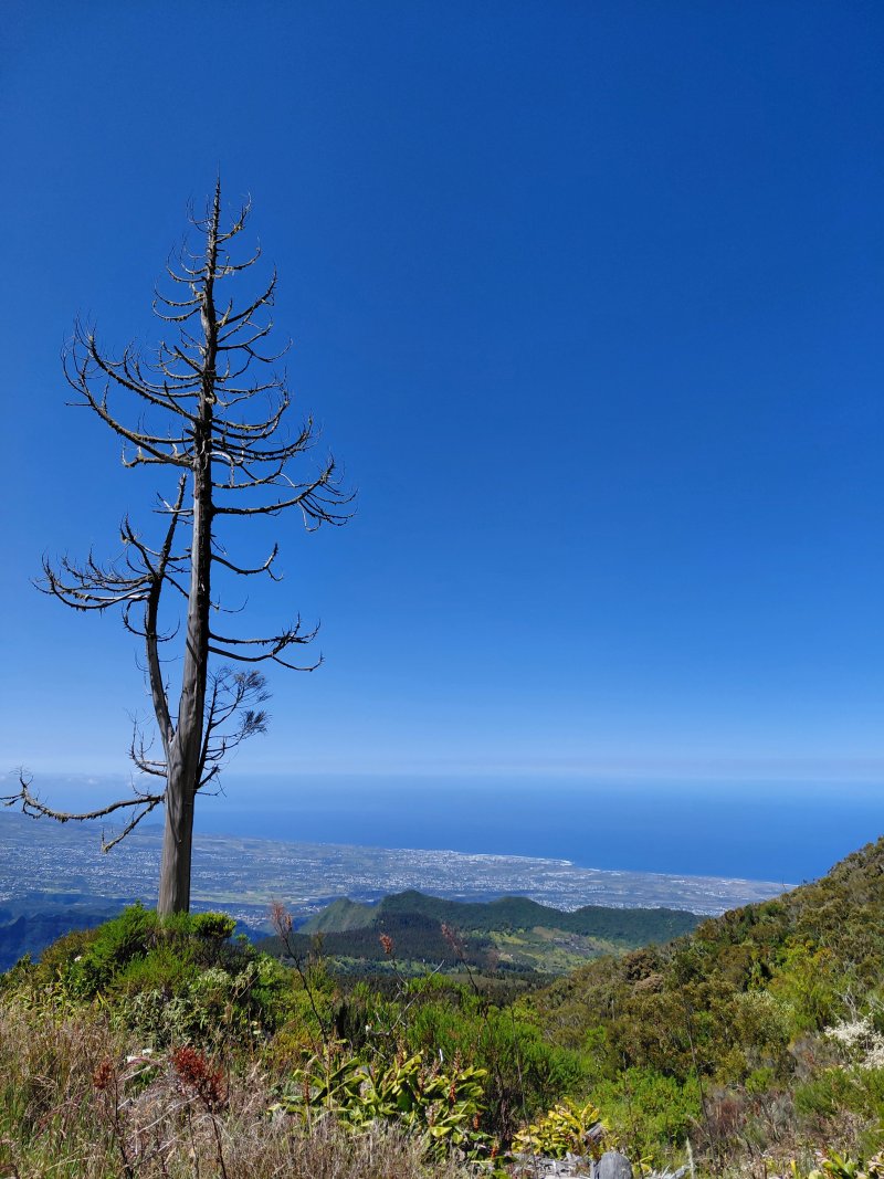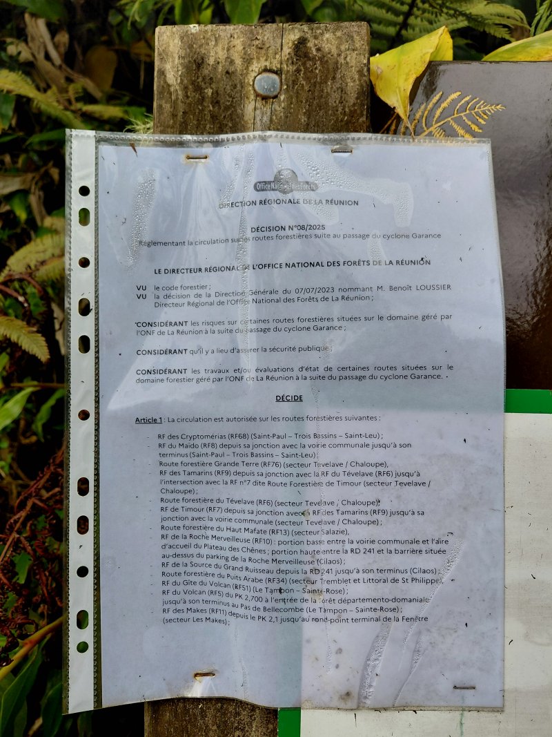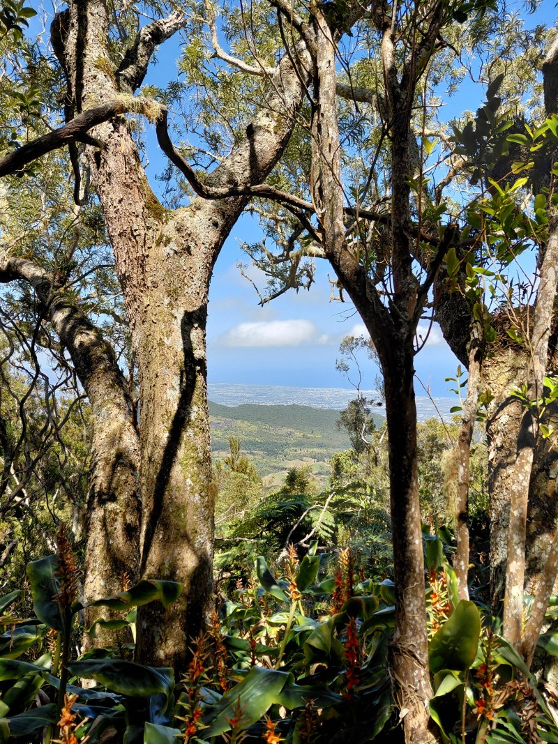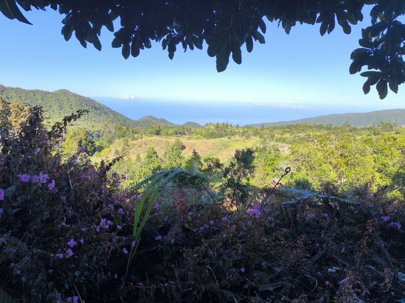 La randonnée débute à la grande aire de pique-nique fleurie érigée le long de la Route Forestière des Makes aux environs du Bras Patates. On a rencontré déjà d'autres aires aussi fleuries depuis les Makes mais plus petites. Celle-ci, de plusieurs hectares, est très bien entretenue et fleurie toute l'année. On peut commencer à marcher sur n'importe quel sentier puisqu'ils finissent tous par se rejoindre en aval près d'une piste de service. Poursuivre en faible descente jusqu'au premier croisement de sentiers, quelques mètres avant de franchir la ravine (Photo 1). Partir à gauche et longer le Bras Patates, tout proche, qu'on ne peut apercevoir au fond du talweg à cause de la végétation. Le sentier dans les bois de couleurs comporte quelques cailloux, des racines et surtout beaucoup de longoses (Photo 2). Plus loin, il est droit et assez plat mais parfois boueux, toujours dans les longoses. Un petit raidillon à mi-pente, assez caillouteux, ralentit à peine la progression (Photo 3). On parvient en une trentaine de minutes au premier croisement occupé par un belvédère en bois pour de belles vues sur le Cirque de Cilaos (Photo 4). On ne se lasse jamais de ce magnifique spectacle qu'on retrouvera souvent dans la montée. Entamer sur la gauche le sentier qui monte vers les antennes de la Fenêtre des Makes. Il est assez étroit, rocailleux et envahi de racines sur une pente souvent forte (Photo 5). Il grimpe en deux séries de lacets serrés séparés par un replat permettant à peine de souffler. Les paysages vers le cirque sont possibles depuis le sentier en bord de rempart (Photo 6). En se retournant, on profite également de vues sur le Piton Cabris (Photo 7). Les antennes et leurs petits bâtiments signent la fin de cette première montée sérieuse. Nouveau belvédère pour admirer le cirque déjà bien éclairé par les rayons de soleil (Photo 8). Après avoir repéré les principaux sommets, îlets ou villages, remonter tout le long de la barrière et poursuivre vers le Petit Mapou par la route de La Fenêtre puis en obliquant aussitôt à droite sur une large piste dans les cryptomerias (Photo 9). La pente est correcte et la marche facile malgré les racines de ces grands conifères (Photo 10). Plus haut les arbres ont disparu, coupés et aussitôt remplacés par les d'envahissantes (Photo 11). On frôle l'unique cryptomeria laissé par les forestiers et l'on regrette qu'il n'y en ait pas plus (Photo 12). On côtoie, tout au long de la montée, les troncs souvent empilés en train de pourrir. L'absence de cryptomerias permet de voir jusqu'à la côte à peine cachée par la Chaîne du Bois de Nèfles. Si la déforestation est agréable pour admirer les panoramas, il en est autrement de l'occupation des sols après la coupe. Toutes sortes d'envahissantes prennent possession des sols qui ne tarderont pas à se recouvrir de longoses. Les bois de couleurs prennent le relais avec une majorité de mahots et des mapous qui ont donné leur nom au petit piton, tout proche (Photo 14). Le sentier ombragé est assez facile avec marches, portions larges souvent bordées de beaux spécimens (Photo 15). L'humidité à cette altitude favorise la pousse des mousses et lichens dont les longues barbes de Jupiter. On rencontre plusieurs bifurcations. Toutes finissent sur le sentier principal et il est possible d'emprunter celui que l'on veut. L'itinéraire présenté utilise chaque fois le sentier partant sur la droite au plus près du rempart qu'on ne voit pas en raison de la forêt. Après un dernier point de vue sur Cilaos et le Gros Morne qui se rejoint en trente mètres, la montée reprend avec quelques raidillons (Photo 16). La pente cesse au col du Piton du Petit Mapou (Photo 17). Du col, on devine le sentier remontant encore un peu pour rejoindre Camp 2000 (Photo 18). On parvient, un peu plus bas, au croisement surmonté d'un grand tamarin tombé qui crée une arche végétale où débute la piste herbeuse en direction de la RF du Haut des Makes (Photo 19). Cette piste plate repose de la dernière montée en mouillant un peu les pieds avec la rosée mais elle s'est transformée en sentier agréable dans la verdure (Photo 20). A la citerne qui marque la fin de la piste, marcher 400 m sur la très agréable route forestière entourée de tamarins et de fuchsias (Photo 21). Ne pas manquer le sentier bifurquant à gauche en direction du Camp Montplaisir. Il plonge dans les bois de couleurs en direction d'une nouvelle citerne. La pente y est parfois forte et la descente peut être glissante mais il est tellement beau qu'on oublie l'effort (Photo 22). Les longoses, hélas, ont débuté leur colonisation qui détruira tout sur leur passage (Photo 23). On les retrouve d'ailleurs le long de la route forestière bordée tout de même de beaux tamarins (Photo 24). Le jeu consiste désormais à rejoindre le point de départ sans manquer un seul de la demi-douzaine de raccourcis entre les lacets. Le passage fréquent de randonneurs empêche, pour un temps, les longoses de les recouvrir (Photo 25). On retrouve plus bas les bois de cryptomerias près d'une aire pour parapentistes (Photo 26). A la Source Soulayre, les lacets sont de plus en plus courts mais les raccourcis, faciles à deviner, subsistent (Photo 27). Cette longue descente prend fin sur la Route Forestière de la Scierie qui frôle une réserve d'eau en face de l'accrobranche de Makes Aventure (Photo 28). La zone peut être très bruyante des cris enfantins selon le jour de la semaine. Le véhicule est facile à retrouver en partant sur la droite et en longeant la route des Makes jusqu'à l'aire de pique-nique, fin de la boucle.