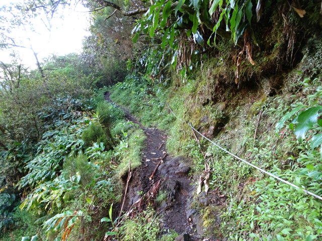 La randonnée débute au parking proche du départ du sentier. Il semble assez étroit et, avec la rosée, on peut se demander s'il en sera toujours ainsi (Photo 1). Il s'élargit très vite et s'enfonce dans la végétation constituée de mahots, fleurs jaunes, fanjans et déjà quelques longoses (Photo 2). On bénéficie de larges panoramas sur le Cimendef qui reçoit les premiers rayons du soleil (Photo 3). Le sentier part dans tous les sens pour rester le plus plat possible et pour franchir quelques jeunes ravines qui se traversent sans danger sur des gués rocheux. Il ne comporte aucun danger ; de plus il est toujours sécurisé lorsqu'il est étroit ou glissant (Photo 4). Il est parfois boueux sur de courtes distances (Photo 5). On arrive sans effort à la Ravine Bémale dont le gué est le plus empierré de gros galets. Avant de traverser, on peut admirer la profonde vallée du Bras Bémale sur la droite en direction des flancs de la Marianne et l'on peut même apercevoir le sentier Augustave par endroits. On a devant soi la pente assez forte qui monte au rein de Deux Fesses. Rien d'inquiétant quand on la voit de loin. De plus près, c'est un plus stressant pour les randonneurs n'aimant pas le vide. Les marches sont nombreuses, pas trop hautes et une main courant rassure (Photo 6). Cette montée sans garde-fou s'effectue rapidement pour finir le long de la falaise où un garde-fou est bien là mais encore plus inquiétant que s'il n'y avait rien puisqu'il penche dans le vide (Photo 1)! Une aiguille rocheuse cache à peine le Morne de Fourche qu'on verra plus loin dans son ensemble (Photo 8). Le passage de Deux Fesses est plus impressionnant par les deux canyons qui le bordent que par le vertige qu'il procure car la végétation crée deux murs de verdure (Photo 9). Les panoramas sont magnifiques sur la droite vers le sentier Augustave ou à gauche en direction d'Aurère dominé par le Piton Cabris (Photo 10). Poursuivre jusqu'au Plateau de la Sale qu'on atteint en quelques minutes. Le terrain est plat. On remarque souvent de larges plaques de boue car l'eau a du mal à s'évacuer. Le sentier est très large et encombré de racines. Un oratoire sur la droite (Photo 12) sert de repère pour trouver le sentier abrupt qui part sur la droite en direction du Bras Bémale et du Sentier Augustave ; mais il est abandonné et difficile à suivre, tout en lacets courts et raides. On côtoie de beaux arbres dont certains ont atteint le siècle d'existence (Photo 13). On quitte le plateau par un rein étroit où poussent de grands filaos (Photo 14). Le sentier est assez facile, peu pentu dans les bois de couleurs et goyaviers (Photo 16). Il est large et constamment entretenu (Photo 17). Quelques points de vue sont installés le long du sentier pour profiter très souvent de nouveaux panoramas sur le Piton Cabris (Photo 18). C'est ensuite une longue descente raide, en lacets, technique parfois quand on rencontre des racines ou de hautes marches. Il rejoint un réservoir cimenté abandonné au Captage Grimaud. Les filaos reviennent et on ne les quittera plus guère jusqu'à la fin (Photo 20). La fin de la descente est ombragée sous les filaos sur un adorable sentier couvert d'aiguilles sèches qui peuvent s'avérer glissantes lorsque la couche est épaisse (Photo 21). Certains sous-bois sont presque nus alors que d'autres sont couverts d'invasives de toutes sortes. La jonction entre les deux îlets à Malheur s'effectue presque à plat sur un agréable sentier dans la verdure (Photo 22). Après avoir traversé une petite ravine, on parvient au croisement avec le sentier filant vers l'Îlet à Bourse. Poursuivre vers l'Îlet à Malheur et ne pas manquer, par un court détour, le vieux cimetière et, plus proche du sentier, la belle petite chapelle et sa cloche à l'extérieur (Photo 24). Le Piton Cabris qu'on n'a pas quitté depuis le Plateau de la Sale, est tout proche, imposant au-dessus des habitations (Photo 23). La jonction avec la passerelle dressée au-dessus du Bras Bémale s'effectue sur de gros cailloux dans les chouchous (Photo 25). L'étroit édifice surplombe le Bras Bémale qui coule 50 m plus bas dans un étroit canyon (photo 26). La montée à Aurère peut s'effectuer par plusieurs voies bien indiquées avant ou après avoir franchi l'étroite passerelle. La montée la plus rapide à Aurère débute sous les filaos par des marches nombreuses et se poursuit dans la terre ou les gros cailloux bordés de chouchous (Photo 27). On atteint facilement Aurère d'où il est possible d'effectuer un détour vers Bord Bazar pour profiter de nouveaux panoramas sauvages. Le village est vaste et la première partie s'arrête symboliquement à l'école. Si aucune étape n'est prévue vers Dos d'Ane ou d'autres lieux de Mafate, le retour peut s'effectuer par le même itinéraire. La carte ci-dessous prévoit une descente vers l'Îlet Jardin qui offre de beaux points de vue sur la vallée du Bras Bémale en direction du Sentier Augustave. Une fois l'Îlet à Malheur retrouvé, il faut se mettre en tête que le retour à Bord Martin comportera de nombreuses montées qui paraîtront interminables ou difficiles dans la zone de lacets.
