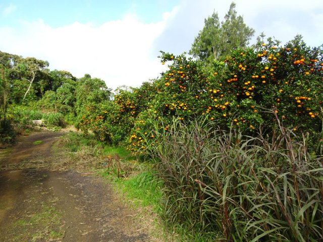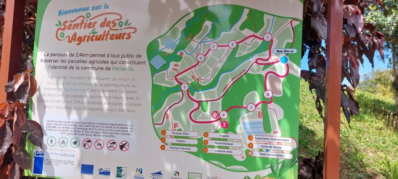 La randonnée débute au terrain de cross où s'entrainent VTT, motos, quads ou modélistes. Un grand parking situé avant d'arriver à la zone du Relais permet de stationner facilement mais la boucle peut débuter n'importe où le long de la route. Traverser cette zone recouverte d'herbe là où les pneus n'ont pas creusé la terre en choisissant n'importe quel passage (Photo 1). On profite déjà des premiers panoramas vers le Piton du Rond ou le Morne Langevin (Photo 2). Plus haut, après avoir escaladé une butte herbeuse, on devine facilement la piste qui part sur la gauche par une descente facile. Après 100 mètres, un sentier part sur la gauche mais il permet de rejoindre le Sud vers la Plaine des Grègues et pourra être utilisé lors d'une autre boucle dans cette région. La piste en terre se dirige vers le relais hertzien qu'on aperçoit assez souvent sur le petit Piton du Relais. On le rejoint sans effort par la large piste terreuse bordée de hautes cannes fourragères (Photo 3). En arrivant au pied, on comprend pourquoi on la voit de si loin (Photo 4). Une petite route goudronnée part en descente vers la route de Manapany mais avant, la piste qui longe le grillage permet de beaux points de vue sur la région. Attention, plus loin, une pancarte indique clairement qu'il vaut mieux éviter de cueillir dans les cultures (Photo 5). Faire demi-tour après avoir profité du panorama puis emprunter la route qui se transforme rapidement en piste caillouteuse et rencontre la route du Relais. Bifurquer à gauche et rejoindre les premières boîtes aux lettres situées dans le virage. Des flèches indiquent la direction en proposant des cours d'agriculture. Après une forte montée sur deux bandes de roulement on parvient à la case de Max Fontaine (Voir § ci-dessous). Le circuit se continue en rasant les jardins puis en partant sur la droite mais un petit détour par la gauche jusqu'à une minuscule chapelle (Photo 7) ne prendra qu'une dizaine de minutes. A partir de la chapelle, les pistes qui remontent sont le plus souvent en cul de sac. Repasser devant chez Max Fontaine et traverser le grand verger d'agrumes par une piste facile à suivre (Photo 8). Plus haut, tourner à droite et poursuivre dans les maraîchages et champs de fraisiers (Photo 9) jusqu'à prendre la piste principale qui se termine à la route du Relais après avoir franchi une minuscule ravine et longé des grosses touffes de bambou. La suite de la montée passe par le domaine du Relais. Comme un sentier en fait quasiment le tour, remonter vers la chapelle et le centre équestre par le sentier à gauche de la route (Photo 10). Celui de droite sera utilisé au retour. A la chapelle (Photo 11), débute une longue portion de route qui mène au hameau de Bassin Joséphine. Marcher jusqu'au radier de la Ravine de Manapany puis bifurquer au premier croisement à droite et marcher 200 mètres jusqu'aux serres sur la gauche. Emprunter le chemin entre elles jusqu'aux vergers de tangors (Photo 12). A la saison, les arbres sont couverts de cet agrume cultivé principalement dans la région de Petite Île (Photo 13). Le chemin effectue un virage à droite à angle droit et rejoint plus loin de nouveaux vergers. Impossible de manquer le sentier partant sur la gauche à travers les goyaviers poussant serrés les uns contre les autres. Ce court sentier souvent glissant par temps humide se termine sur la boucle des Margosiers (Photo 14). La fin du circuit s'effectue en partant sur la gauche mais il est possible de bifurquer à droite pour continuer en direction du point de départ des parapentes en continuant à marcher entre les goyaviers (Photo 15). Une fois sur cette pente herbeuse bien entretenue, on bénéficie de belles vues sur les forêts environnantes (Photo 16) ou en direction de la Plaine des Grègues (Photo 17). Faire demi-tour par le même parcours puis marcher jusqu'au croisement précédent dont le sentier de droite revient vers la Plaine des Grègues par la forte descente de la Cascade Mottet. Le sentier glissant comporte par endroits des marches empêchant les glissages (Photo 18). Poursuivre en descente sur des marches pour aller franchir le Grand Bras Rouge sur une modeste passerelle (Photo 19). Le parcours est tout d'abord facile (Photo 20) puis le sentier devient de plus en plus difficile sur hautes marches et quelques dents de scie pour passer les petites ravines. La montée est ensuite constante sur la crête qui sépare deux ravines, sur de hautes marches par endroits (Photo 21). A 1000 m, il devient plus plat dans les bois de couleurs et goyaviers et la marche est facile jusqu'au prochain sentier partant sur la gauche près de deux pancartes en bois. La partie qui suit est plate et large (Photo 22) jusqu'au cul de sac du Chemin de la Forêt, cette route étroite qui descend à travers champs et vergers jusqu'à la Route Léopold Lebon (Photo 23). Quelques cases fleuries bordent la route d'où l'on bénéficie à nouveau de larges panoramas vers l'océan et les collines environnantes (Photo 24). La route étroite n'a que peu de circulation, rendant la descente agréable (Photo 25). La fin de la descente s'effectue à nouveau dans les vergers d'agrumes (Photo 26). Au croisement, prendre à droite et rejoindre la chapelle par l'itinéraire emprunté à l'aller. Peu après la chapelle, emprunter le sentier qui traverse ou borde l'aire de repos (Photo 27) et regagner le terrain de sport puis le parking du départ sans utiliser la route en lacets. Des kiosques sont là pour se reposer et se désaltérer avant de repartir (Photo 28).