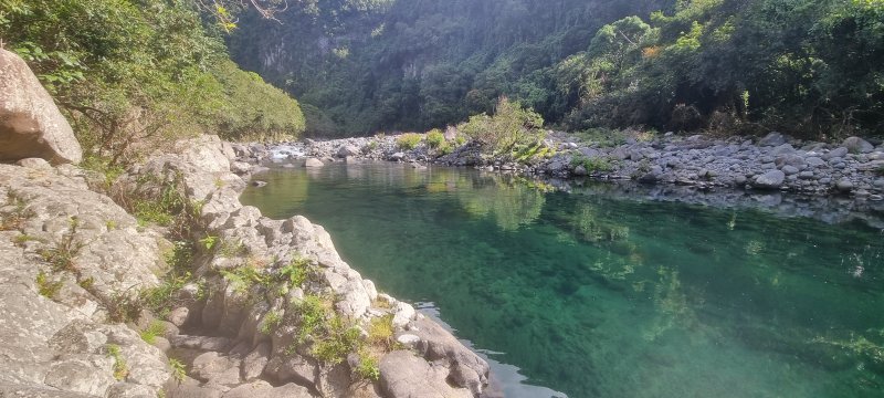 La randonnée débute à la D54 où un emplacement de stationnement se trouve immédiatement après avoir emprunté la petite route de l'Îlet Coco. On peut également stationner un peu plus loin près d'un modeste temple tamoul. Partir sur la route étroite sans grand risque avec la circulation (Photo 1). La jonction est courte avec l'Îlet Coco et permet de traverser de nombreux vergers ou une vaste plantation. On repère déjà de superbes pieds de letchis (Photo 2). Plus loin, on franchit un radier assez long qui n'est dangereux qu'en cas de fortes eaux durant les épisodes cycloniques importants (Photo 3). Prendre une minute pour lire le panneau relatant les crues importantes de la rivière. Repérer les deux marques en haut du poteau pour voir qu'il ne fait pas bon traverser à certaines périodes (Photo 4). L'îlet est composé de cases dispersées et entourées de nombreux arbres fruitiers (Photo 6). Suivre le Chemin de l'Îlet Danglas, traverser le hameau et emprunter la piste caillouteuse sous les letchis et autres arbres fruitiers (Photo 7). Elle ne présente aucune difficulté car elle est totalement plate. Elle passe plus loin un pont métallique au-dessus d'un bras de la rivière (Photo 8). On arrive plus loin à de grosses touffes de bambous situées en bord de rivière (Photo 9). L'eau y est assez calme et l'on peut même envisager une baignade (Photo 10). Une nouvelle piste commence aux touffes de bambous. Un panneau en interdit la circulation mais pas la marche. La pente est assez forte par endroits et des portions ont même été goudronnées pour un meilleur maintien du sol (Photo 11). Cette piste est souvent humide mais on peut facilement éviter la boue s'il y en a (Photo 12). On rencontre tout de même de belles flaques créées par les pneus. Puis la piste se met à descendre vers la rivière vers une bananeraie où se situe un autre panneau (Photo 13). Il demande de ne pas pénétrer dans la propriété et invite à emprunter le sentier à quelques mètres de là (Photo 14). Le sentier débute dans l'herbe et descend rapidement vers le cours d'eau par des marches et déjà de nombreux galets. La balade est terminée et il faut désormais cheminer le long des berges en cherchant le meilleur passage entre les roches (Photo 15). Ne pas marcher trop vite si elles sont glissantes. On coupe plusieurs petits cours d'eau finissant leur course dans la rivière et se passant facilement à gué (Photo 16). La marche peut être dangereuse si une chute se produit sur les galets. La trace est parfois assez bien visible mais sur de courtes portions (Photo 17). Le cours d'eau est par endroits fougueux (Photo 18), en d'autres très calme (Photo 19). Après le petit plateau en rive gauche qui entoure l'îlet Bethléem, c'est une haute falaise infranchissable qui prend le relais. La rivière est très calme en général, mais on passe parfois près de certaines parties transformées en torrent en raison de la pente ou de l'étroitesse du lit (Photo 23). Chaque torrent est suivi d'un bassin souvent large et profond qui incite à la trempette (Photo 24). La rivière fait un peu plus haut un virage sur la gauche et devient trop difficile à remonter en famille. La vallée devient de plus en plus étroite vers l'amont et se réserve aux professionnels. Il faut dire que depuis sa naissance sur les hauteurs de Bébour, la rivière a eu le temps de grossir de dizaines d'affluents malgré tout ce qu'elle offre au passage à l'usine hydroélectrique de Takamaka. S'approcher du gros rocher près duquel on peut prendre un bon casse-croûte (Photo 26). Eviter d'emprunter ce sentier en fin d'année afin de ne pas être tenté par les fruits rouges qui pendent des arbres ! La cueillette en est d'ailleurs interdite et de nombreuses pancartes sont constamment là pour rappeler le caractère privé de ces plantations.