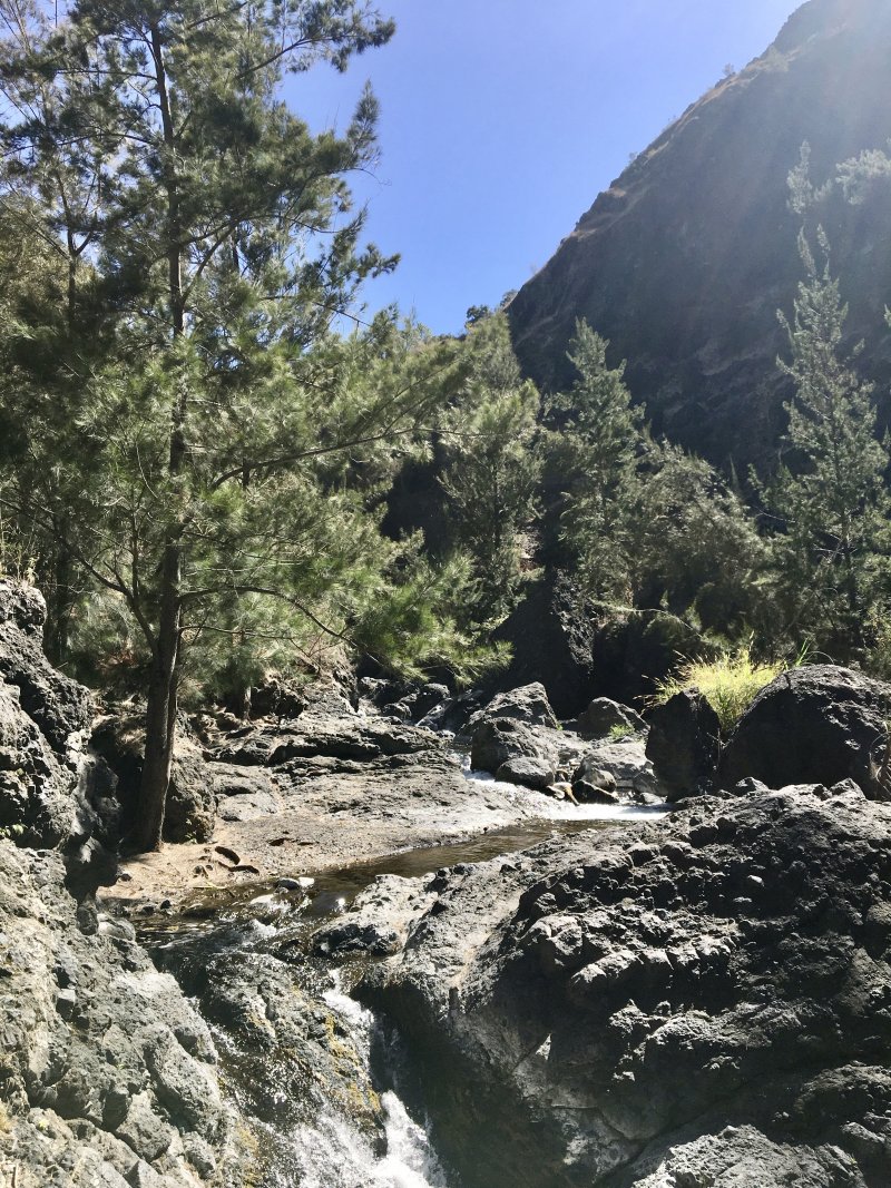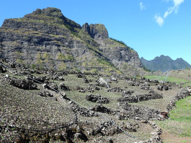 La randonnée sportive débute à la fin de la route de la Plate Forme, en plein cœur des immenses champs de lentilles (Photo 1). En réalité les champs sont assez petits mais on a peu l'habitude de voir en montagne de si grandes surfaces cultivées. Comme les paysages sont grandioses et que les vues sur ces champs sont peu courantes, il est conseillé de partir à pied de la Plateforme pour apprécier l'ensemble. On peut également étudier le système astucieux de cordes attachées ensemble et portant des bouteilles ou boîtes vides pour faire du bruit afin d'éloigner les oiseaux sans avoir à marcher. On tire sur la ficelle et tout l'ensemble bouge. Rejoindre le départ du sentier de la Roche Pendue, près de son manguier et de la case au toit vert pâle (voir la randonnée vers la cascade de la Roche Pendue pour les détails et coordonnées). La descente s'effectue par de courts lacet remplis de petits cailloux tombés suite aux travaux de mise en culture en lentilles de la forte pente (Photo 2). Attention tout de même à son étroitesse car le pied peut facilement mordre sur la partie basse. On rejoint les premiers filaos dans une végétation assez dense puis la berge de la ravine près d'une touffe de bananiers (Photo 4). Pas de difficulté particulière pour filer vers l'aval à moins de n'avoir jamais randonné près d'une rivière un peu oubliée. On passe donc de galets en racines, de parties sableuses en gués ou de jouvences en chocasAgavacée (cadère) Furcraea foetida - Importé pour en faire de la corde,