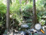 Rejoindre la rive gauche de la Roche Pendue à partir du manguier qui pousse en bordure de rempart. Suivre la ravine sur le sentier étroit et bordé de jouvences en marchant 360 m. Aussitôt un gué étroit franchi, repérer les trois filaos de la photo et les deux cairns. La pierre plate entre les deux premiers filaos est à moins de 2 mètres de l'eau et le sentier commence à cet endroit en partant vers la droite, la pierre servant de première marche d'escalier.