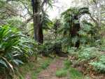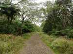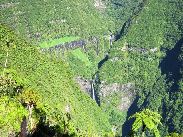 La randonnée débute au parking du Gîte de Bélouve à 200 mètres des bâtiments. Ne pas descendre au belvédère pour gagner du temps et entamer immédiatement le sentier du Trou de Fer qui débute entre de grandes azalées. Cette partie est très variée en alternant planchers isolant de la boue (Photo 1), racines, montées et descentes pour franchir des ravines, grosses pierres glissantes, escaliers en bois, etc. La végétation est le plus souvent agréable avec des tamarins et hautes fougères arborescentes (Photo 2). On atteint rapidement l'allée cavalière qu'on emprunte par la droite au milieu de la même verdure (Photo 3). Pas le temps non plus de partir sur la droite voir la Reine des Tamarins qu'on garde pour le retour ou pour une autre balade en forêt. Plus loin, le sentier du Trou de Fer part sur la gauche mais la boue qui en recouvre une grande partie serait un handicap, surtout qu'il y aura suffisamment de boue sur le trajet pour s'en souvenir des mois durant ! A la fin de la piste, entamer une marche agréable sur le sentier recouvert de planchers pour rejoindre le sentier de l'Ecole Normale (Photo 4). Partir sur la droite et repérer, moins de 100 mètres plus loin, le sentier qui part vers la gauche (Photo 5). Rejoindre au plus vite le sentier sous les cryptomerias qui mène à la Ravine Mazerin en ayant traversé une partie du Plateau Cochon et sa belle forêt primaire qui se transforme de plus en plus en forêt couverte de pestes végétales. Quand on connaît la vitesse d'installation de ces plantes semées par les oiseaux et la difficulté d'éradication, il vaut mieux photographier les sous-bois tant qu'il est encore temps. Dans 20 ans il n'y aura plus que des pancartes retraçant l'histoire de ces forêts primaires. On se retrouve sur la berge de la ravine Mazerin qui a parfois un bon niveau d'eau. Elle doit se remonter vers l'amont jusqu'au départ du sentier qu'on repère et rive droite. La forêt s'assombrit et on chemine un long moment dans le lit d'une courte ravine qui se précipite dans le Trou de Fer juste après sa source. Le fond est caillouteux, moussu et souvent glissant (Photo 6). On marche moins de 1000 mètres dans ce fond de ravine ou très près d'elle à chercher la trace. D'un seul coup la montée se présente, discrètement indiquée par une flèche blanche de moins en moins visible et il faut user des mains sur les branches pour rejoindre les premières échelles (Photo 7). La montée dépasse les 200 mètres de dénivelé mais ces échelles, placées aux bons endroits facilitent grandement la montée en évitant les obstacles verticaux (Photo 8). On atteint assez rapidement le bord du rempart recouvert de mousses et de grands branles verts. Le sentier, spongieux et glissant est parfois assez creusé ou encombré de racines (Photo 11). On rencontre plus bas de beaux points de vue sur les chutes de la Ravine Mazerin (Photo 9) puis, plus loin sur le Bras de Caverne qui se précipite dans le Trou de Fer (Photo 10). Plusieurs occasions d'admirer d'autres panoramas se présentent avant de voir le sentier partir vers la droite (Photo 14 et 16). Il ne faut pas trop traîner pour les admirer car il reste encore de la boue, de nombreux gués à passer et des forêts de bois de couleurs de plus en plus difficiles à traverser à cause des plantes invasives qui poussent plus vite que les autres. La forêt est sauvage et très humide et le sentier constamment boueux. Il est difficile d'y voir les troncs des arbres recouverts de toutes sortes de plantes, mousses ou d'épiphytes (Photo 17). On remarque deux pitons très boisés sur la gauche. Ce sont le pic et le Morne des Lianes qu'on ne quittera plus des yeux jusqu'à la cascade du Chien (Photo 18). La forêt qui borde le sentier est par moment envahie de pandanus des hauts dits pimpins (Photo 19). Certaines ravines sont difficiles à passer en période de pluies ; bien choisir sa saison ou patauger en se maintenant aux roches qui dépassent (Photo 21). Ces gués présentent l'avantage de pouvoir laver les chaussures car il vaut mieux marcher les pieds mouillés que boueux. Le sentier oblique à nouveau à droite près d'un autre partant sur la gauche. Il est utilisé par les canyonistes partant pour la longue descente de la Cascade Blanche dans le Cirque de Salazie. Plus loin on approche une retenue d'eau qui sert de réserve à une station de pompage (Photo 23). L'ancien sentier qui longeait le Bras Piton a été abandonné et on file plein sud pour traverser une zone très boueuse envahie de goyaviers et de bois Noël. Le Bras des Lianes se traverse à gué, les pieds dans l'eau (Photo 25) et la fin du trajet devient plus facile sans toutefois être agréable en raison du sol humide, moussu et glissant (Photo 26). La délivrance arrive après plus 6 ou 7 heures de dur effort ; on est trempé souvent jusqu'au dernier vêtement, griffé et fatigué mais il faut songer à rebrousser chemin après une courte halte au point de vue sur la Cascade du Chien (Photo 28).