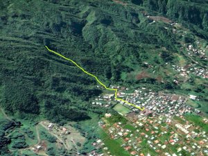 La randonnée débute au cœur du Tévelave, près de l'église et de ses très nombreux parkings. On longe la ruelle qui est à la gauche de l'édifice religieux et on rejoint plus haut une réserve d'eau entourée d'un grillage. Contourner l'ouvrage par la droite, près du grillage, pour pénétrer dans une zone où les pestes végétales se battent pour avoir la suprématie sans qu'on puisse savoir laquelle gagnera. Plus haut les longoses ont depuis longtemps emporté le chalenge. Le sentier est défriché régulièrement par les équipes d'entretien sans pour cela le transformer en sentier de grande randonnée. Il est étroit et passe parfois sous la végétation (Photo 2) ou sous la canalisation (Photo 12). Certaines portions sont très étroites et la chute vers la ravine est possible et sans doute douloureuse à cause des pestes toutes aussi épineuses les unes que les autres. On passe près d'un ouvrage bétonné de recueil des eaux. On poursuit quelques centaines de mètres pour arriver enfin à une grande muraille rocheuse d'où coule une cascade fine mais qui, à en juger par la largeur des rochers nus, peut parfois atteindre de bons débits. C'est là qu'a été édifié un barrage de recueil des eaux de cette importante source. Le retour vers le Tévelave s'effectue très rapidement en raison de la pente.