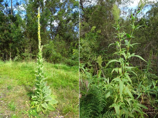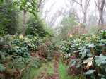 La randonnée débute au croisement de la Ligne des Eucalyptus et de la RF des Tamarins où il est possible se stationner. La route, peu empruntée par les engins est étroite, glissante si mouillée, se laissant dévorer lentement par les longoses et bringeliers (Photo 1). La route effectue une large boucle avant de revenir en direction du Piton Fougères qui dépasse à peine à l'horizon (Photo 2). Les fraisiers des Indes (Duchesnea indica) occupent tous les fossés mais les fruits ne présentent aucun intérêt gustatif (Photo 3). La piste bétonnée cesse en arrivant à une grande réserve DFCI de 6000 m3 (Photo 4). Elle est remplacée par une piste herbeuse (Photo 5). Elle rejoint les limites du parc couvert ici de grands tamarins des Hauts et de zones marécageuses envahies de joncs et de fougères (Photo 6). Laisser sur la droite la piste DFCI de la Ravine du Trou, également herbeuse. La piste, malgré l'herbe, se suit facilement en frôlant quelques beaux tamarins (Photo 7). La pente est faible et ne demande aucun effort (Photo 9). De superbes pieds de bouillon blanc (Verbascum thapsus) ou d'oseille sauvage (Rumex abyssinicus Jacq) bordent le sentier (Photo 10). Certaines tiges dépassent les deux mètres de hauteur. La plante, déjà très envahissante, est dotée d'énormes grappes de graines. On passe très facilement plusieurs ravines sans trop s'en apercevoir (Photo 11). D'autres sont plus remarquables avec rochers, grottes ou cassés basaltiques vertigineux (Photo 13). Après une descente sur le même type de piste herbeuse, on se retrouve à la barrière fermant la Piste des Eucalyptus. Traverser la route des Tamarins et viser, un peu sur la droite, la Piste DFCI des Camélias (Photo 14). Le départ est large, très propre entre les tamarins et acacias noirs (Photo 15). Puis, petit à petit, l'herbe envahit la piste mais le cheminement s'effectue sans difficulté (Photo 16). La piste file plein sud en longeant les clôtures des prairies qui bordent la forêt (Photo 17). On coupe, sans trop la voir, la Ligne des Camélias recouverte de longoses. Plus loin, on a même du mal à imaginer qu'une piste existait il y a encore 5 ans (Photo 18). Laisser la piste suivante qui file tout droit vers la route et prendre à droite. Les tamarins sont de plus en plus nombreux. Certains sont morts pour laisser de belles natures mortes (Photo 19) ; d'autres, bien vivants, atteignent de respectables hauteurs (Photo 20). Plus loin, ce sont de belles touffes de calumets qui résistent encore aux envahisseurs (Photo 21). Ces envahisseurs originaires du Népal, impossibles à éradiquer, fournissent pourtant de très belles fleurs odorantes qui leur ont valu d'être importés en 1819 (Photo 22). La fin de la boucle s'effectue sur la piste entièrement recouverte d'herbe (Photo 23). Très vite, les longoses prendront possession de l'ensemble du parcours comme on le voit sur de nombreuses autres pistes anciennes (Photo 25). Deux possibilités pour rejoindre la fin de la boucle : poursuivre sur la piste des Camélias ou tourner à gauche sur la Ligne des Eucalyptus, plus difficile à repérer si on ne pense pas à regarder sur la gauche. Pour ne pas manquer le retour par le sentier si l'on est passé sans le voir, repérer sur la droite une barrière, une prairie et une réserve d'eau à une cinquantaine de mètres. A partir de la barrière, revenir en arrière d'une quinzaine de mètres et entamer la montée sur un sentier étroit mais bien visible (Photo 27). Ne pas s'étonner d'y retrouver longoses et fougères, remonter la seule véritable pente de la boucle qui peut être boueuse par endroits (Photo 28). On retrouve facilement le véhicule garé au début de la piste bétonnée.
