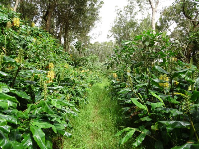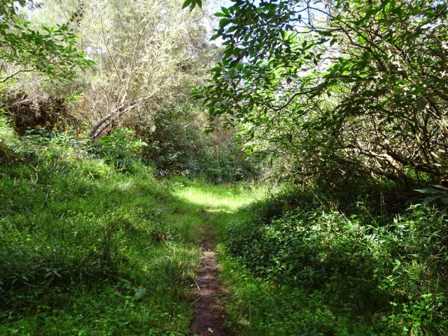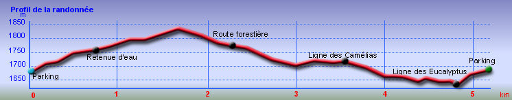 Encore une boucle que l'on ne va pas organiser spécialement mais qui peut se coupler avec une autre de la région proche, comme la boucle du sentier des tamarins. L'intérêt ici réside dans le calme de la région et dans la largeur des pistes qui permettraient de marcher à plusieurs personnes de front si l'herbe n'envahissait pas trop le sol. Hélas, elles sont de moins en moins entretenues et se transforment petit à petit en sentier. On bénéficie de très peu de panoramas vers l'océan. De très nombreux oiseaux s'envolent de toute part et le jeu consiste à les nommer au passage (papangues, cailles, merles, cardinaux, bec corail, tec tec, etc.). On marche tour à tour sur des pistes de gravier, de lave solidifiée, de terre battue ou d'herbe qui peut être humide le matin. En deuxième partie de boucle, la large piste des Camélias est désormais un vrai sentier de randonnée.