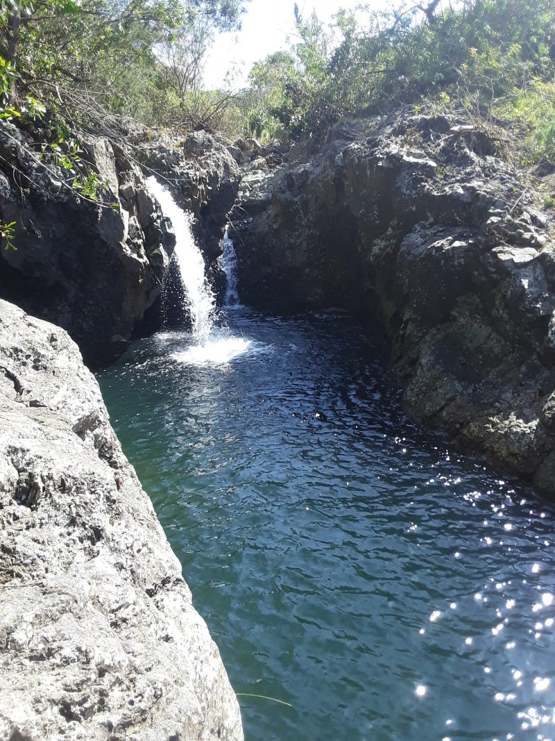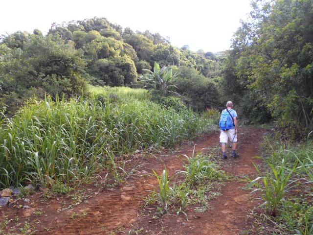 La randonnée débute au Chemin des Pétréas, un peu après la passerelle qui enjambe la rivière à sec et le fond rocheux. Contrairement à bien d'autres rivières, il faut être un sportif un peu "fou" pour la remonter, tant les bassins profonds, à sec ou remplis d'une eau noire ou croupie et les grottes en constituent le fond et les abords. En revanche, il est possible de s'approcher de toutes ces merveilles de la nature en longeant le sentier et en effectuant des écarts de quelques mètres à travers la végétation. La pente est faible, le sentier en très bon état (Photo 3), et on frôle les nombreux bassins de la région indiqués par de discrètes pancartes clouées aux arbres. On passe ainsi les bassins Pirogue, Samuel, Michel, Ti Feuilles ou Croisade et bien d'autres non baptisés (Photo 1). La montée du sentier familial s'achève au premier gué sur des galets ; les autres l'ayant été sur des plaques de basalte (Photo 4). Avant de poursuivre, profiter du bassin à gauche alimenté par une petite cascade et de l'énorme bassin en amont. Ce dernier résume à lui seul la difficulté de remonter la rivière par son lit. Franchir le gué sans chercher à marcher dans le lit et remonter un peu fortement pour trouver plus haut un champ de canne. Longer la piste sur une courte distance et retrouver le sentier qui repart en rive gauche puis éviter les gros galets qui jonchent le lit de la Rivière d'Abord que l'on suit sur près de 200 mètres. Le sentier repart en rive gauche et monte graduellement en sous bois pour surplomber la rivière d'une cinquantaine de mètres. Les jouvences et rochers bordent le sentier (Photo 7). On a parfois des trouées dans la végétation qui permettent d'apercevoir l'autre rive dont le rempart est couvert d'une forêt assez touffue (Photo 5). Plus loin, c'est la Grand Bénare qui domine le panorama sur Le Tampon (Photo 10). La descente est graduelle jusqu'à la ravine qu'on longe sur quelques mètres avant de repartir dans le même type de végétation ou le long de nouvelles barres rocheuses (Photo 11). On est à quelques mètres du cours d'eau que l'on rejoint près d'un cassé de cascade à sec. Traverser pour attaquer en rive droite une portion assez sportive dans les bois de couleurs, de courte durée car elle ne sert qu'à éviter la cascade et à la contourner. Nouvelles montées sur d'anciennes marches que l'on devine. Les poivriers et goyaviers envahissent les lieux. La montée est très raide par endroits et on apprécie les anciennes marches encore en place (Photo 14). Plus haut, on bénéficie de nouveaux panoramas sur les montagnes en marchant sur une crête couverte d'un peu de fougères et de bringeliers. Plus loin, le sentier oblique à nouveau vers la rivière que l'on rejoint par un sentier étroit et vertical où les arbustes s'avèrent utiles pour ralentir et éviter les chutes. Il n'y a pas d'autre passage que la ravine qu'on remonte longuement en suivant les tâches sur la roche. Attention par temps humide car certains galets sont glissants (Photo 12). Plus haut, on parvient à un bassin alimenté par des toboggans (à sec) et surmonté d'un gros bois de rempart. On approche du Bassin Sainte-Thérèse, situé en amont près du bois de rempart, fin de la montée proposée à partir de Bel Air (fiche en cours de refonte). Nouvelle montée très forte, nouvelle descente en s'accrochant aux branches et l'on revient en fond de ravine pour en effectuer une partie. C'est reparti plus haut pour les montagnes russes mais le sentier est moins pentu et longe la rivière à quelques mètres. Sur la gauche, on devine une grosse grotte qui est en réalité le bas d'une cascade. On la rejoint en 30 secondes et l'on peut voir la cavité qui contient un tronc d'arbre transporté par les crues donnant l'impression d'un tuteur qui empêcherait le plafond de tomber (Photo 13). Après de nouvelles dents de scie, barres rocheuses, marches parfois hautes, on descend encore dans la ravine, aidé par les troncs de goyaviers. On traverse pour marcher sur une courte distance en rive droite, remonter la ravine et gagner la rive gauche. Le sentier est bordé par endroits de vigne, de fougères, de beaux tans rouges et bois de rempart. On arrive à la ravine pour un nouvel épisode de sauts sur des galets tous plus gros les uns que les autres. Plus haut, c'est une zone totalement recouverte de fougères, vigne et bringeliers au milieu des acacias noirs qu'il faut traverser (Photo 20). Les volontaires de l'association ont créé un passage très large mais attention à la repousse rapide de ces pestes. On parvient bientôt à un semblant de mur et à un trou circulaire où siégeait l'alambic depuis des décennies avant de disparaître mystérieusement. L'endroit est le point de demi-tour proposé pour le circuit venant de la D36 pour les amateurs de beaux troncs. On termine les deux derniers kilomètres dans une végétation magnifique où les mousses, fougères, troncs centenaires vont se multiplier mais où les dents de scie ne disparaîtront pas. L'avantage ce sont les arrêts fréquents, non pour se reposer mais pour admirer ce que la nature peut nous fournir comme beautés respectables. On traversera de nouveau la rivière près d'une cascade à sec entourée de ses trois grottes (Photo 22) avant de poursuivre dans de magnifiques sous-bois moussus (Photo 23). La fin de la montée, après le dernier gué où le sentier n'est pas évident à deviner, se poursuit en rive droite sur un sentier très facile à suivre entre les arbres moussus (Photo 24). Il arrive à une barre rocheuse très proche de la rivière avant de se terminer à la RD36. Il aura fallu près de cinq heures à monter, descendre, marcher sur les galets de la rivière, éviter les ronces, escalader les marches dont certaines atteignent 60 cm pour atteindre cette route, fin de toutes les difficultés.