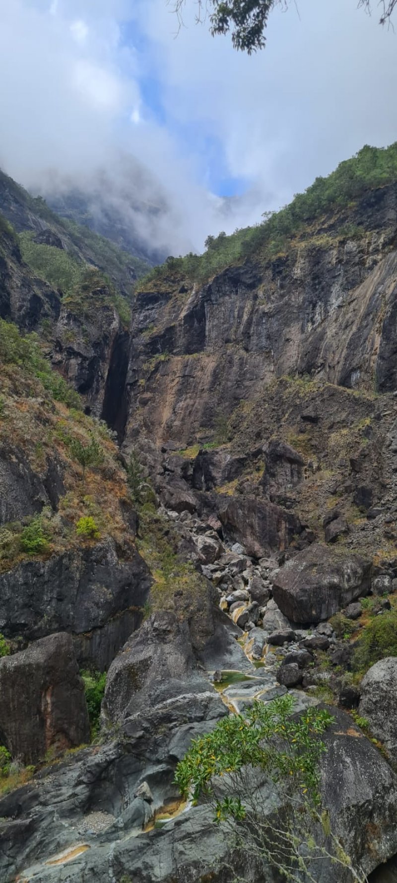 On peut, une fois n'est pas coutume, emprunter un sentier destiné à nos amis canyonistes pour se régaler de nouveaux spectacles, parfois aquatiques ou de panoramas inhabituels. C'est le cas de ce très court trajet tout en montée qui quitte la route de l'îlet à Cordes pour se rapprocher au plus près de la haute cascade dont on aperçoit le sommet depuis le pont. On comprend très vite en arrivant au terminus que la dernière corde partant vers le vide n'est pas faite pour un randonneur, surtout s'il souffre du vertige. Le circuit est très court et peut très bien se combiner avec la montée à la Cascade Pitsa puisque le sentier de départ est commun sur 50 mètres. Attention, si on peut effectuer cet aller-retour par mauvais temps il en va tout autrement de la cascade Pitsa qui se pratique presque totalement sur rochers glissants. Ne pas manquer, dans les trouées de la montée, les dernières chutes de la Ravine les Salazes qui se jettent dans le Bras Rouge. Là-haut, c'est un paysage fantastique qui attend les courageux qui auront monté ces 200 mètres et un peu redescendu jusqu'au bord du précipice. Il est fortement déconseillé d'amener des enfants en raison des à-pics de la falaise en fin de parcours.
