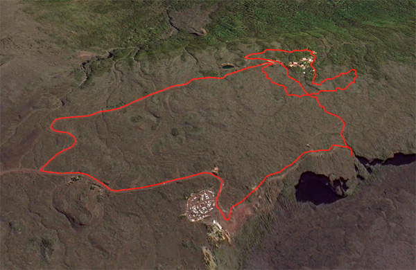 La randonnée débute au croisement des deux pistes partant, l'une vers le Pas de Bellecombe, l'autre au gîte du Volcan. Un petit élargissement de la route près d'un ancien cratère (Photo 23) permet de se garer aisément sur la droite de la piste en direction du Pas de Bellecombe. On marche tout d'abord très facilement sur la piste qui rejoint en quelques virages le parking du gîte (Photo 1). Juste avant d'arriver, une pancarte sur la droite indique le sentier de découverte. Il est étroit et un peu humide en début de matinée. La pente est faible et la végétation assez dense mais base. Plus haut, il longe ou emprunte des coulées anciennes de lave où l'on peut avoir quelques hésitations pour suivre l'itinéraire sur une cinquantaine de mètres. Il faut repérer et suivre les saignées étroites sciées dans la roche et recouvertes de peinture rouge vieillissante (Photo 6). On rencontre très vite des sculptures en résine peinte en gris et représentant des "montagnes" en miniature (Photo 3). Quelques petits panneaux tentent d'attirer l'attention sur la lente installation des plantes dans de tels milieux défavorisés. Le sentier ne s'éloigne jamais du gîte qu'on aperçoit souvent dans les trouées. Il effectue de nombreux petits virages avant de couper le sentier principal grimpant au Pas de Bellecombe. Il se poursuit sur une centaine de mètres avant de revenir vers le gîte. Au prochain croisement, abandonner la boucle pour prendre à droite un sentier balisé de jaune qui longe une clôture (Photo 15), franchit une petite ravine et s'approche de quelques cases et d'une étable à vaches (Photo 16). Poursuivre dans l'herbe et traverser des sous-bois de branles verts ou de petits tamarins puis rejoindre la Rampe Liot qu'on remonte alors jusqu'au gîte. Le sentier du Pas de Bellecombe est aisé à trouver. Il débute par des marches et se poursuit dans un univers très minéral et arrive en pente jamais très forte au portillon du Pas de Bellecombe. Avant de prendre à droite la direction du Parking de Bellecombe, faire un petit tour sur le sentier de l'Enclos Fouqué qui permet de beaux points de vue sur la Fournaise et le Formica Leo. La montée vers le parking est assez facile malgré les nombreuses marches (Photo 19). Longer au plus près les rambardes du long belvédère pour admirer le Piton de la Fournaise. La fin de la boucle emprunte la portion de route forestière jusqu'au croisement. Par beau temps, les véhicules soulèvent la poussière mais la jonction est courte jusqu'au beau tamarin dans la clairière à gauche de la route près du véhicule.