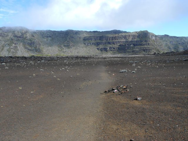 La randonnée débute au premier parking rencontré après avoir descendu les lacets du Pas des Sables. Dix mètres après la fin du goudron, trois ou quatre emplacements permettent de garer facilement le véhicule. En cherchant les endroits les plus plats, se diriger vers le rempart et s'en approcher au plus près (Photo 1). On remarque que, malgré certains pics rocheux, le terrain semble facile à traverser pour rejoindre le Sentier Mouton (Photo 2). Marcher en rive gauche d'une minuscule ravine à sec (Photo 1). On rencontre un peu plus loin un champ de "menhirs" constitué de morceaux d'orgues tombés de la falaise à gauche (Photo 5). Quelques herbes ou fleurs tentent de s'implanter dans ce sol pauvre. Un discret sentier fait son apparition (Photo 7 G). On peut le suivre ou se rapprocher du rempart pour rallonger un peu la boucle mais on le retrouve plus loin avant de couper le sentier venant de l'Oratoire Ste-Thérèse. Suivre la ravine une cinquantaine de mètres et prendre à gauche sur du sable pour suivre à nouveau le fond de la ravine. Avant d'arriver au cassé, remarquer à gauche une grotte et son foyer montrant qu'elle est connue et utilisée. Marcher sur le fond basaltique de la ravine égayé de quelques petits bassins remplis par la dernière pluie (Photo 6). La ravine cesse d'un seul coup et plonge vertigineusement dans le premier Cassé de la Rivière de l'Est (Photo 10). On aperçoit d'ailleurs le classique grand cassé dans le lointain, beaucoup plus connu puisque près d'un sentier officiel. Attention de ne pas s'approcher trop du bord où une glissade s'avèrerait fatale mais profiter des paysages grandioses sur la plaine verdoyante en dessous de nos pieds (Photo 12). On aperçoit très bien la Savane du Rond, les Piton Coco, Rouge ou de l'Îlet qui ne peuvent que motiver pour une descente future car on ne voit aucun obstacle pouvant décourager de s'y aventurer. Chercher, au plus près du cassé, le passage sur la lave entre les branles verts. La montée est insignifiante. Le basalte est remplacé par des gros gratons instables. Viser un gros monolithe d'une douzaine de mètres de haut en effectuant quelque zigzag pour le contourner par la droite (Photo 13). Poursuivre en visant cette fois le piton Haüy puis une dent de lave qui se repère très bien à sa forme pointue. La rejoindre et prendre un peu à droite pour atteindre un cratère qu'on contourne par la gauche (Photo 17). Le cheminement devient instinctif car le Demi-Piton et le Chisny sont très visibles devant. La traversée amène facilement au GRR2 qu'il suffit de suivre à plat jusqu'au pied du Demi-Piton (Photo 18). On quitte alors très vite ce sentier à une aspérité du sol pour traverser la plaine sableuse où tentent de s'installer des herbes et quelques fleurs (Photo 19). Le pied du Demi-Piton est encombré d'une haute et large coulée sombre. Viser le col que fait la pente du demi-Piton et la coulée où le cheminement est facile et la pente assez faible. Le but de la journée étant de marcher le plus à plat possible, repérer les roches esseulées nommées Gendarmes, les frôler et rejoindre la route (Photo 21). On ne peut pas manquer, en face, le discret sentier qui débute une remontée du Chisny. On le laisse très vite pour épouser au plus près la courbe de niveau qui mène droit vers un grand champ de bombes volcaniques toutes aussi grosses les une que les autres, projetées il y a 1000 ans par l'éruption du Piton Chisny (Photo 22). Entamer graduellement la descente vers la Plaine des Sables où on ne tarde pas à rencontrer le sentier descendant vers Grand Galet par Grand Pays (Photo 23). Suivre ce sentier et obliquer à droite pour une progression un peu moins plate que tout ce qui vient d'être fait mais sans aucun danger. La descente vers le cassé n'a rien d'obligatoire mais elle permet de se régaler de nouveaux panoramas sur Grand Pays, le Morne Langevin ou son cousin en face, le Piton du Rond de Langevin (Photo 24). Il faut alors reprendre en direction du Morne Langevin sur un terrain sableux comportant même parfois des dunes accumulées par les crues soudaines lors de fortes pluies. On se retrouve ainsi au pied du Morne Langevin, constitué d'innombrables orgues de basalte étalés en plusieurs couches infranchissables (Photo 26). Un écart est recommandé lorsque l'on aperçoit les traces rouges à 200 mètres sur la droite (Photo 25). Se rapprocher à nouveau du rempart pour entamer une longue "traversée du désert" sur un sol tout d'abord très souple où on a vite fait de remplir les chaussures de sable. Plus loin c'est un vrai plaisir de cheminer totalement à plat le long du morne et des amoncellements du sable tombé du rempart où tentent de pousser quelques fétuques ou fleurs jaunes (Photo 27). Après une longue courbe pour rester au plus près du mur, on se trouve nez à nez avec deux très jeunes tamarins qui ont réussi à pousser dans le sable (Photo 28). Peut-être trouverons-nous un petit bois ombragé dans quelques décennies ? Partout, des traces caractéristiques d'empreintes de lièvres et leurs crottes montrent qu'ils ne craignent pas la fraîcheur du lieu. Pour les voir, préférer l'aube ou le crépuscule. Contourner les roches au pied du Pas des Sables afin de rester à plat et retrouver la piste et le véhicule qu'on découvre recouvert d'une fine couche de poussière soulevée par les passages incessants de véhicules de touristes et randonneurs.