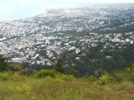 La randonnée débute au très connu Stade de la Redoute en longeant la Rivière Saint-Denis sur un sentier agréable aménagé le long de la route de la Montagne. Les fascines de goyavier ont tendance à un peu vieillir mais la balade est plaisante malgré le bruit des véhicules. Un sentier rencontré sur la gauche dirige vers un oratoire et sur les berges de la rivière pour un petit détour facultatif. Poursuivre sur la route au pont Vinh San jusqu'au carrefour qui enjambe la route de Saint-Paul. Le sentier des Rampes de la Montagne est impossible à manquer sur la droite. Des panneaux explicatifs sont installés au départ de la forte montée (Photo 1). On commence par un sentier un peu ombragé qui rejoint les quatre canons qui pointent sur une partie de la ville (Photo 2). On poursuit en frôlant un kiosque de pique-nique en bordure de route (Photo 3). Suivre ce sentier de bonne qualité mais bordé en revanche d'une végétation très pauvre et sans attrait (Photo 4). Il grimpe en pente douce alternant des portions plus fortes comportant plusieurs lacets et quelques vestiges pavées (Photo 5). Le sentier s'approche plusieurs fois de la route de la Montagne puis se rapproche d'une case caractéristique aperçue depuis le bas. Quand on aperçoit la clôture d'enceinte de la villa, laisser le sentier partant sur la gauche vers la route et plonger vers le Bras Gentil par de nouveaux lacets sur un sol caillouteux. De l'autre côté de la ravine à sec, la pente constituée de courts lacets est rude mais courte. Le sentier se termine à la muraille qui sépare du Chemin de la Vigie. Rejoindre cette route, profiter du panorama sur la ville et poursuivre en marchant en direction de la Montagne. Une piste part sur la droite et rejoint le stade de la Vigie et plus loin, le Chemin des Prêles. Suivre cette route sur 250 mètres et partir sur la gauche sur un chemin pavé ombragé sous les filaos et bien évidemment dans les lianes papillon (Photo 5). Ce vestige du Chemin Crémont permet de rejoindre sans circulation la RD 41. Les pavés encore en place sont bien conservés (Photo 7). Dans le virage partant sur la gauche, emprunter le Chemin du Piton Trésor et le suivre sur 500 mètres avant de bifurquer à nouveau sur la gauche sur un sentier discret partant près des antennes relais. On marche facilement près de touffes de bambous, dans les chocas et sous les arbres. Le sol est recouvert d'une concentration exceptionnelle de liane papillon (Photo 8). Cette peste peut envahir des hectares en quelques années ; c'est pourquoi ce sentier doit absolument être pratiqué, faute de le voir tomber dans l'oubli (Photo 9). Des touffes d'herbe sont aussi inquiétantes car, si elles ne sont pas enlevées ou tondues, elles peuvent boucher le chemin en deux ans (Photo 10). Le parcours longe plusieurs fois des grillages (Photo 12). La végétation est irrégulière et parfois un peu envahissante mais on ne perd jamais le sentier (Photo 13). Il faut à un moment franchir quelques rochers mais sans danger, sauf par temps de pluie (Photo 14). De grosses touffes de bambous comportent des petites sentes utilisées par certains élèves pour fumer en cachette (Photo 16). Une fois passé le lycée qu'on aperçoit sur la droite, longer une petite falaise de tuf puis poursuivre dans les fougères, herbes et arbustes ras vers une zone rocheuse (Photo 17). Effectuer une halte pour profiter de splendides points de vue sur le chef-lieu qu'on voit en totalité jusqu'à Sainte-Marie. La zone est particulièrement rocheuse, créant plusieurs promontoires où il est facile de s'asseoir pour admirer le paysage (Photo 18). Le sentier se poursuit en forte descente vers la vallée qu'on aperçoit un peu plus loin. Un passage plus vertical que les autres est facilité par un long câble qui évitera la glissade par temps humide (Photo 19). Le terrain s'aplanit mais la végétation n'est pas domestiquée (Photo 20). On suit pourtant sans difficulté le sentier qui remonte petit à petit sous les filaos ou jamrosas sur une portion assez rocheuse (Photo 21). La montée est parfois rude, parfois glissante sur les aiguilles des filaos, les feuilles tombées au sol ou sur la terre humide (Photo 22). On ne tarde pas à rencontrer des portions du sentier venant de Saint-Denis, en très bon état en raison des passages fréquents. Deux solutions sont alors possibles. Rejoindre l'aire de loisirs du Colorado par le sentier puis la piste, ou prendre à gauche pour redescendre vers Saint-Denis. L'aire de loisirs ne se décrit plus et les chemins qui y mènent sont larges, très fréquentés et parfois glissants. La descente s'effectue sur un sentier de bonne qualité comportant parties glissantes, marches en bois, roches parfois surchauffées. Les points de vue sur Saint-Denis sont de plus en plus nombreux et on peut voir le lycée technique et ainsi mieux deviner le sentier (Photo 24). Profiter des derniers points de vue sur la vallée de la Rivière Saint-Denis et se lancer dans la descente vers la Redoute (Photo 25). Le sentier comporte quelques lacets et plonge parfois assez fortement sur des marches ou les roches qui dépassent (Photo 26). On a vite fait de rejoindre les eucalyptus qui dominent l'hôpital de Bellepierre (Photo 27) et lacets de la route de la Montagne qu'on peut utiliser en partant sur la gauche, en descente. Mais un sentier escarpé permet de dévaler la pente beaucoup plus rapidement vers le pont. Passer sous le pont et longer le sentier paysager utilisé au début de la boucle pour retrouver le véhicule (Photo 28).