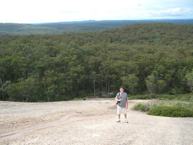 La randonnée débute au parking, facile à trouver grâce aux indications toujours claires dans ce pays où tout est fait pour le tourisme et la randonnée (Photo 1). Profiter du voyage pour repérer de tous côtés les milliers de grosses billes de granite qui se sont amoncelées dans les prairies couvertes d'eucalyptus (Photo 2). En raison des clôtures qui gardent le bétail, il n'est pas toujours possible de s'en approcher. En revanche, en d'autres endroits, ces amoncèlements se retrouvent au plus proche de la route. On peut ainsi s'arrêter et profiter de quelques curiosités comme ce rocher qui semble pouvoir basculer au moindre souffle mais qui git ici depuis des millénaires (Photo 4). Comme partout, la faune est abondante et il ne faut pas faire trop d'efforts pour dégoter un kangourou (Photo 5). Les immenses prairies où l'on retrouve ces blocs agglutinés bordent la petite route (Photo 8). Une fois au parking et en fonction du temps dont on dispose, il est possible d'effectuer plusieurs trajets. Le premier mène au roc et l'autre effectue une boucle dans le bush au sud de Bald Rock. On traverse 500 mètres de forêt sur un beau sentier avant de se retrouver au pied du monolithe où l'on retrouve bien sûr ces entassements de granite (Photo 9). La montée peut débuter en suivant les balises sur le sol granitique recouvert de quelques eucalyptus (Photo 10). Des écarts sont possibles pour découvrir l'envers du décor et partir à la recherche d'une faune toujours présente (Photo 11). Certains passages sont étroits entre les blocs (Photo 12). Il n'y a plus d'ombre et le soleil peut être très fort ; ne pas oublier d'eau. Une fois les arbres et blocs disparus, la montée est pénible mais on peut passer où on veut pour atteindre le sommet avec le cœur au maximum ; le mieux est de prendre son temps et souffler un peu pour être en forme au sommet (Photo 14). Une fois là-haut, on n'est qu'à 200 m au-dessus de la forêt mais comme l'Australie est le pays le plus plat du monde, le regard porte à des kilomètres à la ronde au-dessus des forêts d'eucalyptus (Photo 15). De la partie la plus haute, prendre tout son temps pour apprécier le paysage (Photo 16). Certains n'hésitent pas à venir méditer, les yeux fixés sur la forêt ou les autres inselbergs ou monadnocks Relief isolé qui domine un espace en général plat. Relief résiduel rocheux en cours de destruction par l'érosion qui dépassent au loin (Photo 17). On peut ensuite passer n'importe où sur le sommet et se promener dans le petit bois qui a réussi à coloniser une partie du sommet (Photo 18). On se demande d'ailleurs comment ils ont fait pour atterrir là et trouver suffisamment de terre pour survivre. Les panoramas les plus impressionnants se rencontrent lorsqu'on longe le partie la plus haute (Photo 20). On remarque un peu partout des rochers posés ça et là en équilibre qui semble incertain (Photo 21). Seuls le vent et la pluie peuvent les avoir arrondis de la sorte depuis les 220 millions d'années qui ont suivi l'intrusion granitique créée par une poussée de magma (Photo 22). On a l'impression, avec la pente qu'il suffira de les pousser à peine pour qu'ils dévalent la pente vers la forêt (Photo 23). Tous les essais restent fort heureusement infructueux ! Après une plus ou moins longue visite des lieux, il est possible de redescendre par la forte pente du départ ou d'emprunter celle, plus faible, qu'on remarque aux taches de peinture au sol (Photo 25). Contrairement à Granite Gorge, les Wallabies ne semblent pas coloniser le rocher car aucune crotte ne vient trahir leur présence. En revanche on en voit autant qu'on veut dans la forêt d'eucalyptus en repartant ou en se promenant sous les arbres. Faute de kangourous, on peut se rabattre sur les reptiles en se méfiant tout de même de la présence éventuelle de serpents dont on ne sait pas toujours s'ils sont dangereux. Les lézards à langue bleue sont particulièrement nombreux dans les roches au pied du roc et dans les rochers le long de la route (Photo 27).